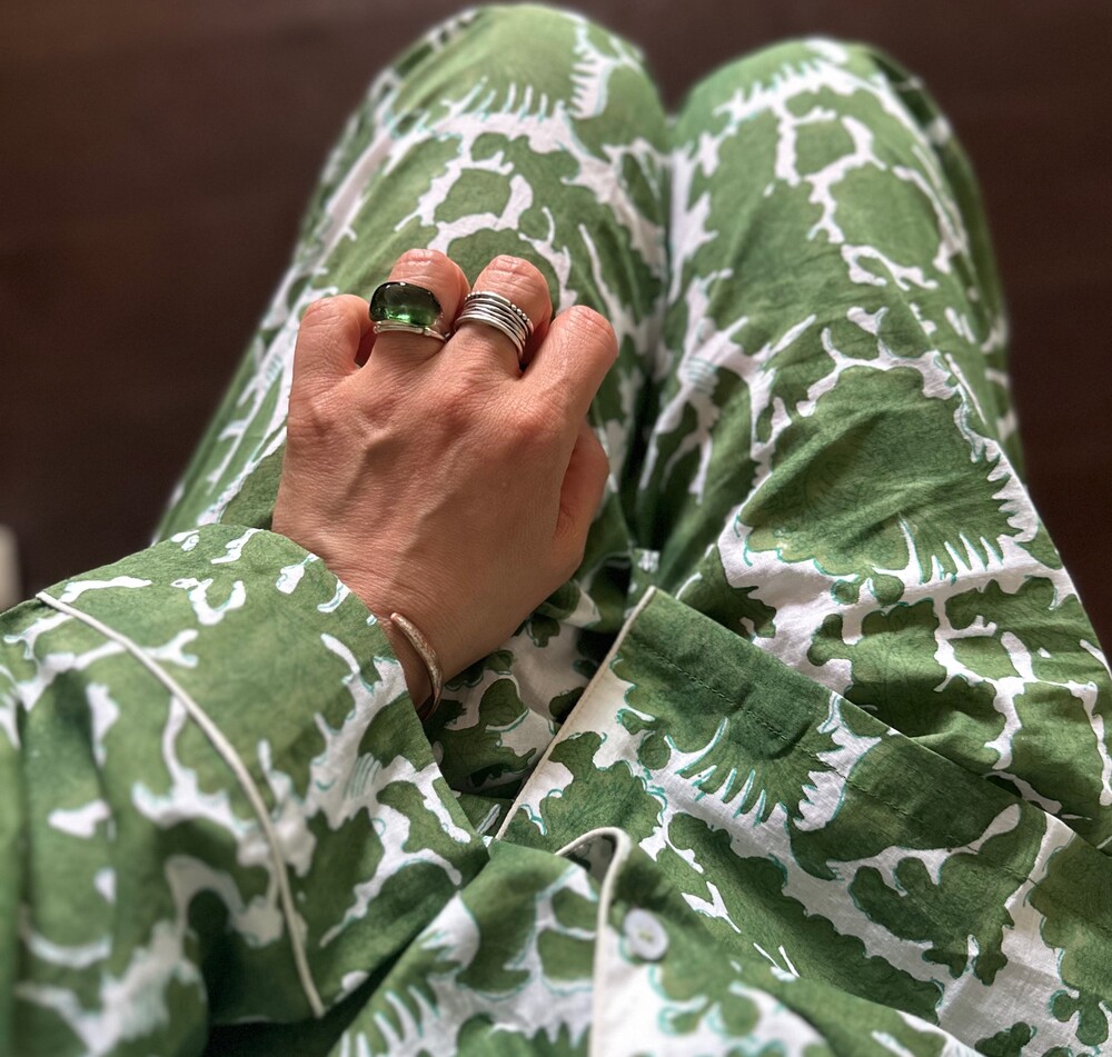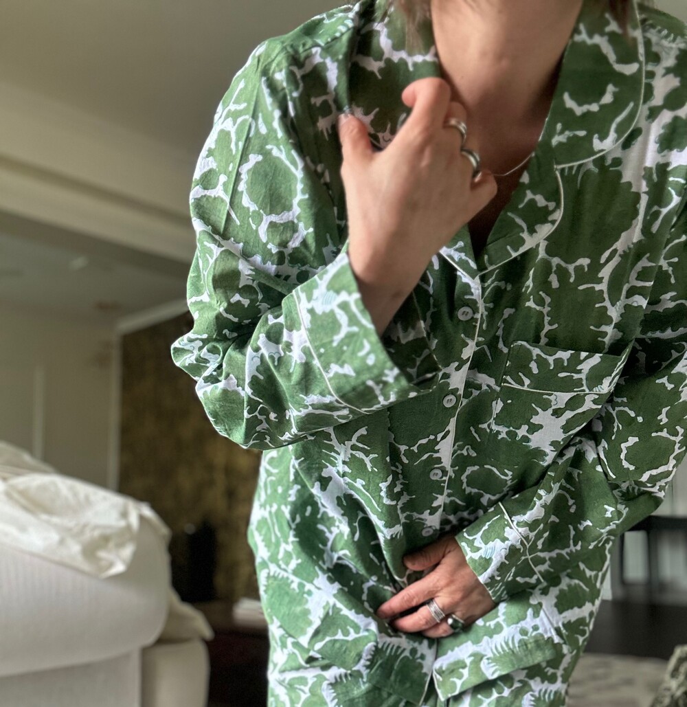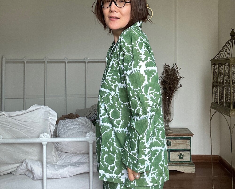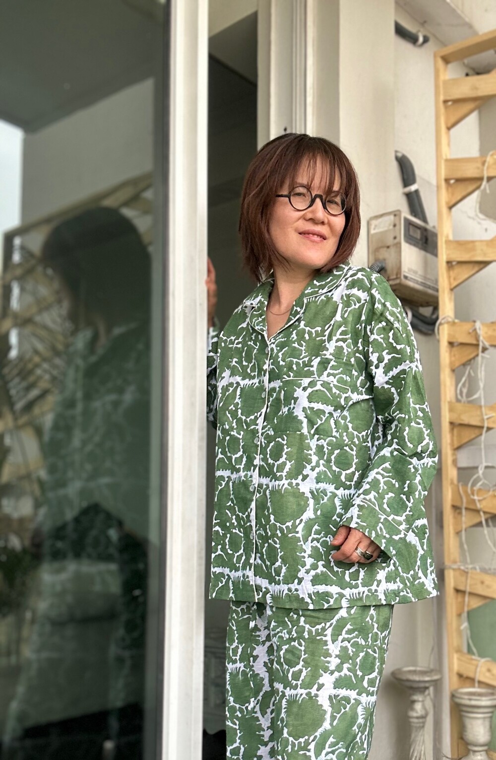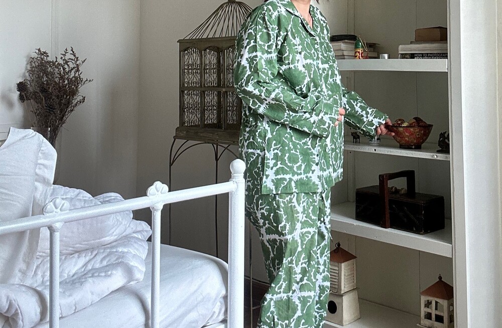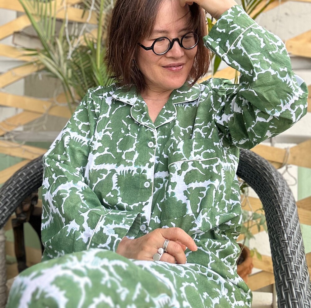 인도일 첨 시작할때부터 오년동안 꾸준히 만든 그린컬러에요. 청화백자의 어떤문양을 보고 디자인했는데 컬러는 그린으로 했어요,새와 나무와 여러그림들을 실루앳으로 표현한거에요.좋은면에 흔하지않은 컬러로 만들었고 사실 잠옷이 컬러 1도일때 참 가볍고 좋ㅇ긴해요. 진심 주인장 추천제품이에요. 오월의 신록예찬을, 이걸 입고도 예찬해주세요❤️제가 말리고 컬러 정하고 정말 정성스럽게 만들었어요.인류최초의 프린팅,우드블럭 프린팅 하나를 소장한다면,요걸로❤️ 정말 에어컨에서도 짱,두가지 사이즈로 진행되요 저는 보통 55-66입으니 미듐으로 가슴둘레 120이상이신분들은 라지로❤️
