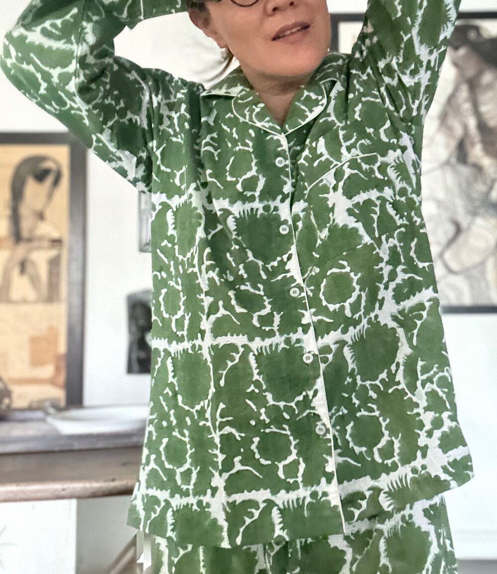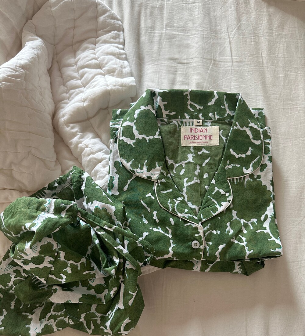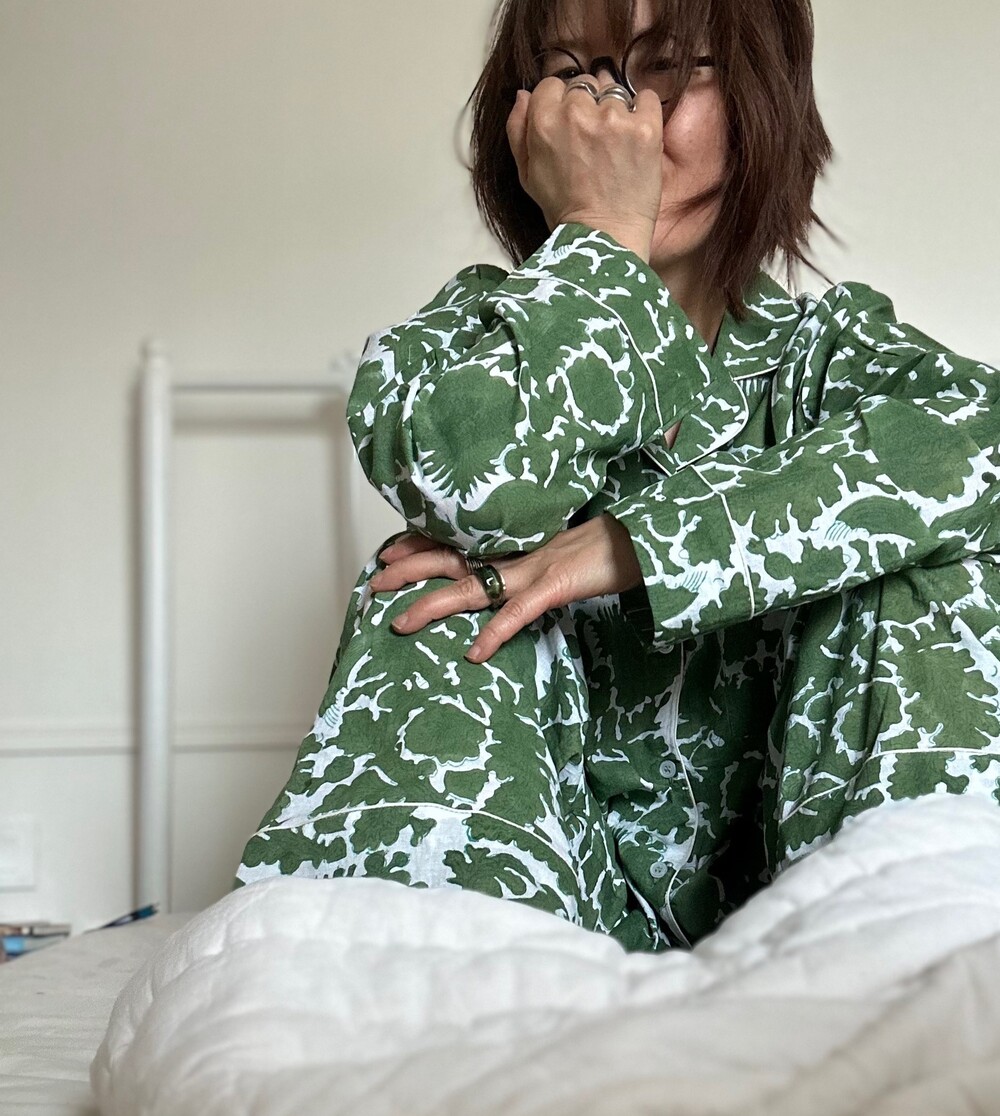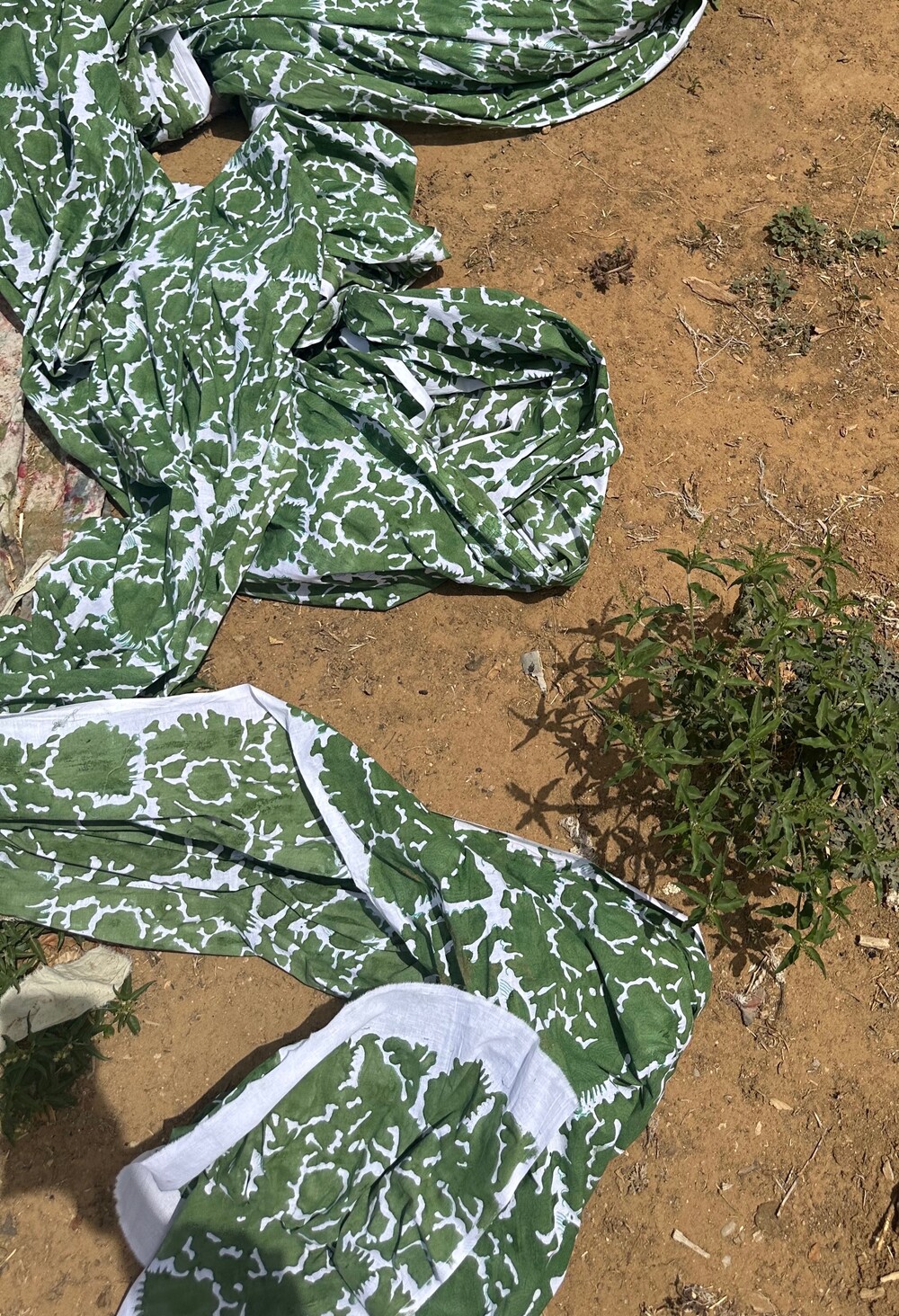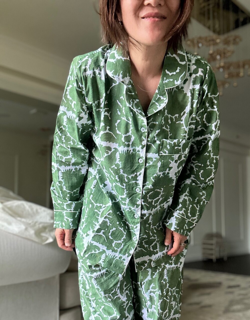 인도일 첨 시작할때부터 오년동안 꾸준히 만든 그린컬러에요. 청화백자의 어떤문양을 보고 디자인했는데 컬러는 그린으로 했어요,새와 나무와 여러그림들을 실루앳으로 표현한거에요.좋은면에 흔하지않은 컬러로 만들었고 사실 잠옷이 컬러 1도일때 참 가볍고 좋ㅇ긴해요. 진심 주인장 추천제품이에요. 오월의 신록예찬을, 이걸 입고도 예찬해주세요❤️제가 말리고 컬러 정하고 정말 정성스럽게 만들었어요.인류최초의 프린팅,우드블럭 프린팅 하나를 소장한다면,요걸로❤️ 정말 에어컨에서도 짱,두가지 사이즈로 진행되요 저는 보통 55-66입으니 미듐으로 가슴둘레 120이상이신분들은 라지로❤️