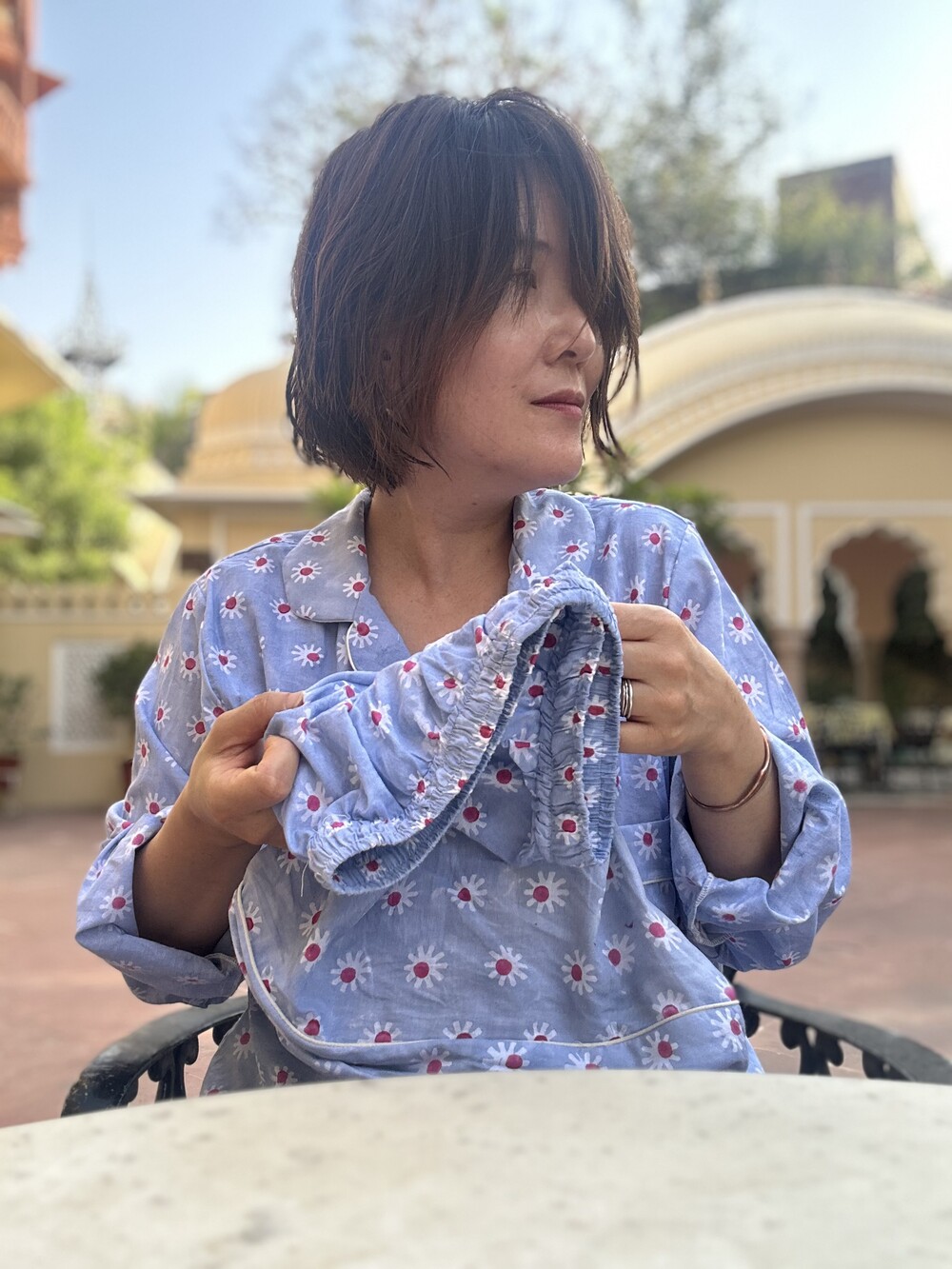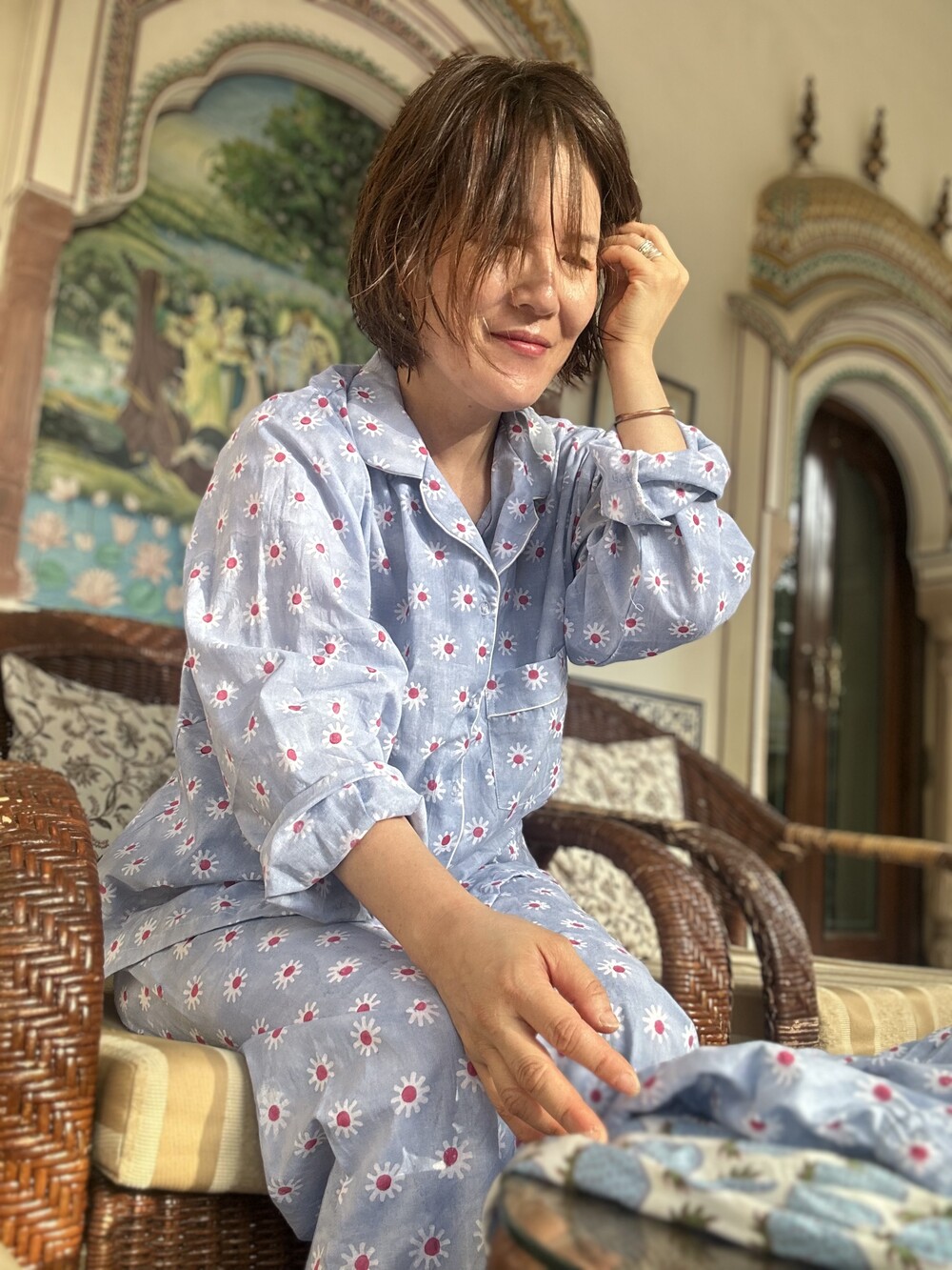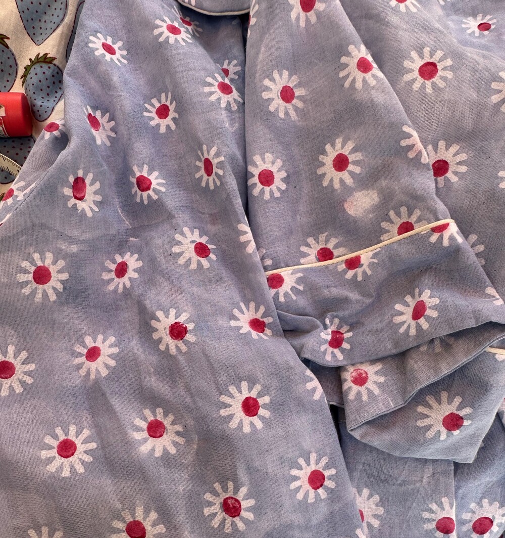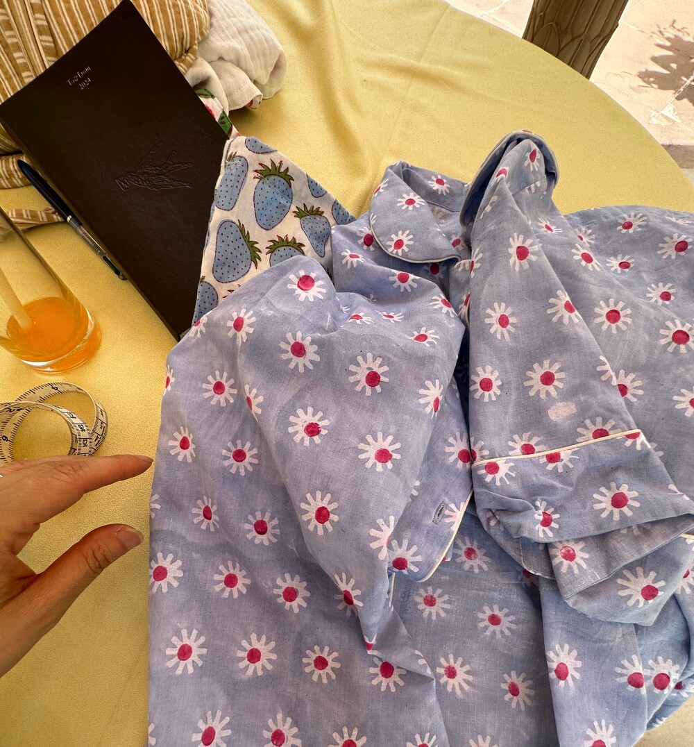 if only condition if rain or sand storm so without electricity otherwise all things possible❤️의 나라 인도에서 만든 파란딸기와 대이지 꽃의 잠옷이에요 .모두 저의 그림으로 제작된 인도로간 빠리지엔 패브릭입니다. 숏은 바지기장 40이에요. 롱기장은 95이고 밑위길이는 32정도로 편안한 디자인이에요.가슴둘레 55,66은 미듐으로 그 이상은 라지로 주문해주심되요❤️ 최대한 부지런히 진행할께요.원단준비 되어있고 인도에서 유월말 발송예정으로 진행합니다.전시준비로 6.12까지만 오더후 솔드아웃예정입니다😍