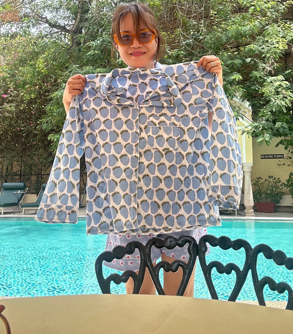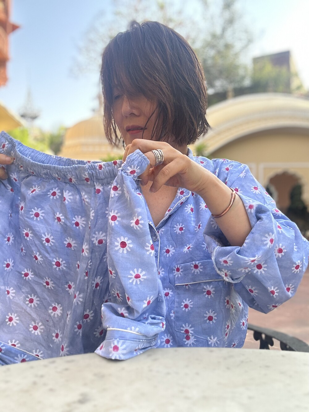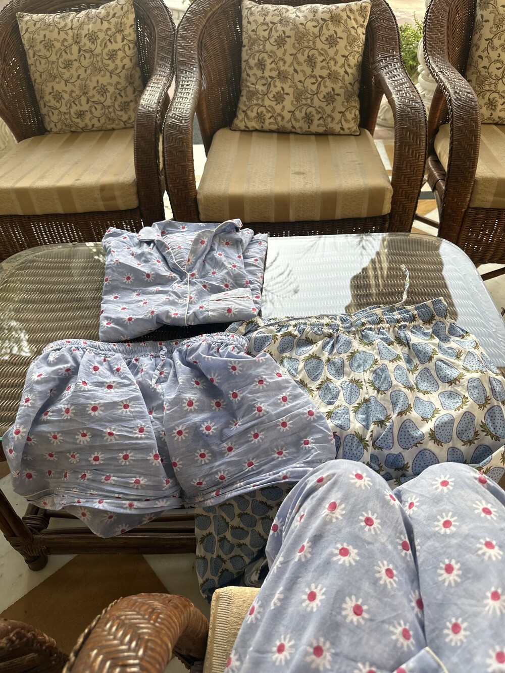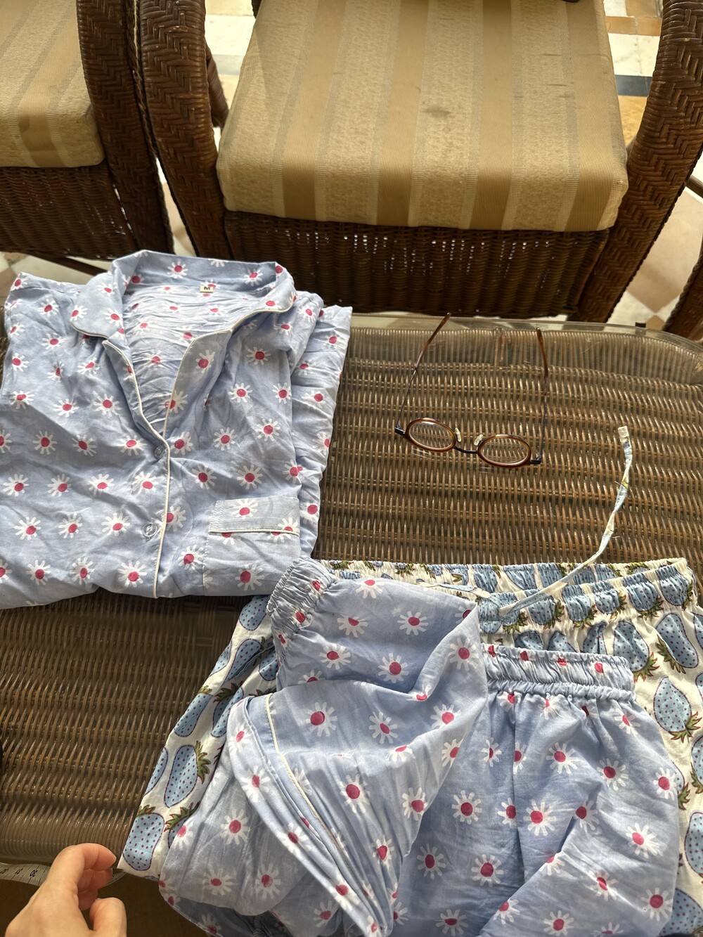 if only condition if rain or sand storm so without electricity otherwise all things possible❤️의 나라 인도에서 만든 파란딸기와 대이지 꽃의 잠옷이에요 .모두 저의 그림으로 제작된 인도로간 빠리지엔 패브릭입니다. 숏은 바지기장 40이에요. 롱기장은 95이고 밑위길이는 32정도로 편안한 디자인이에요.가슴둘레 55,66은 미듐으로 그 이상은 라지로 주문해주심되요❤️ 최대한 부지런히 진행할께요.원단준비 되어있고 인도에서 유월말 발송예정으로 진행합니다.전시준비로 6.12까지만 오더후 솔드아웃예정입니다😍