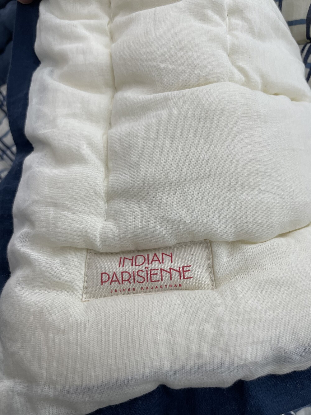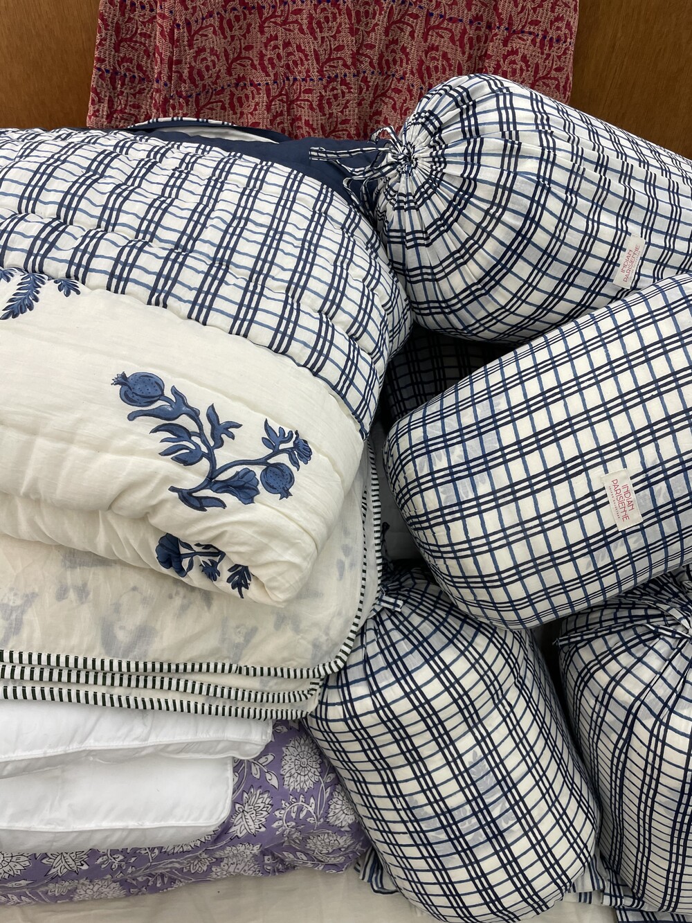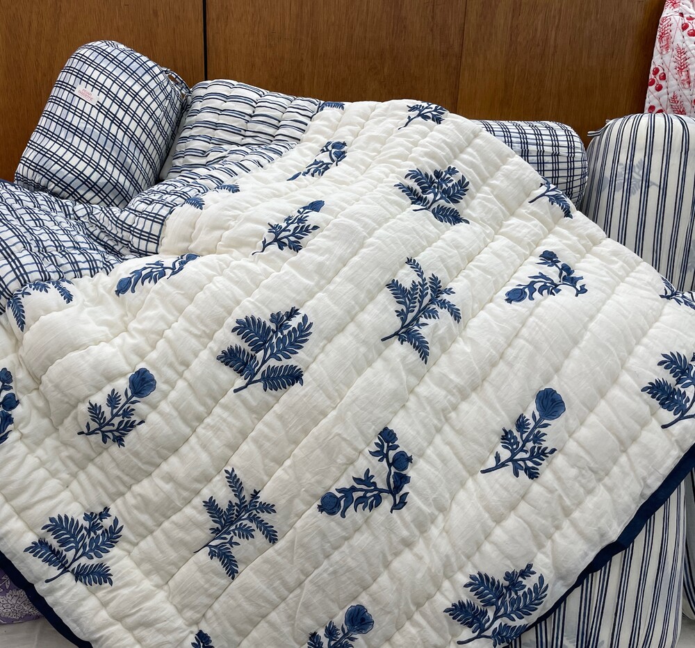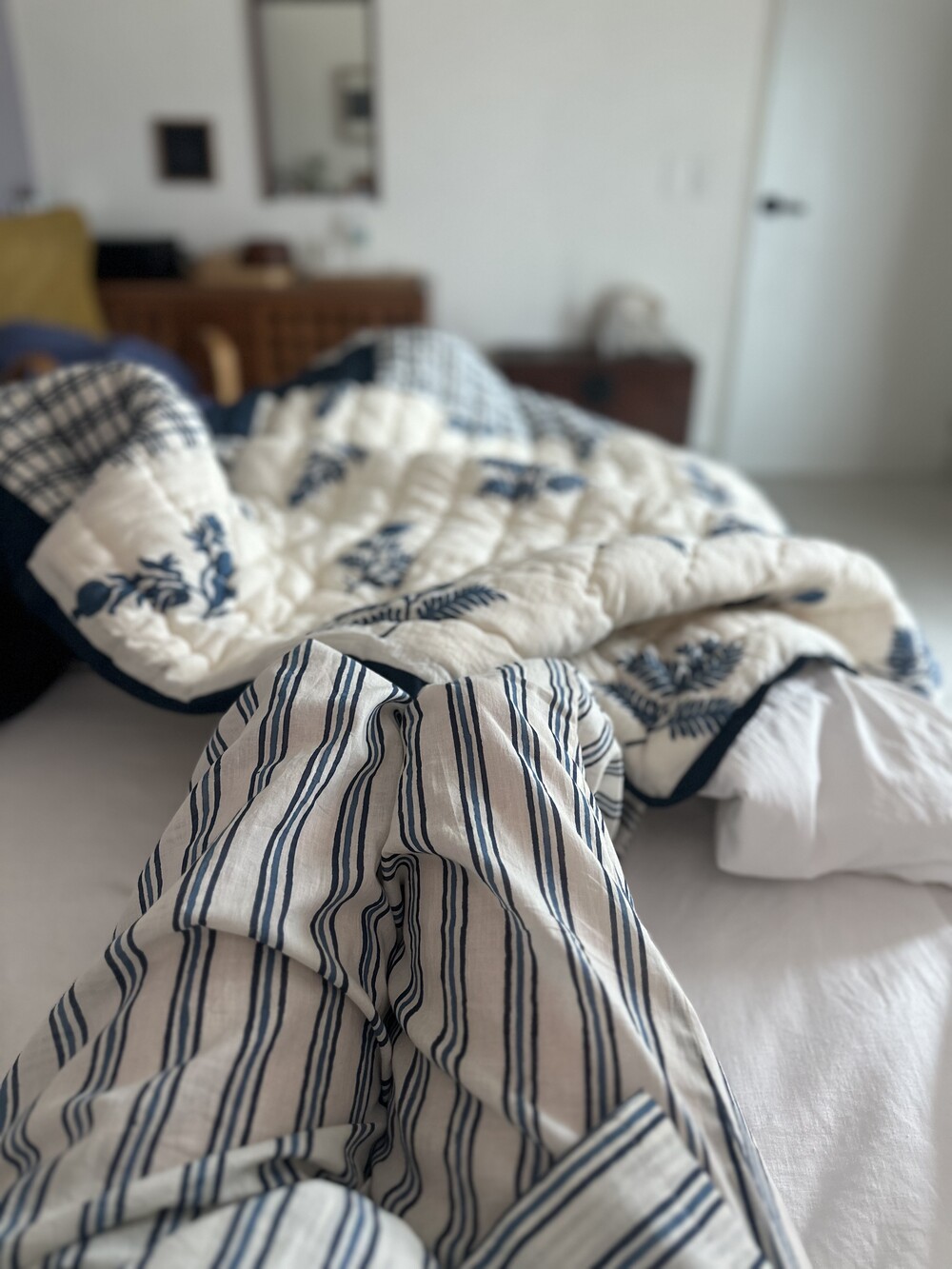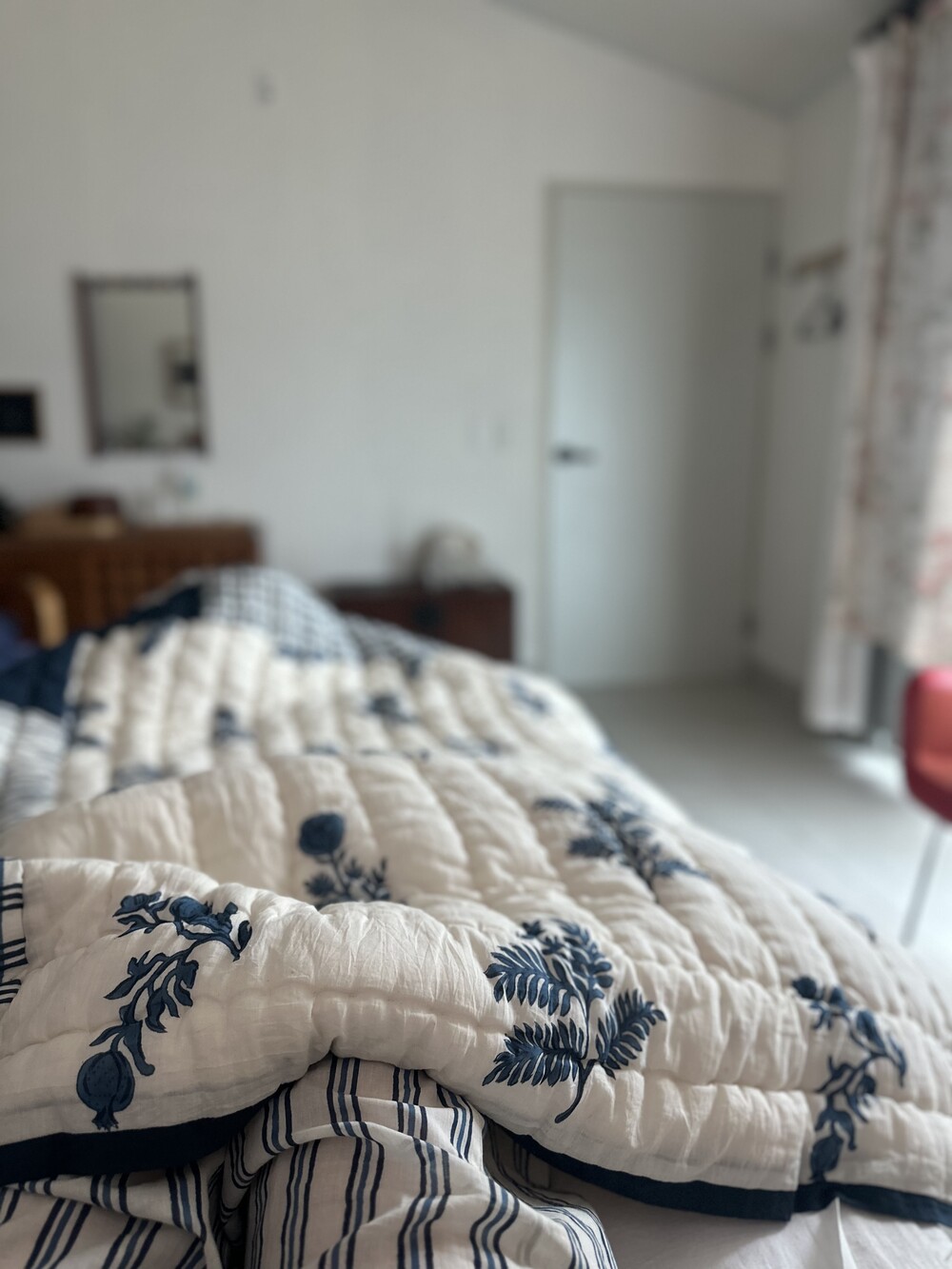 150*200 목화솜이불입니다. 웨스트 뱅골에서 수작업직기로 짠 면으로 스크린블럭을 이용한 인디고 염의 프린팅으로 인디고 톤의 컬러로 패치워크가 된 이불이에요.