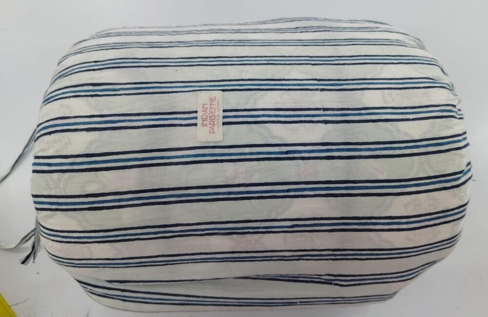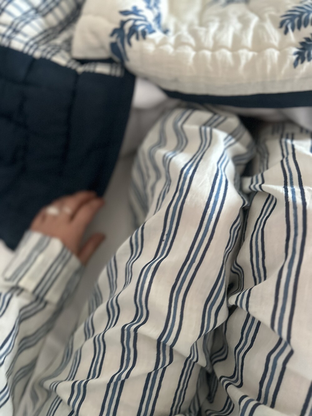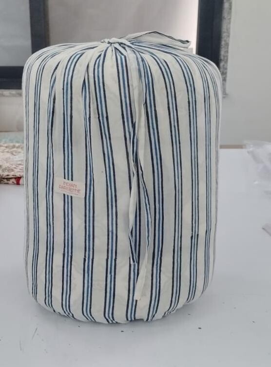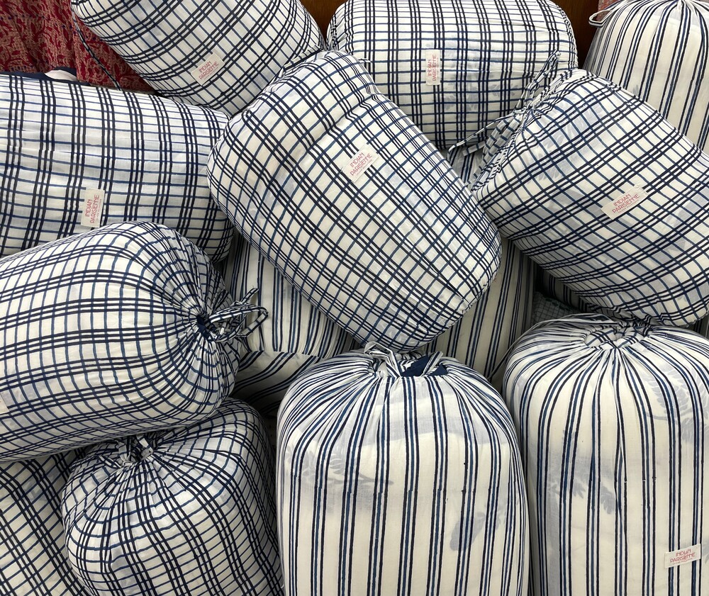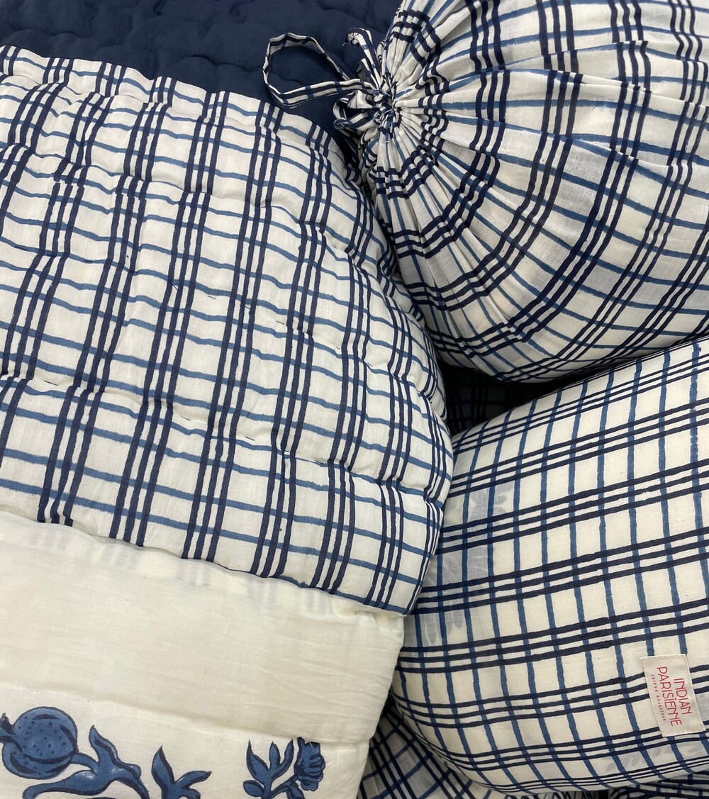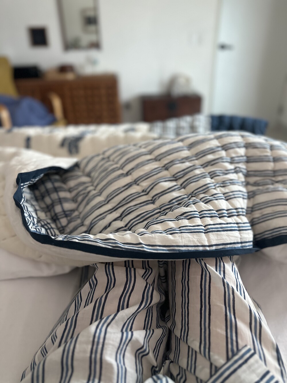 150*200 목화솜이불입니다. 웨스트 뱅골에서 수작업직기로 짠 면으로 스크린블럭을 이용한 인디고 염의 프린팅으로 인디고 톤의 컬러로 패치워크가 된 이불이에요.