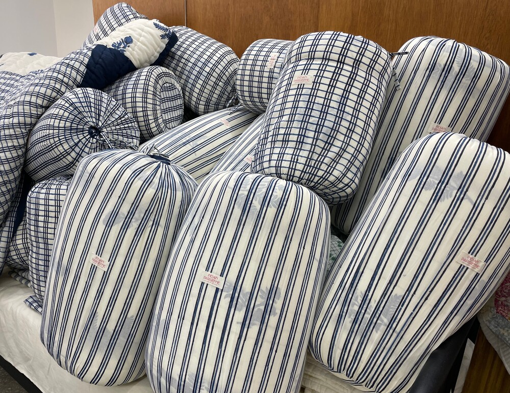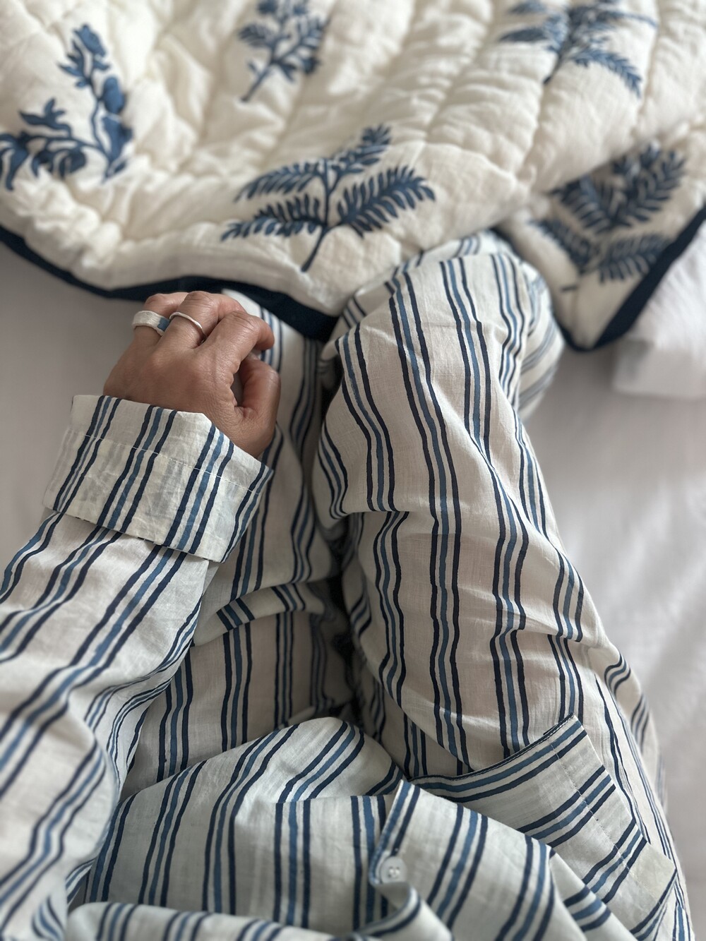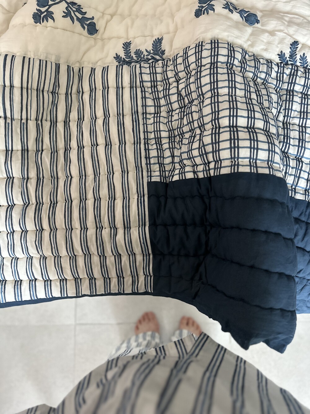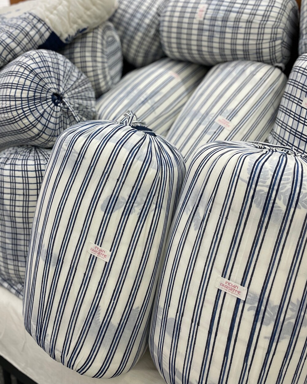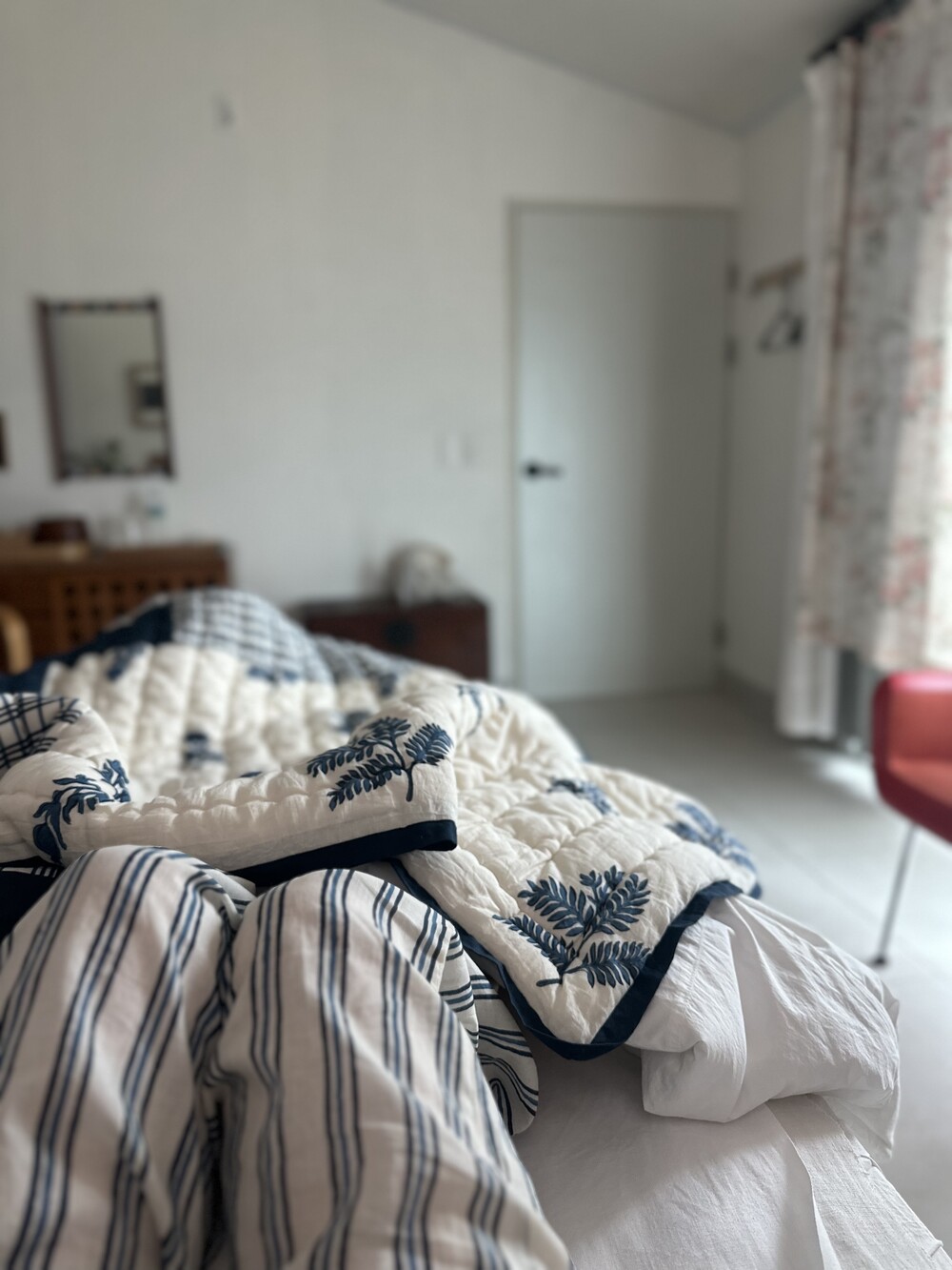150*200 목화솜이불입니다. 웨스트 뱅골에서 수작업직기로 짠 면으로 스크린블럭을 이용한 인디고 염의 프린팅으로 인디고 톤의 컬러로 패치워크가 된 이불이에요.