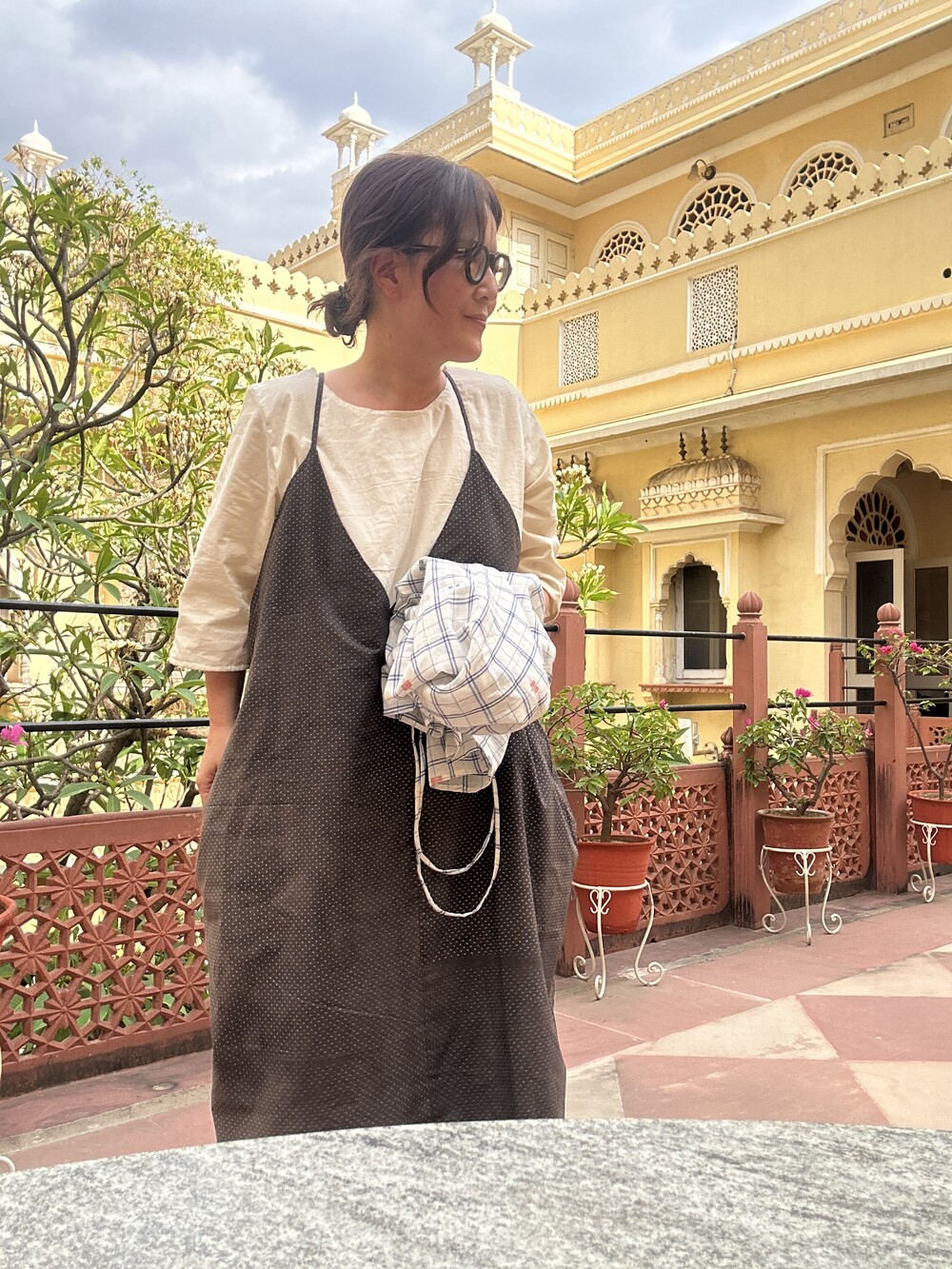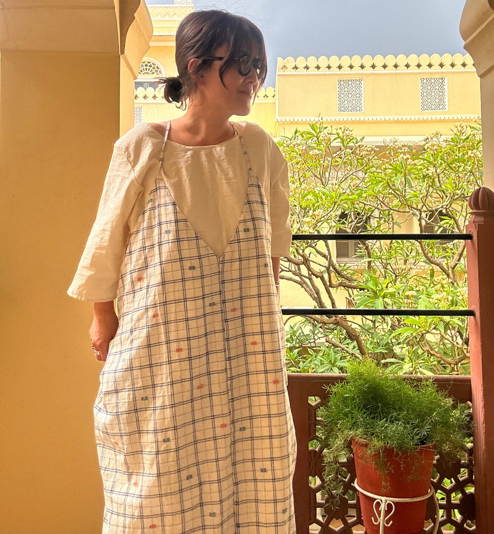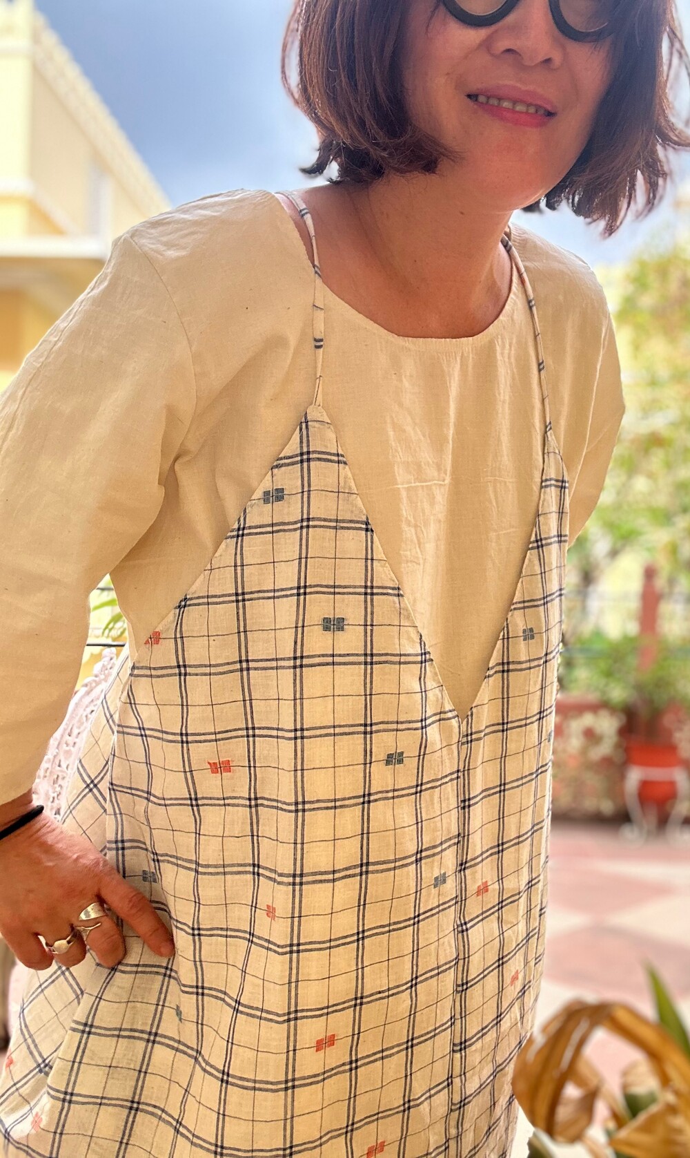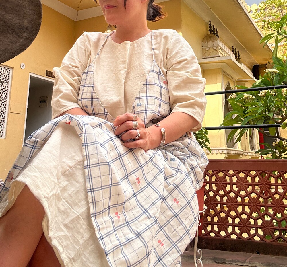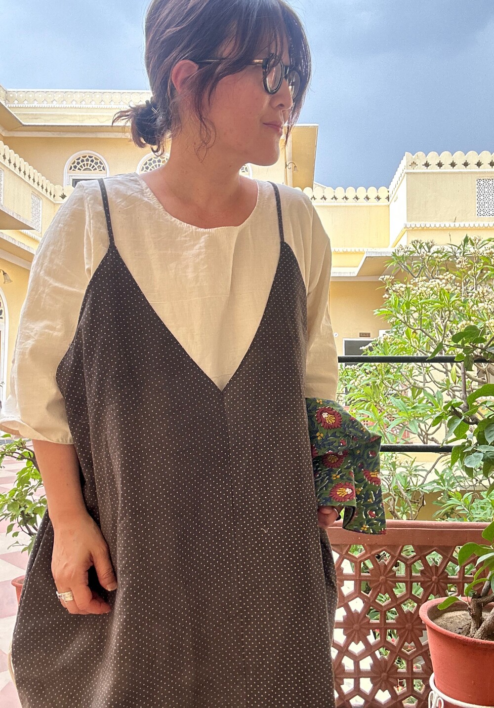 109센티미터 기장의 드레스에요,청바지와 티셔츠 입어도 예쁘고 이렇게 원피스 위에 겹쳐도 예뻐요. 준비된 원단으로만 작업가능해요.도트는 머드 프린팅이고 기하학은 직기로 짠 면이에요. 5.15까지 주문가능하고 오월말부터 인도에서 발송되니 단순변심 교환 환불 힘들어요.신중구매해주세요.