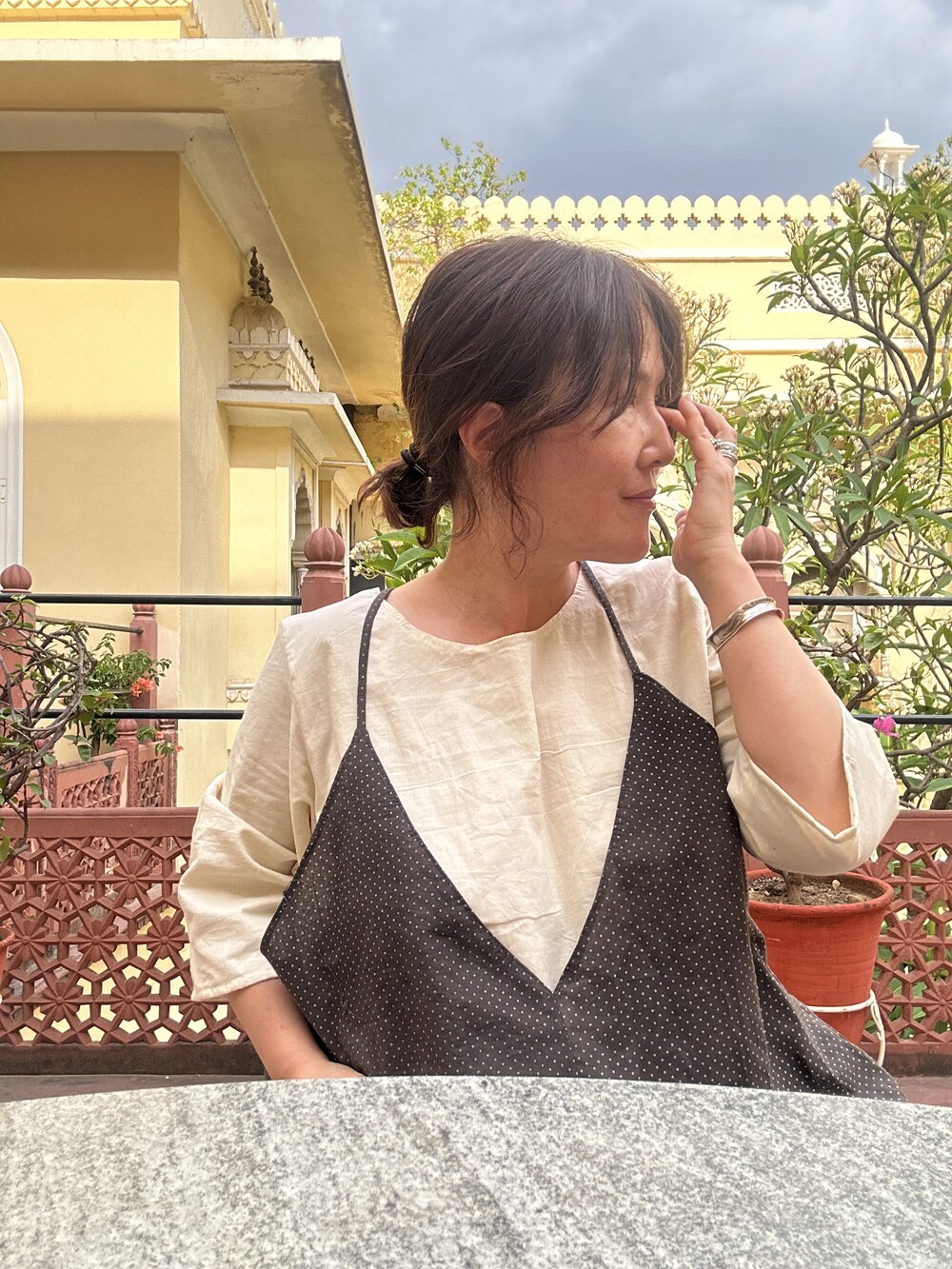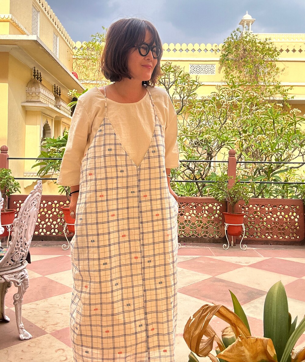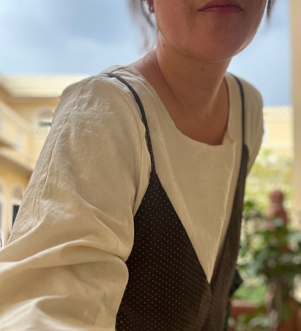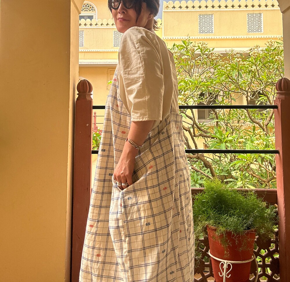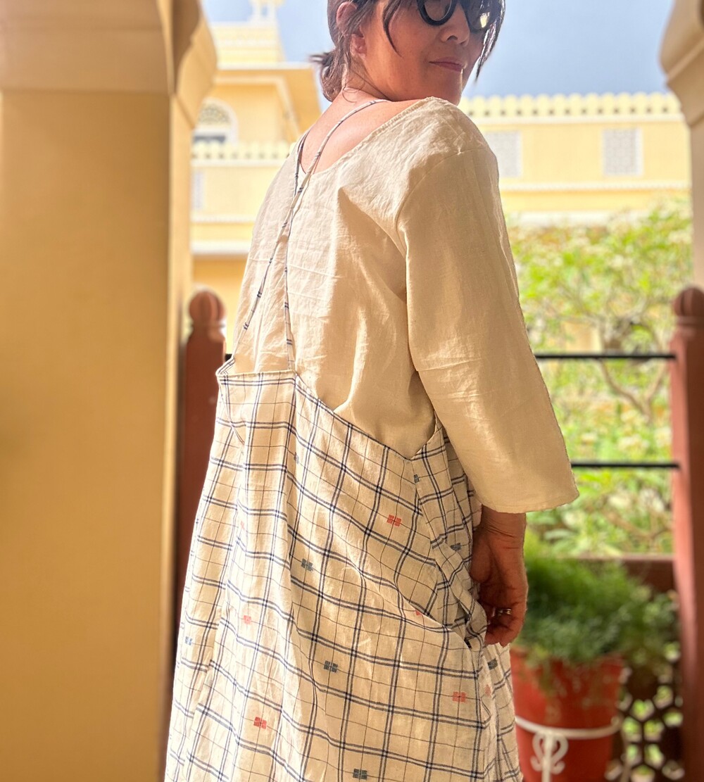 109센티미터 기장의 드레스에요,청바지와 티셔츠 입어도 예쁘고 이렇게 원피스 위에 겹쳐도 예뻐요. 준비된 원단으로만 작업가능해요.도트는 머드 프린팅이고 기하학은 직기로 짠 면이에요. 5.15까지 주문가능하고 오월말부터 인도에서 발송되니 단순변심 교환 환불 힘들어요.신중구매해주세요.