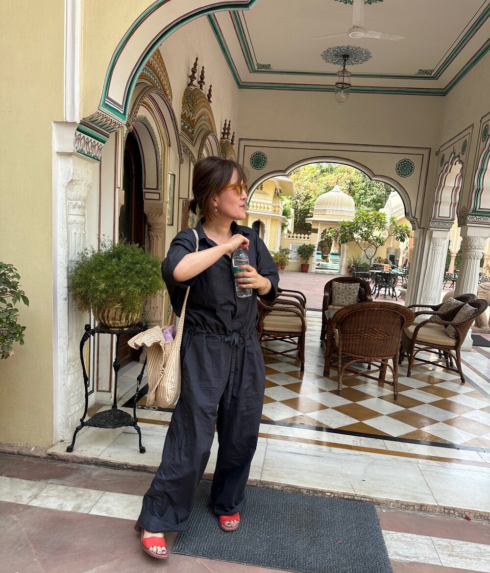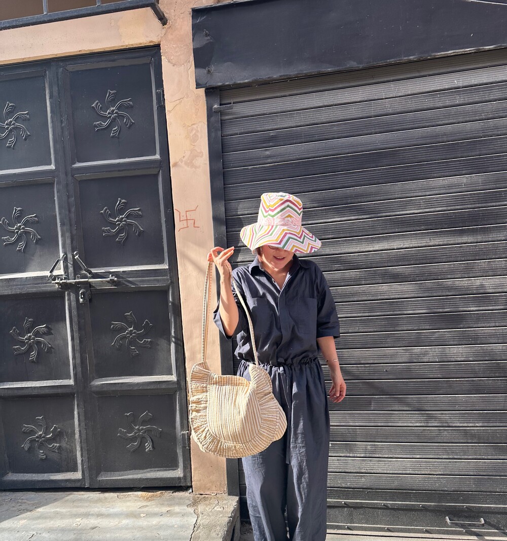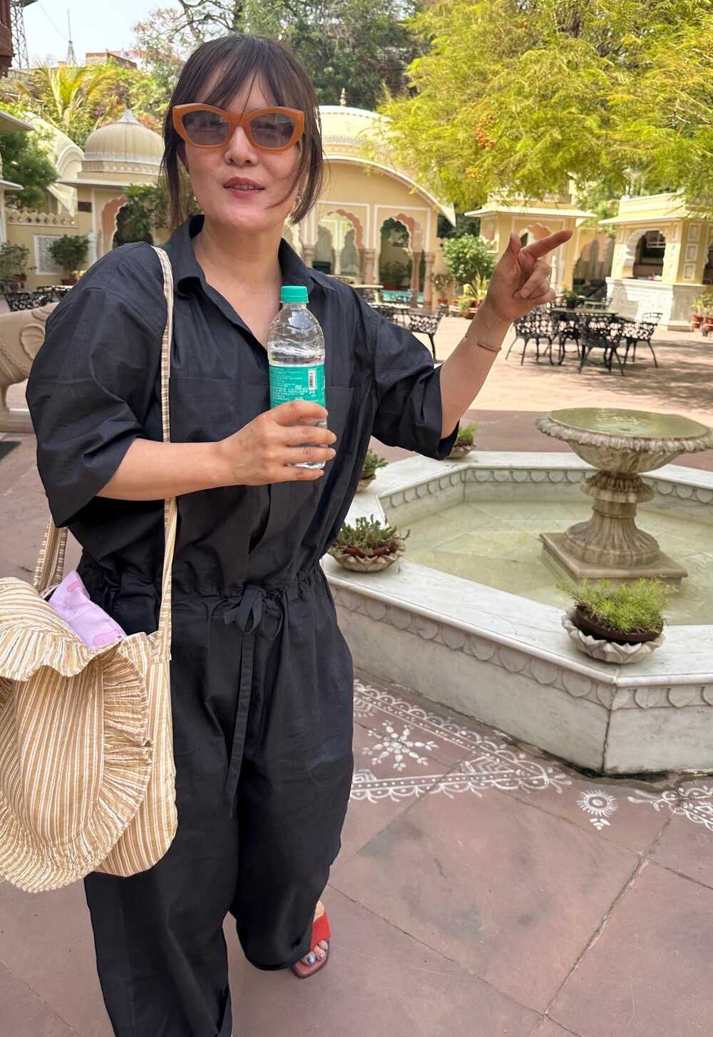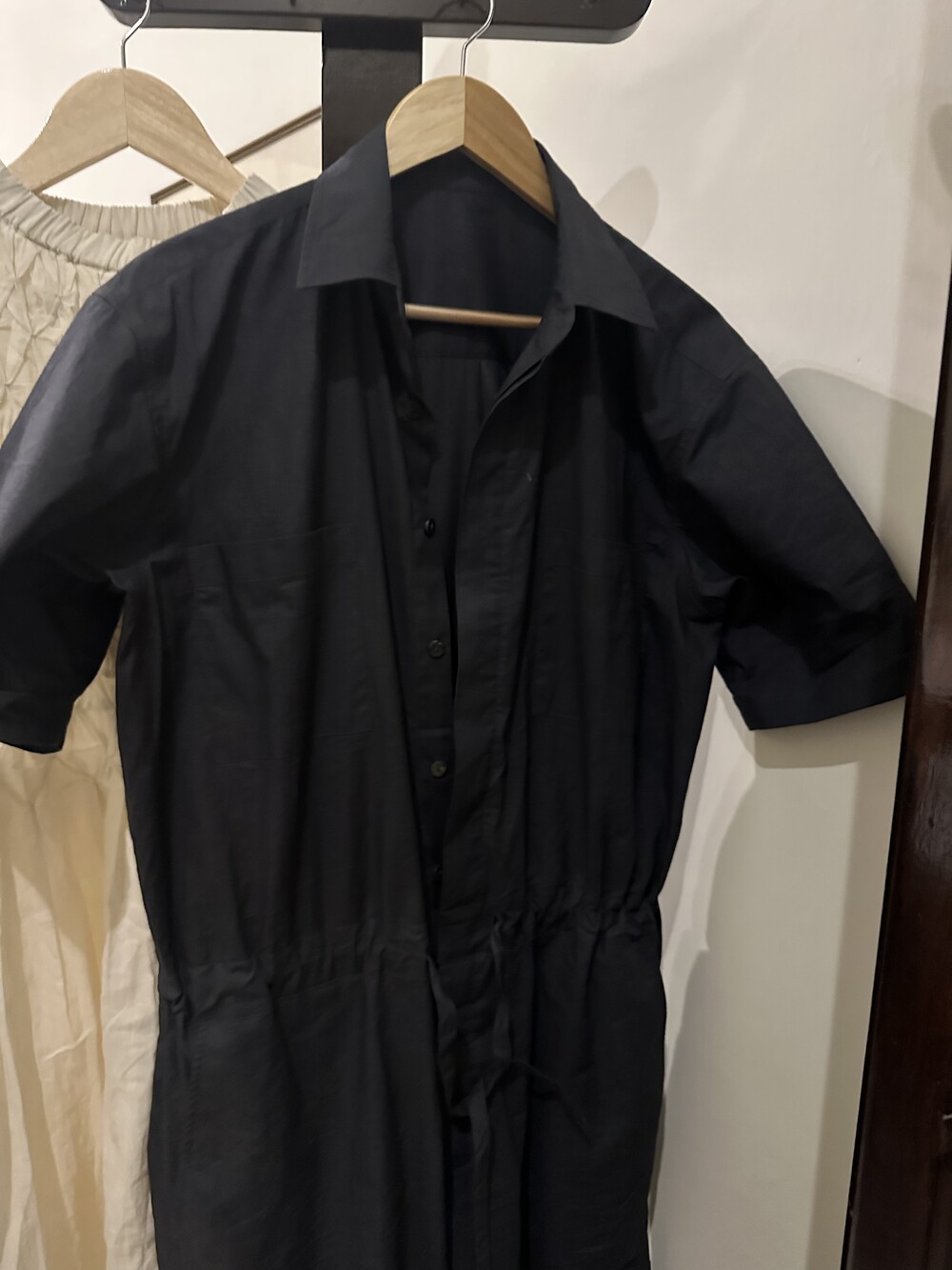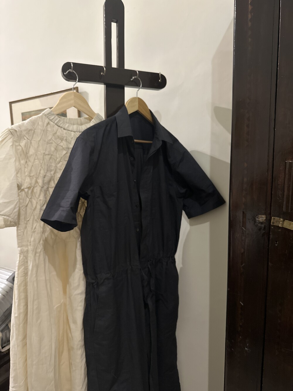 밑위길이 37정도로 엄청 넉넉하고 가슴반픔이 59인 박시한 포플린 소재의 점프수트에요.포플린생지를 염색했고 원단소진시까지만 주문가능한 제품이에요.