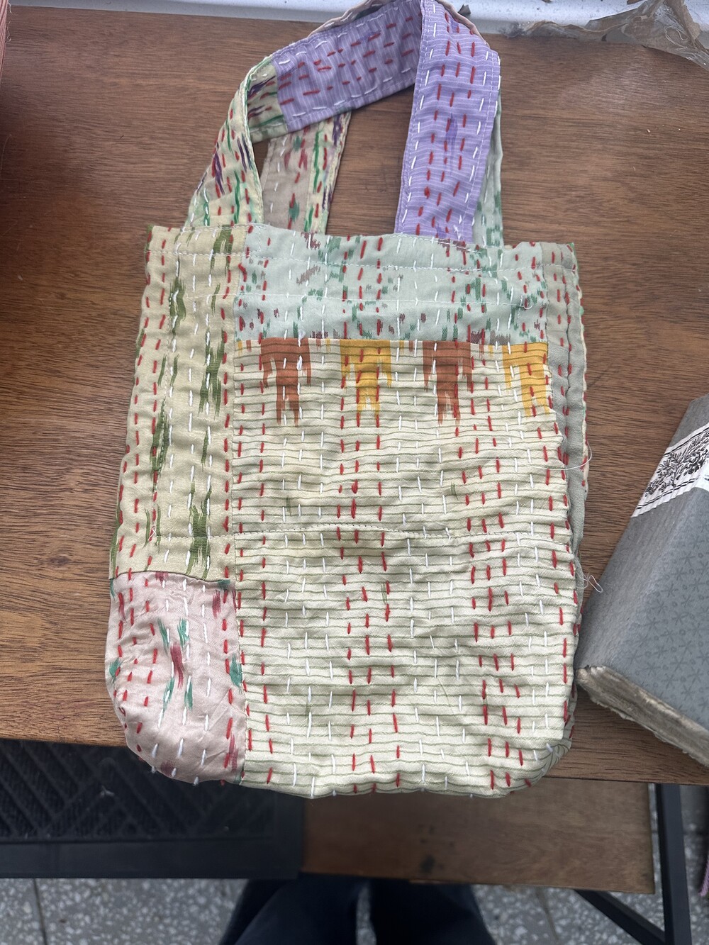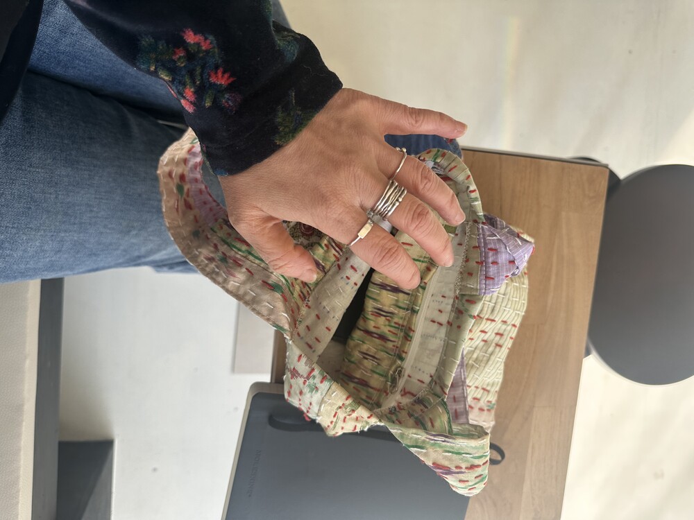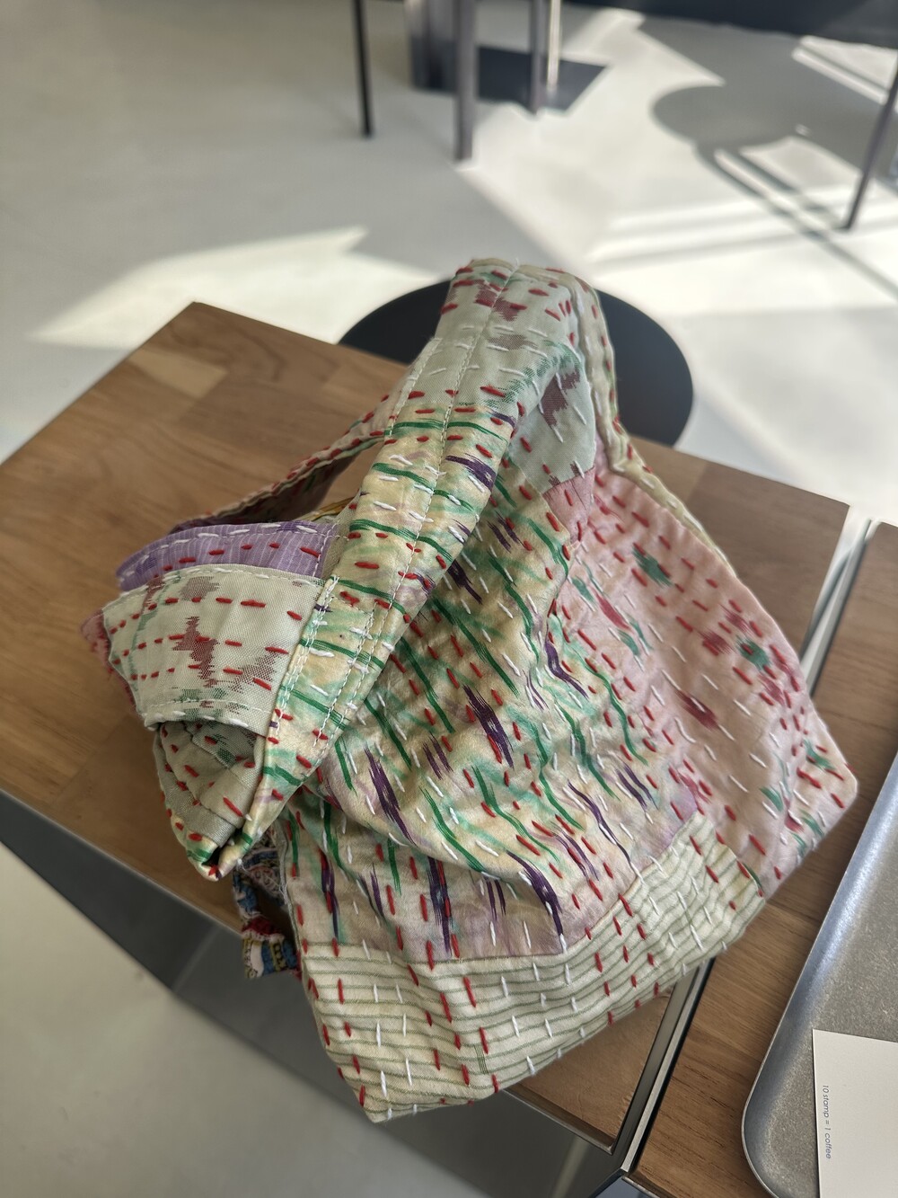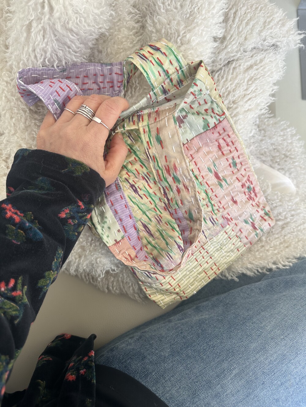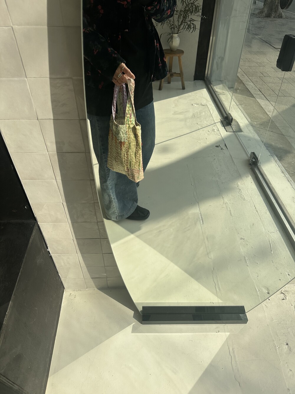 가로 22 세로 26정도 사이즈의 손스티치 실크(안감면)가방이에요.안주머니도 있어서 뭐가 은근 많이 들어가고요.정장,코트,패딩,어느룩에나 아주 잘어울려요.