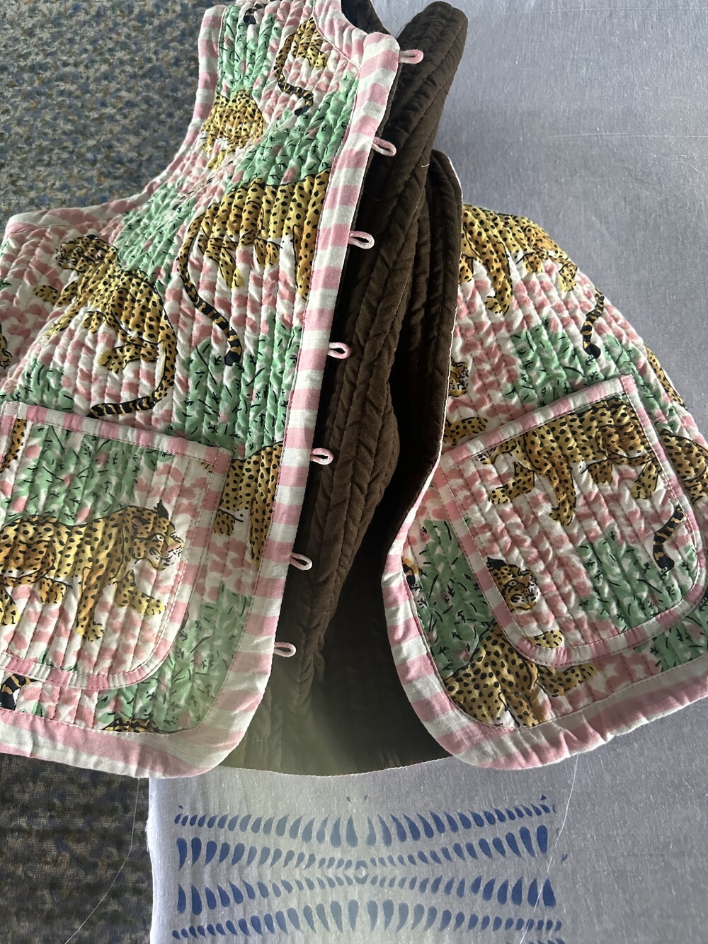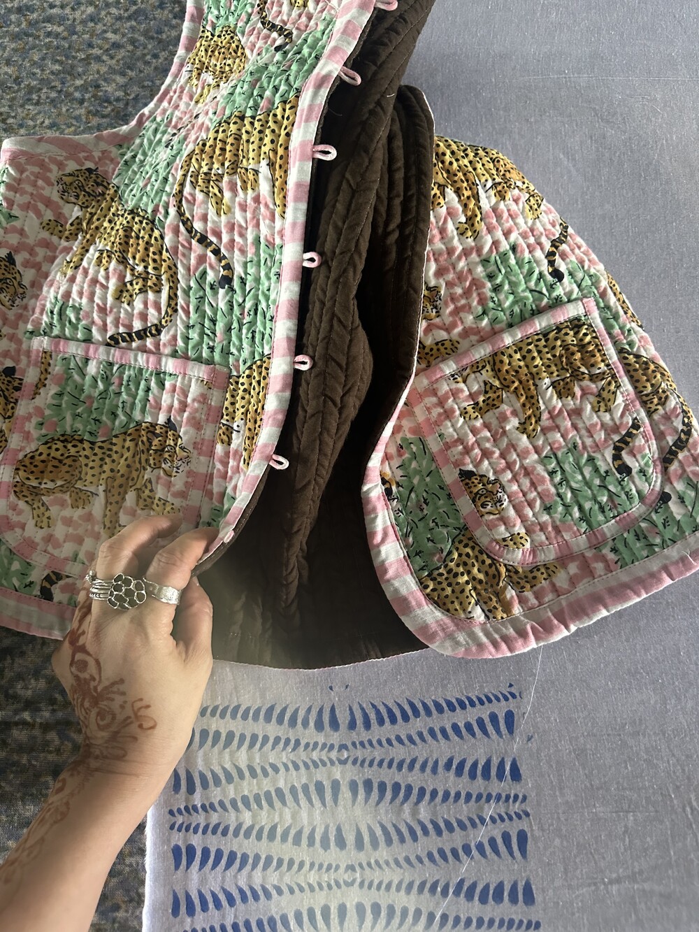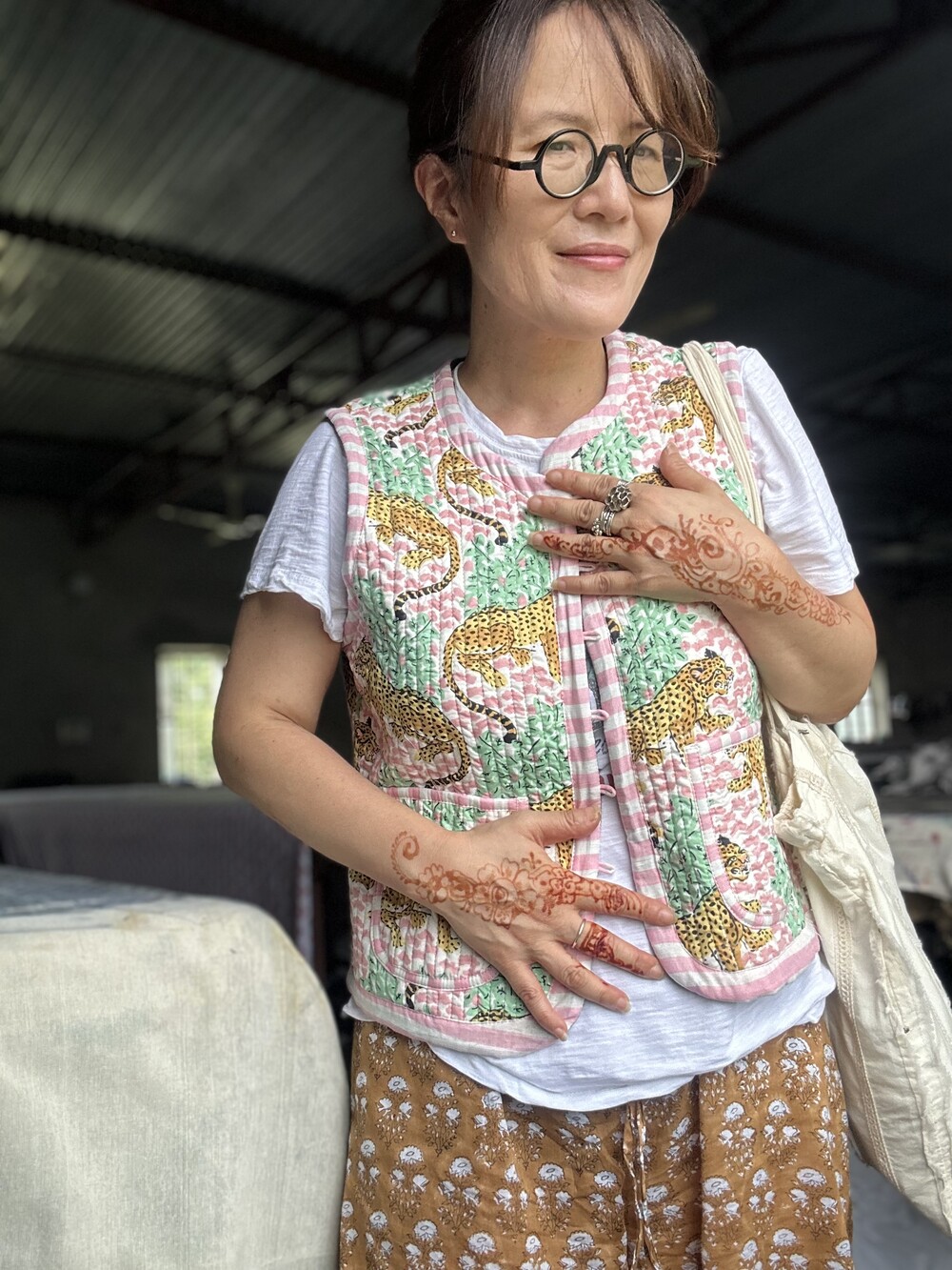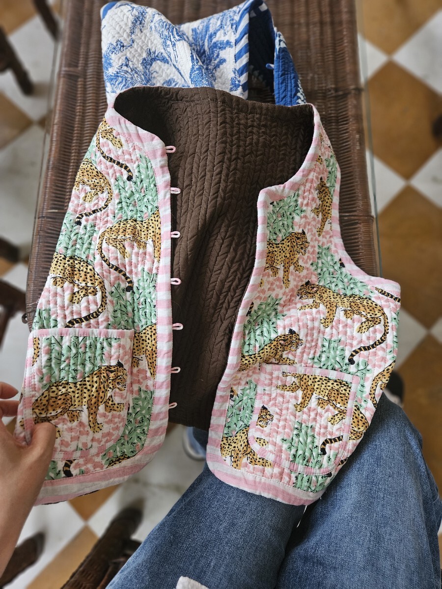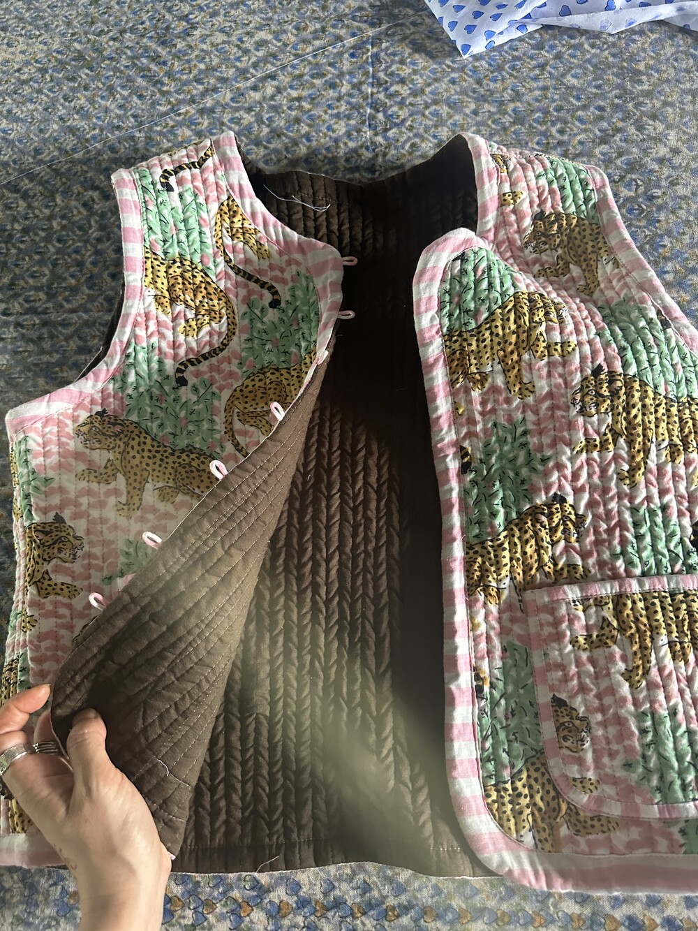 키치함을 몇스푼 넣어 만들어보았어요,누빔 퀼팅 조끼이고 약간의 솜을 패널로 만들어서 가볍게 디자인됬어요,그래도 따뜻해서 한여름빼고는 실내에서도 아주 좋은 아이템이에요,전 인도 에어컨속에서만 지내는게 힘들어서 에어컨실내와 장거리 차로 이동시 꼭 입어요,가슴둘레는 미듐단면 54.라지는 65에요.