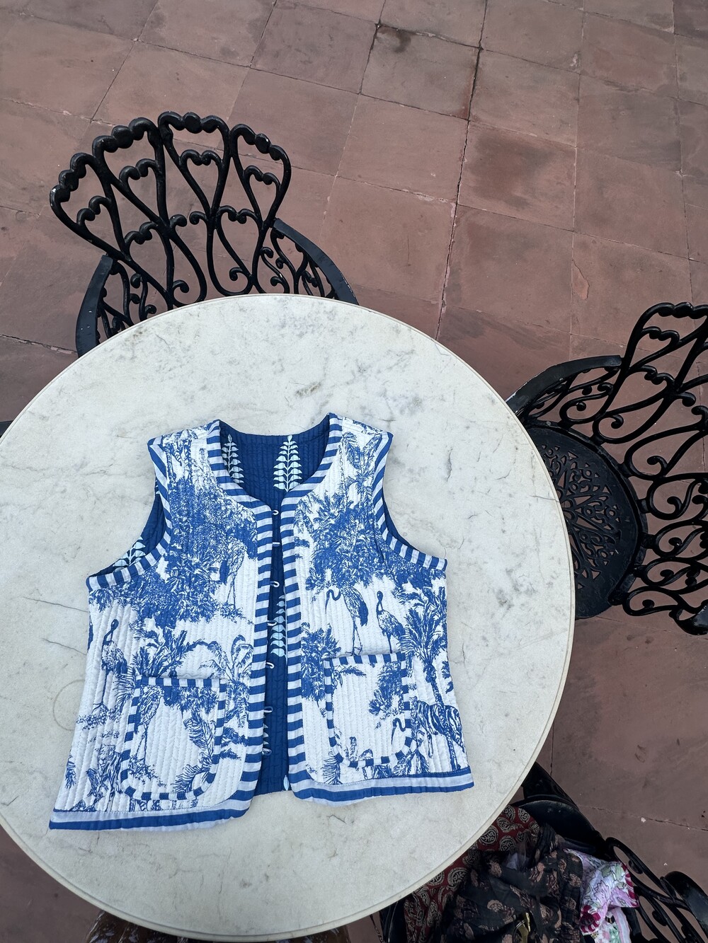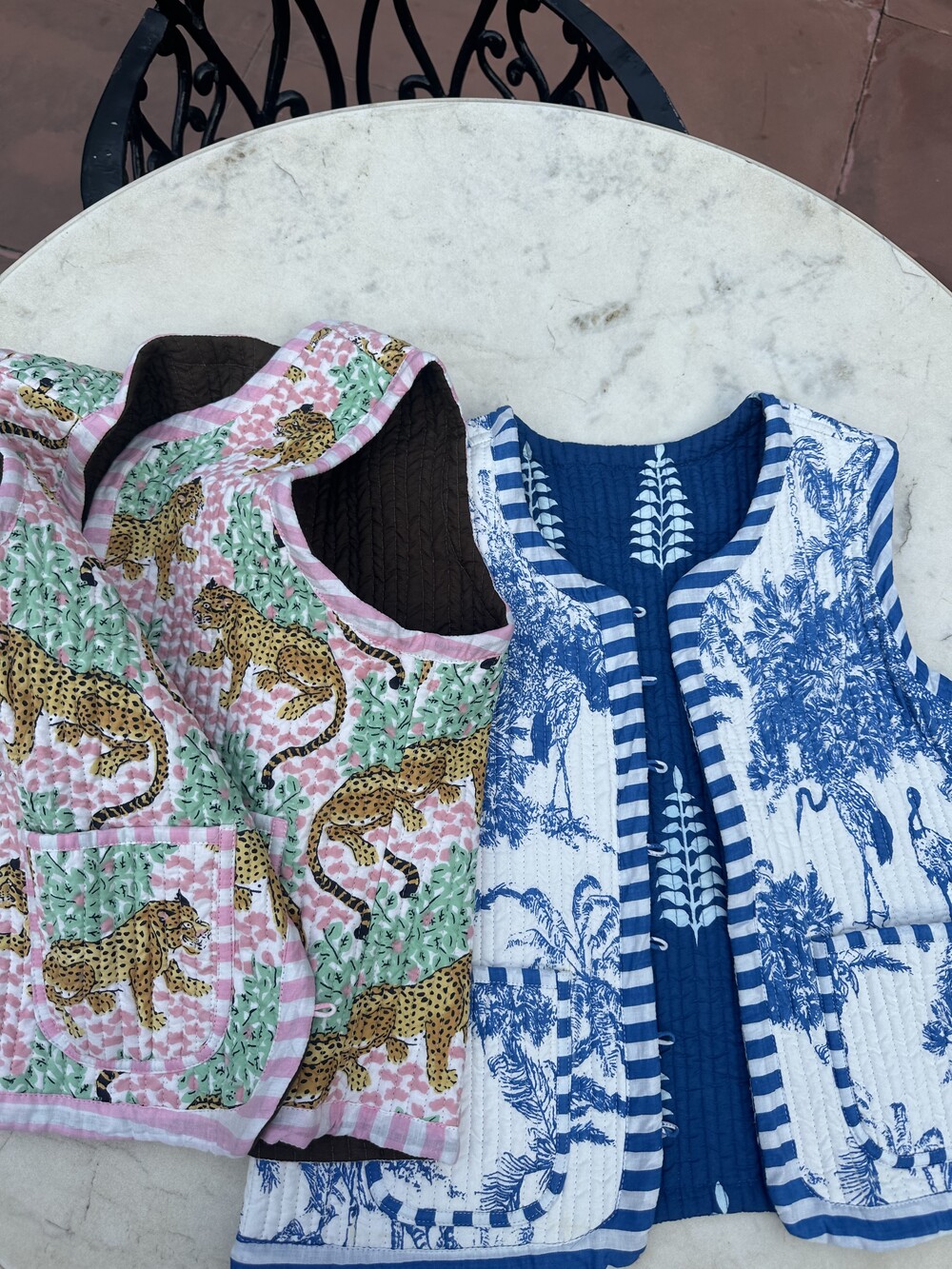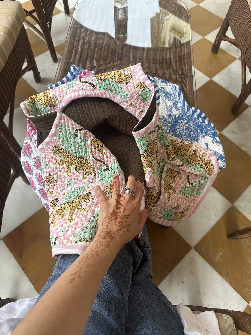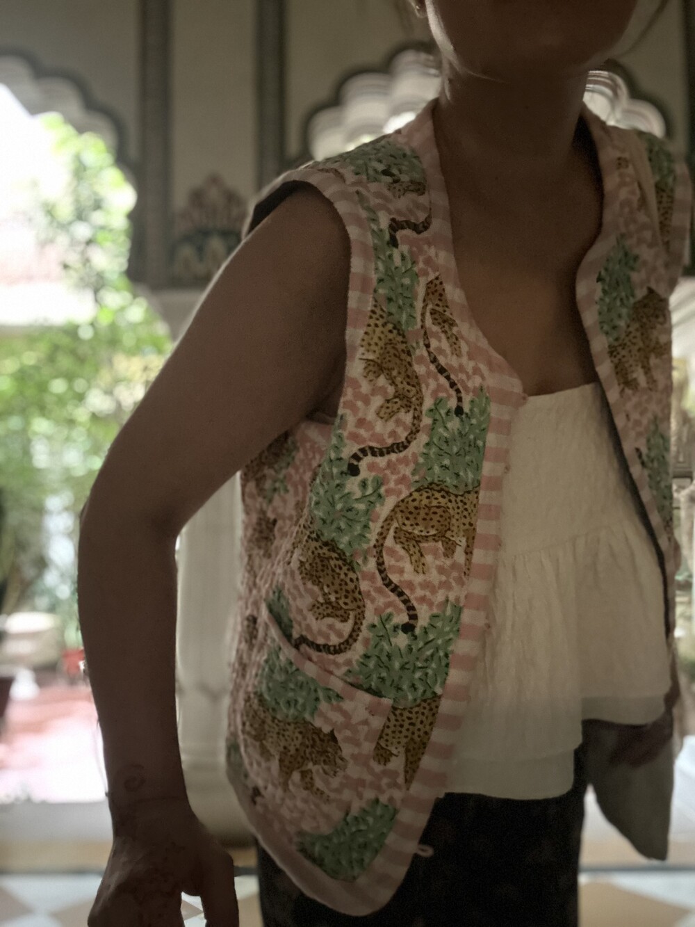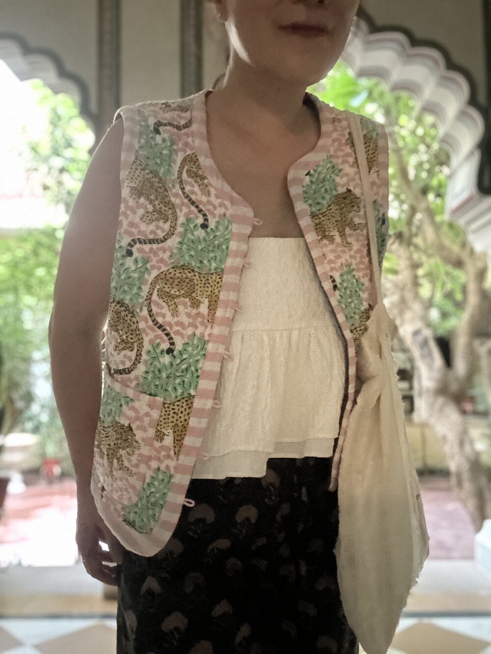키치함을 몇스푼 넣어 만들어보았어요,누빔 퀼팅 조끼이고 약간의 솜을 패널로 만들어서 가볍게 디자인됬어요,그래도 따뜻해서 한여름빼고는 실내에서도 아주 좋은 아이템이에요,전 인도 에어컨속에서만 지내는게 힘들어서 에어컨실내와 장거리 차로 이동시 꼭 입어요,가슴둘레는 미듐단면 54.라지는 65에요.