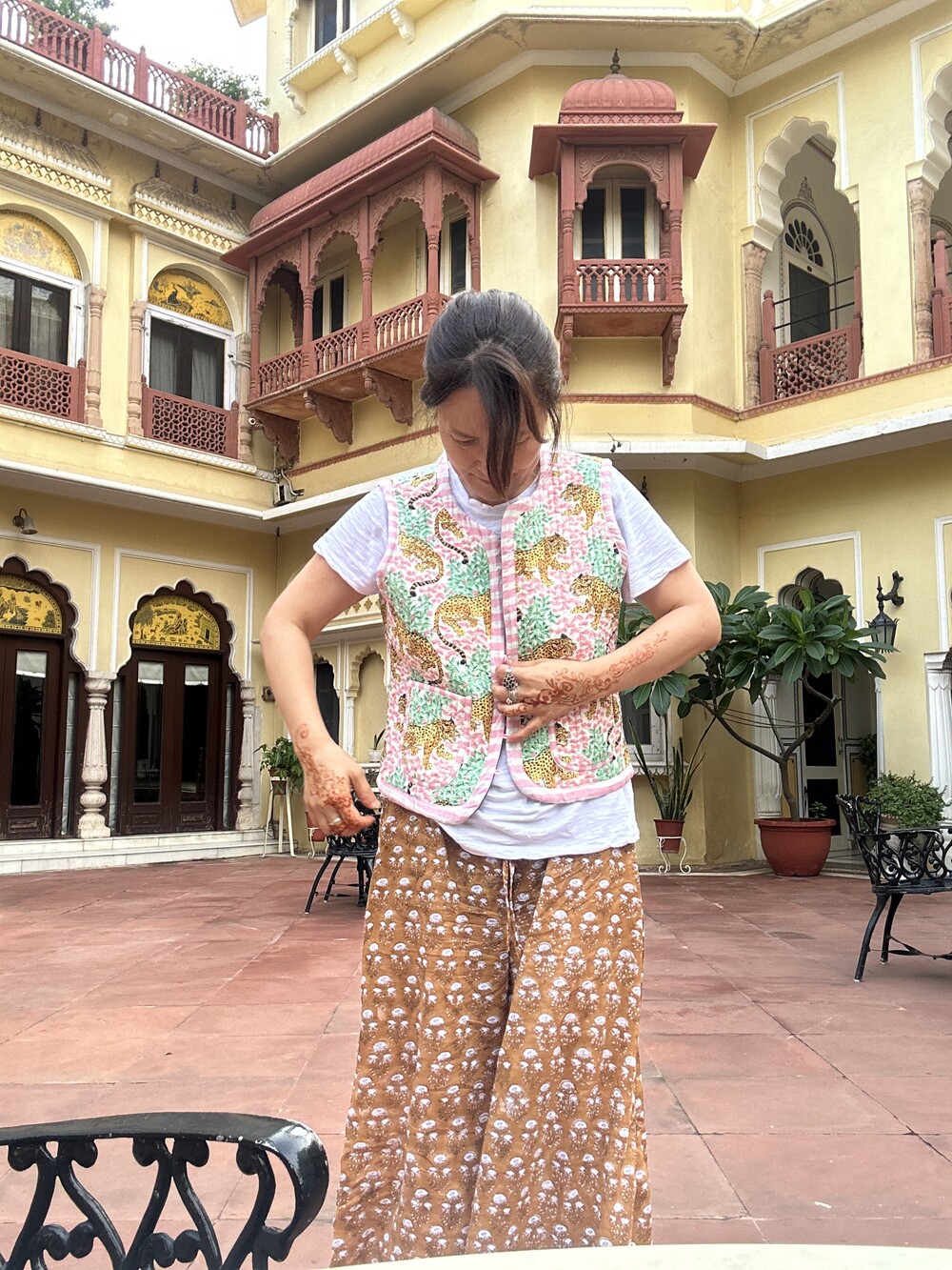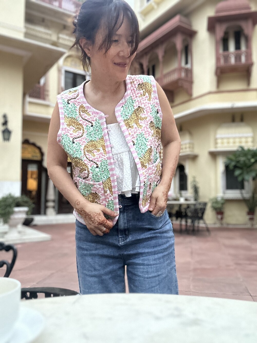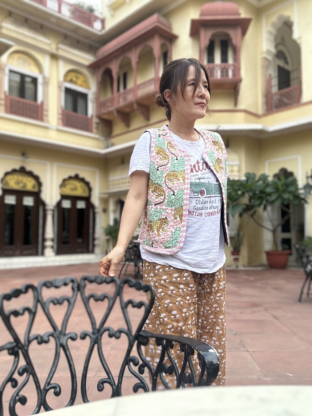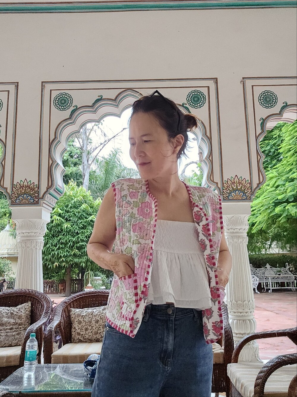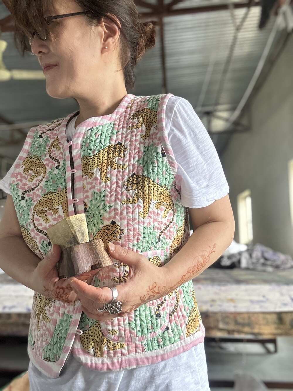 키치함을 몇스푼 넣어 만들어보았어요,누빔 퀼팅 조끼이고 약간의 솜을 패널로 만들어서 가볍게 디자인됬어요,그래도 따뜻해서 한여름빼고는 실내에서도 아주 좋은 아이템이에요,전 인도 에어컨속에서만 지내는게 힘들어서 에어컨실내와 장거리 차로 이동시 꼭 입어요,가슴둘레는 미듐단면 54.라지는 65에요.