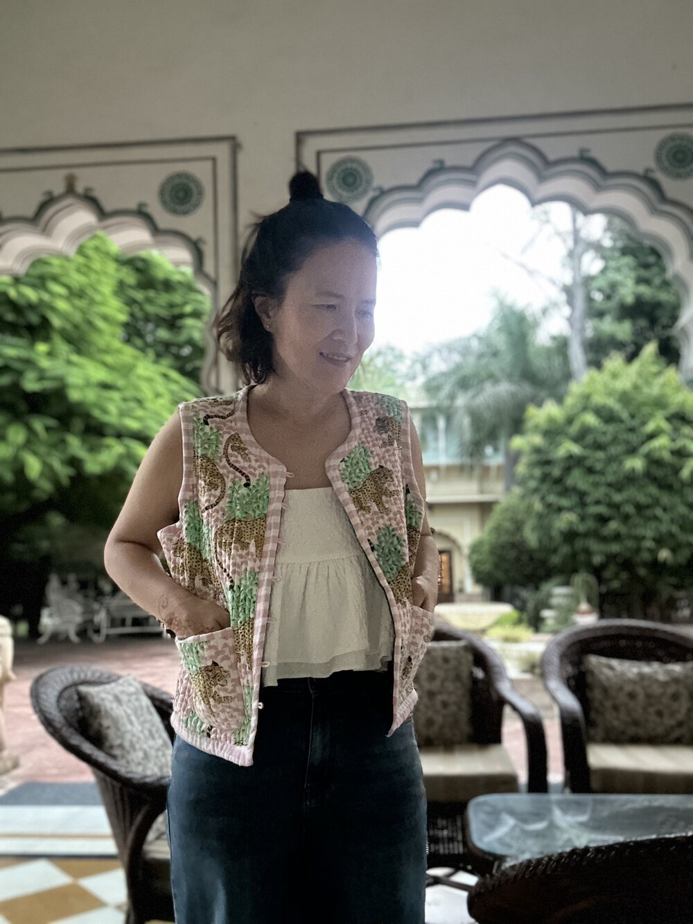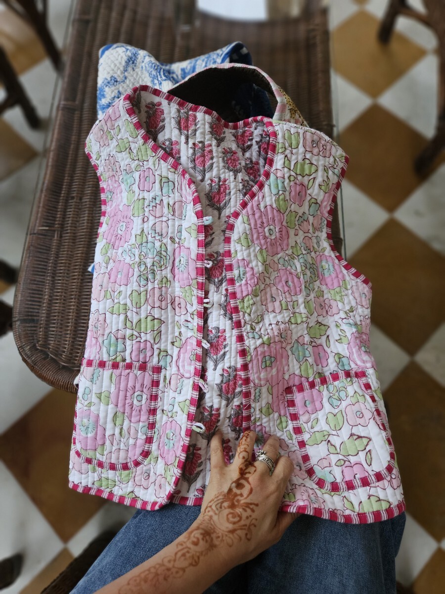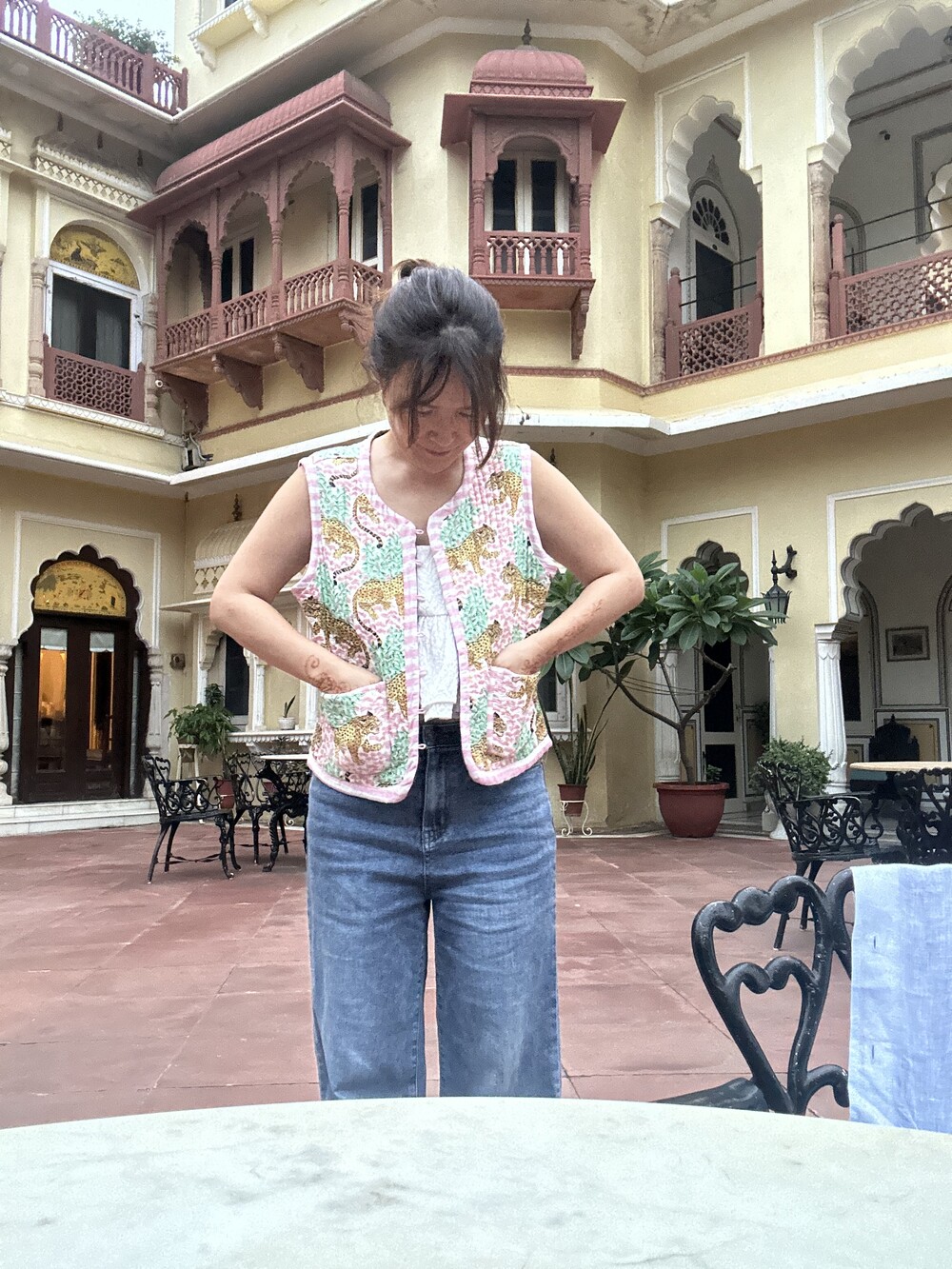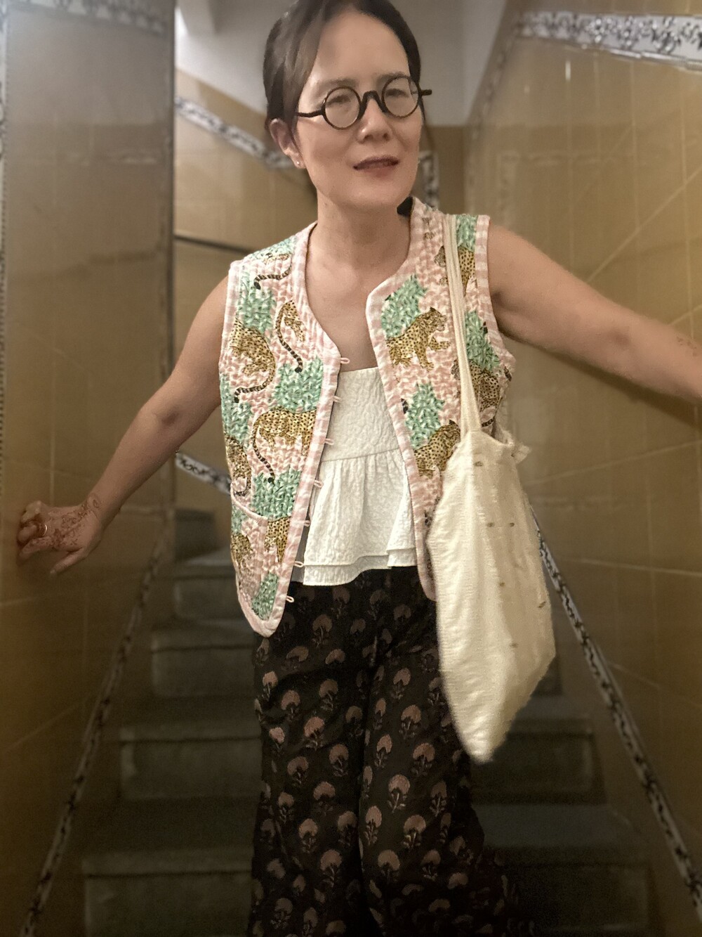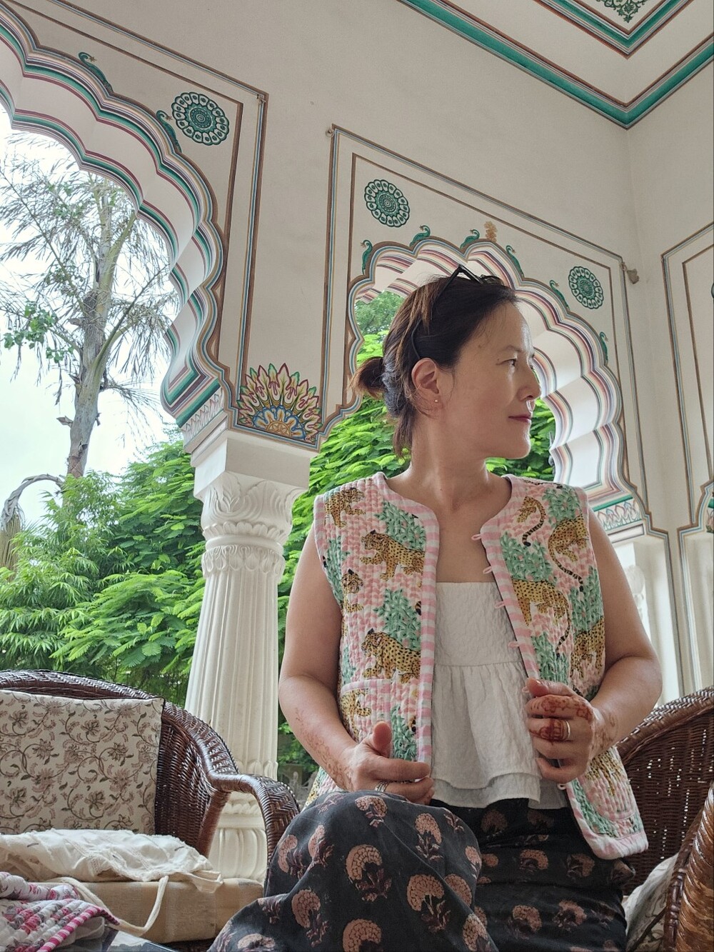 키치함을 몇스푼 넣어 만들어보았어요,누빔 퀼팅 조끼이고 약간의 솜을 패널로 만들어서 가볍게 디자인됬어요,그래도 따뜻해서 한여름빼고는 실내에서도 아주 좋은 아이템이에요,전 인도 에어컨속에서만 지내는게 힘들어서 에어컨실내와 장거리 차로 이동시 꼭 입어요,가슴둘레는 미듐단면 54.라지는 65에요.
