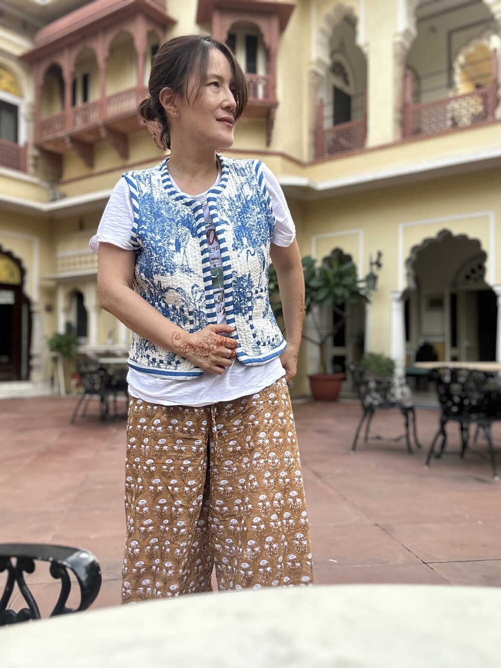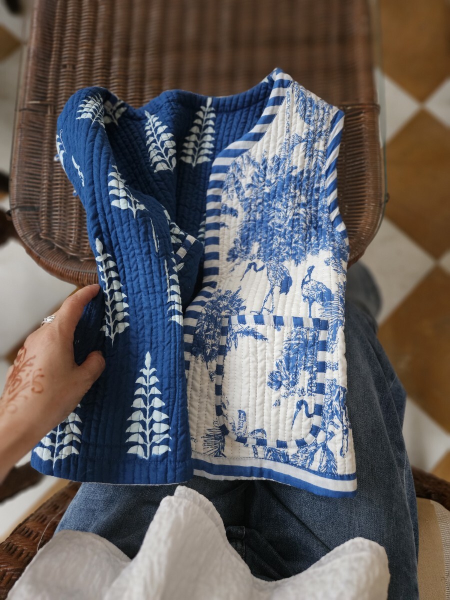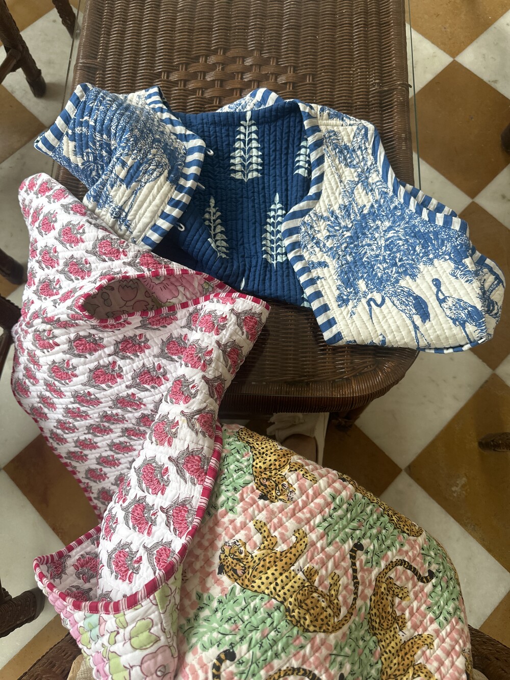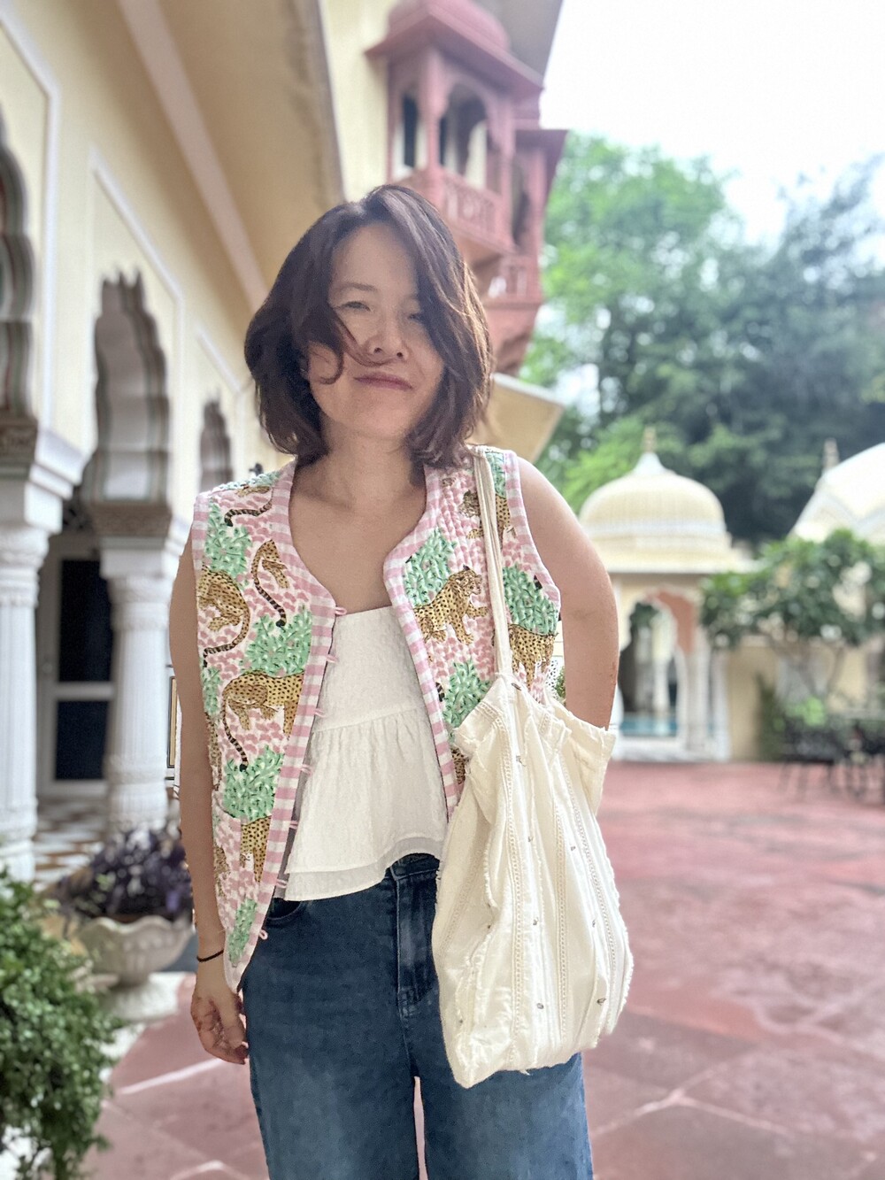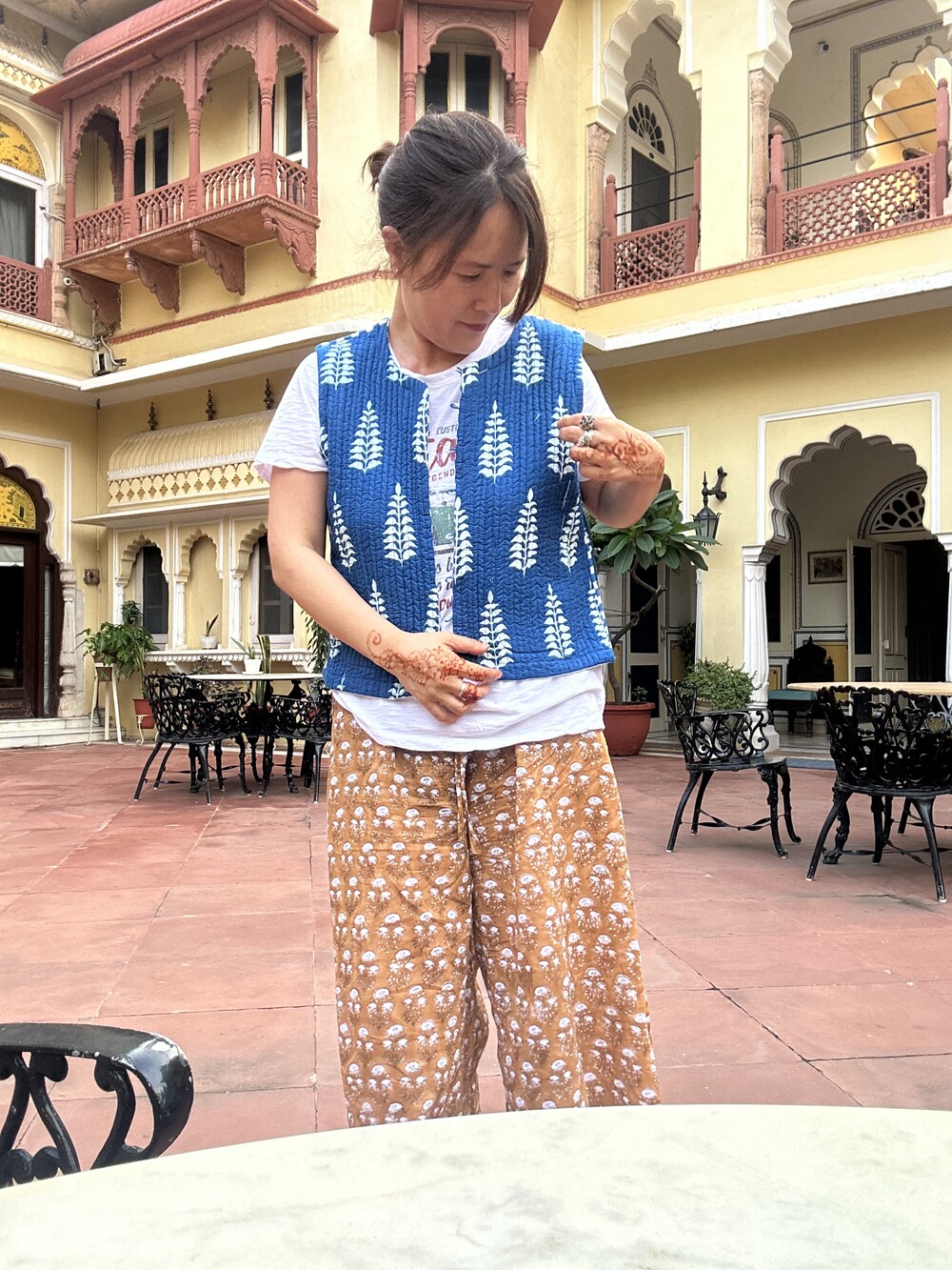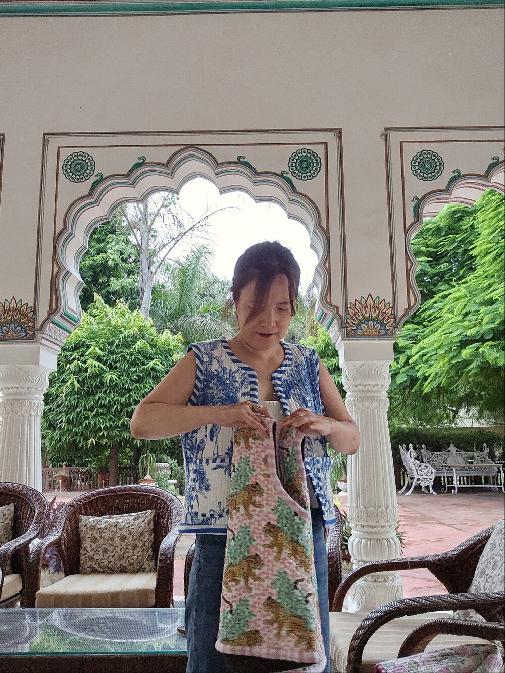 키치함을 몇스푼 넣어 만들어보았어요,누빔 퀼팅 조끼이고 약간의 솜을 패널로 만들어서 가볍게 디자인됬어요,그래도 따뜻해서 한여름빼고는 실내에서도 아주 좋은 아이템이에요,전 인도 에어컨속에서만 지내는게 힘들어서 에어컨실내와 장거리 차로 이동시 꼭 입어요,가슴둘레는 미듐단면 54.라지는 65에요.