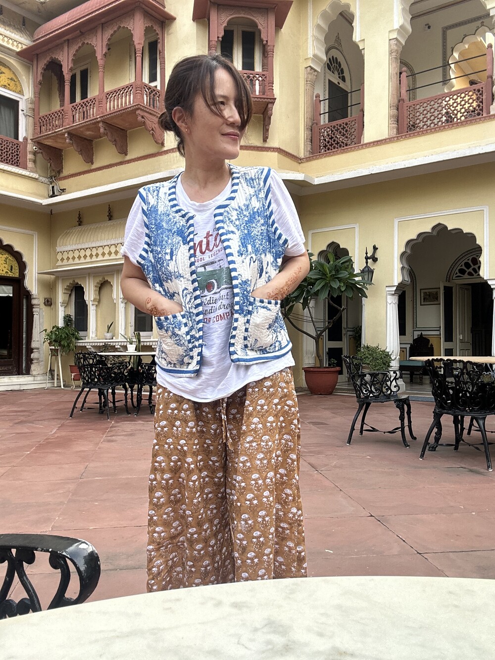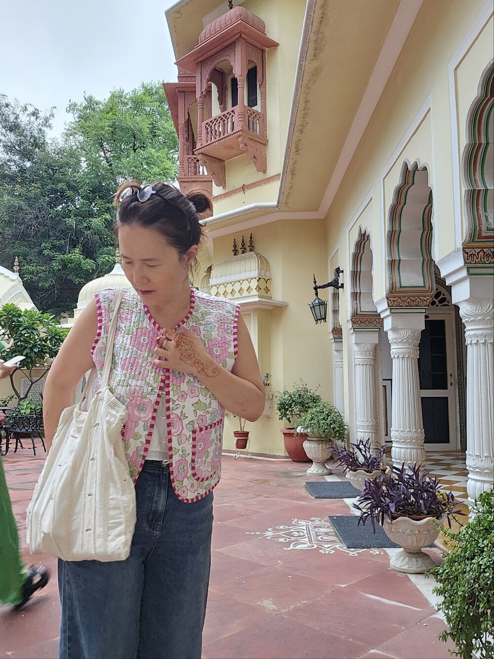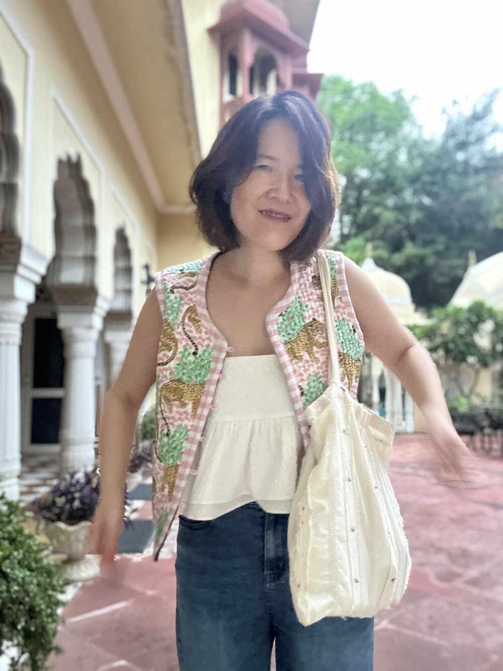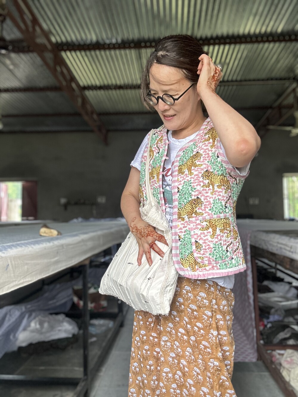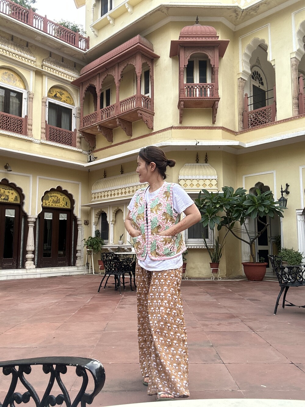 키치함을 몇스푼 넣어 만들어보았어요,누빔 퀼팅 조끼이고 약간의 솜을 패널로 만들어서 가볍게 디자인됬어요,그래도 따뜻해서 한여름빼고는 실내에서도 아주 좋은 아이템이에요,전 인도 에어컨속에서만 지내는게 힘들어서 에어컨실내와 장거리 차로 이동시 꼭 입어요,가슴둘레는 미듐단면 54.라지는 65에요.