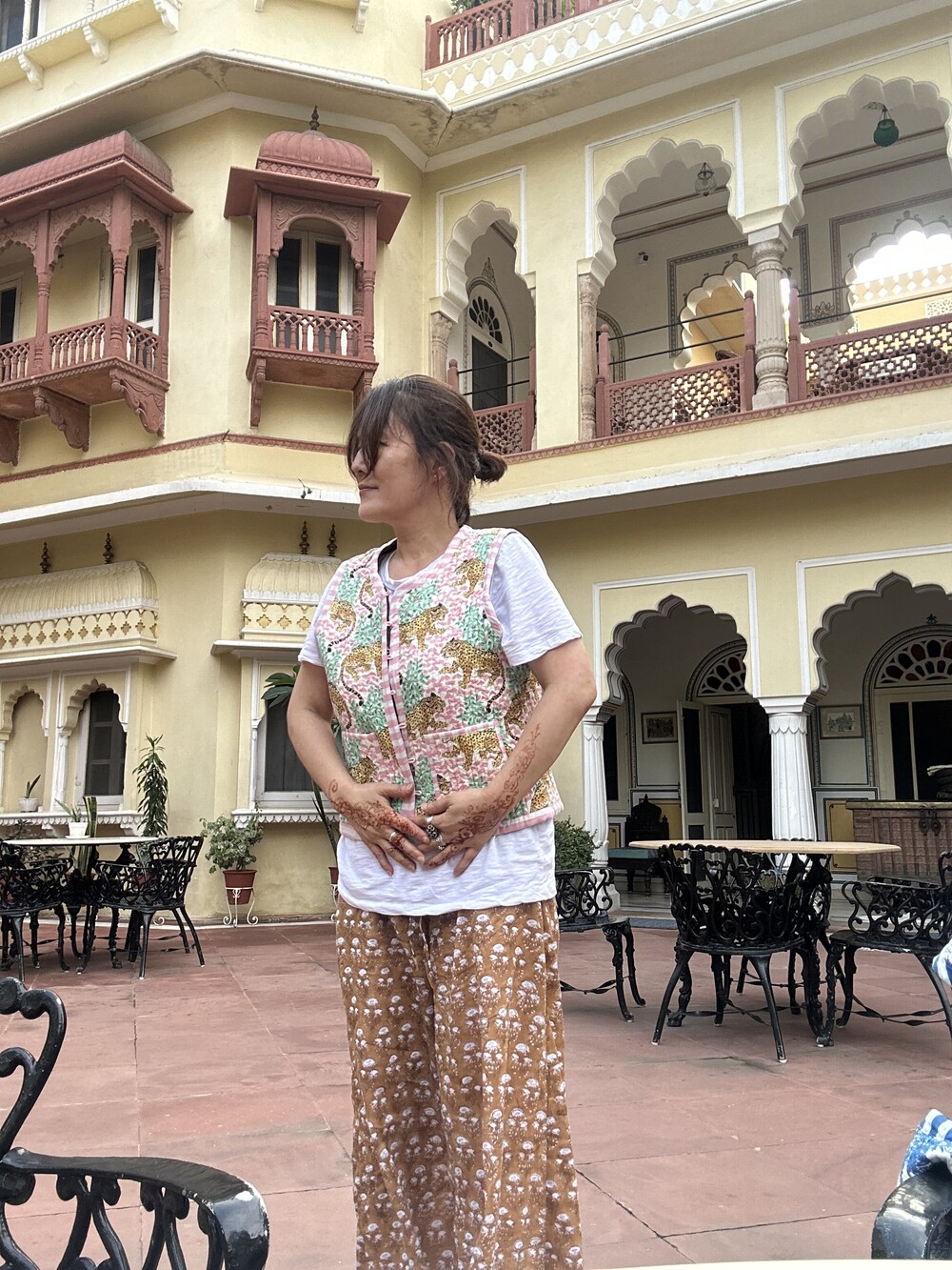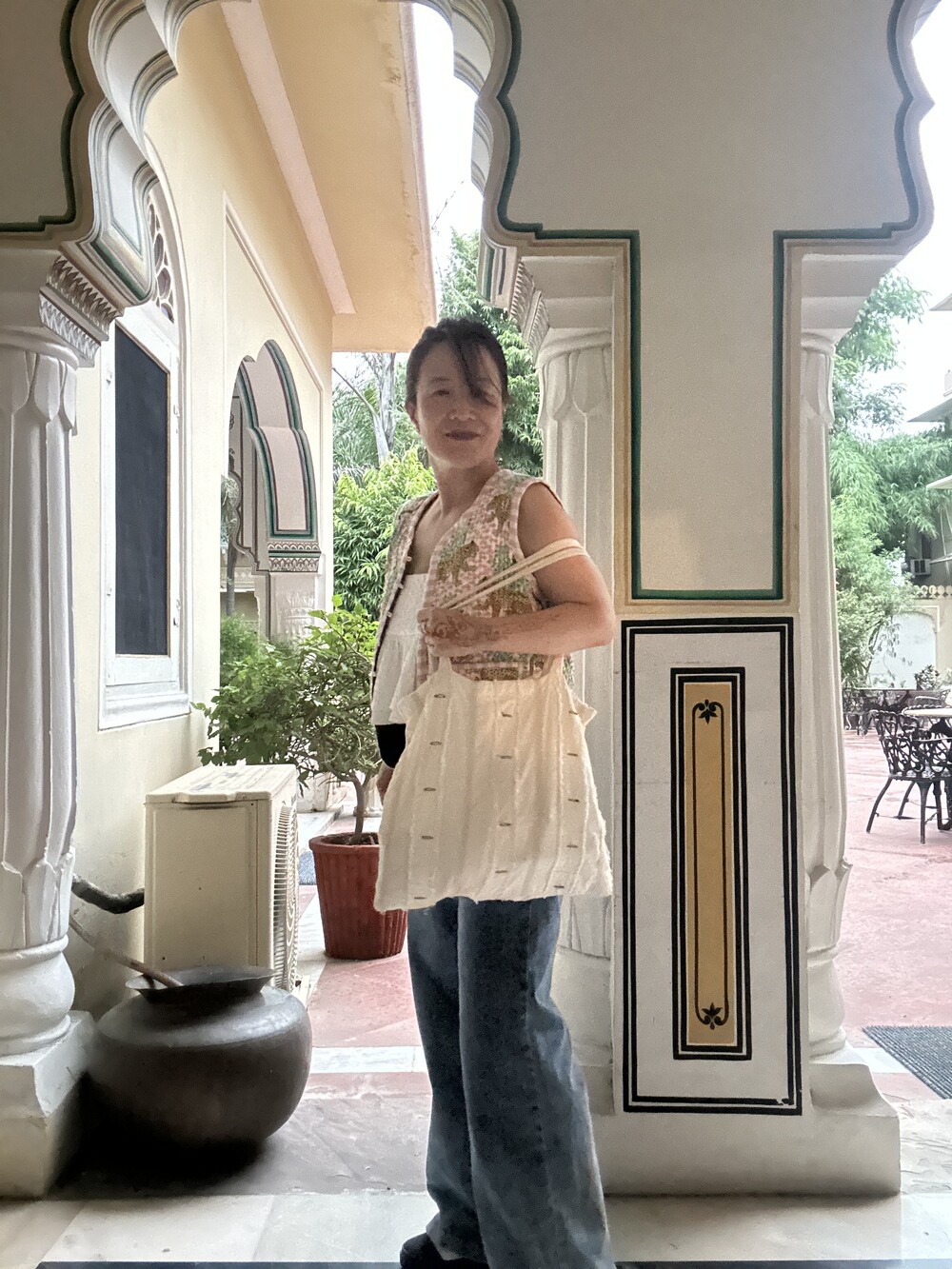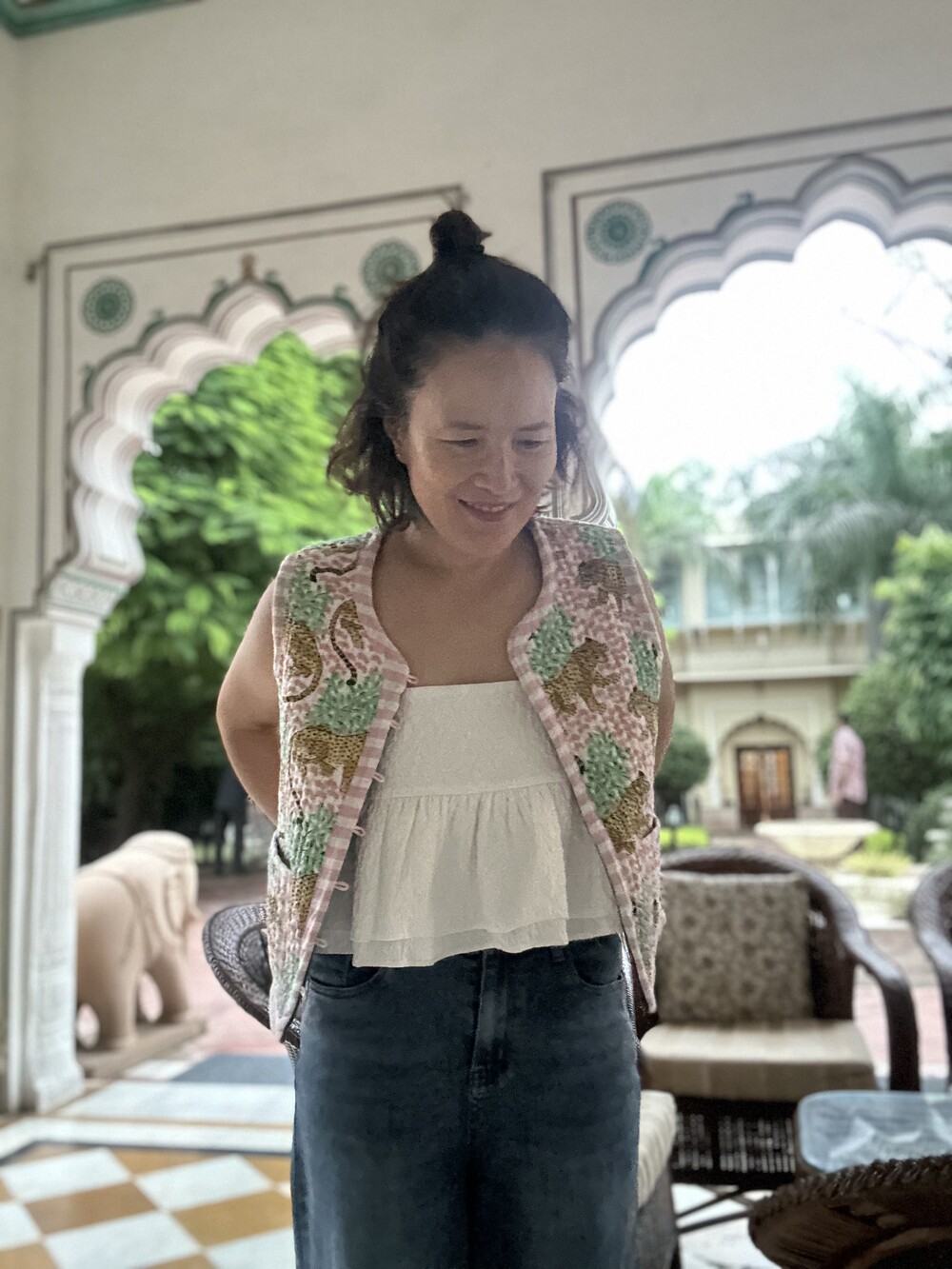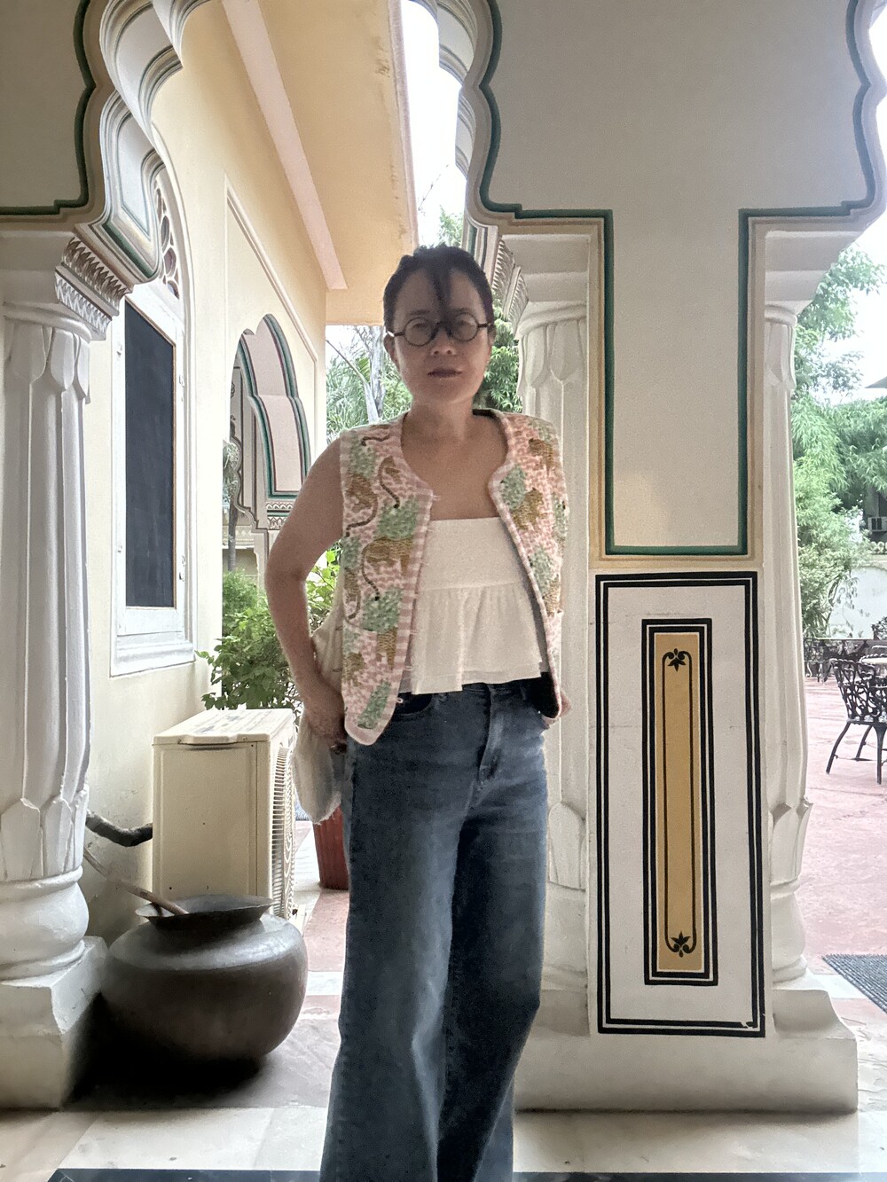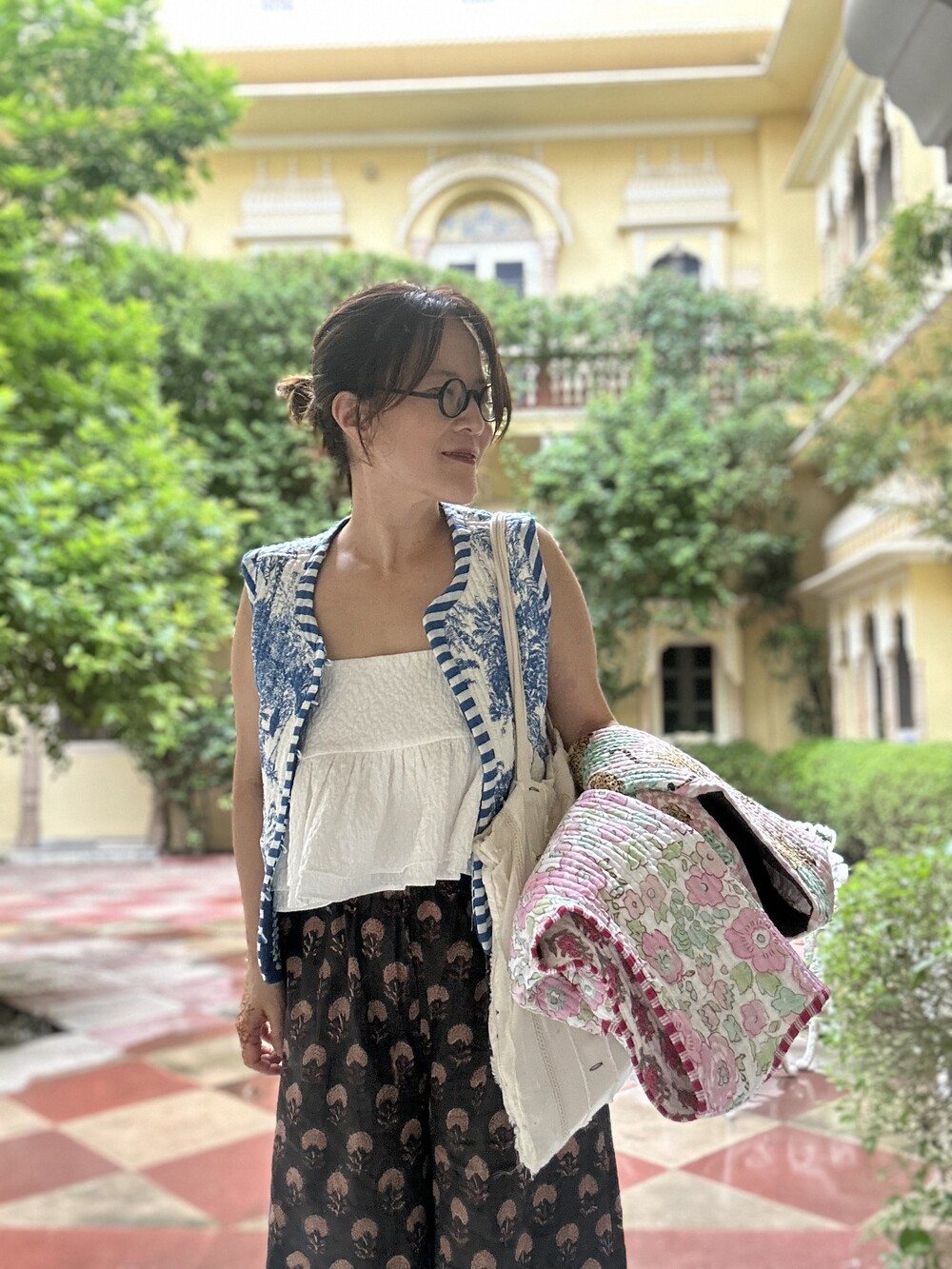 키치함을 몇스푼 넣어 만들어보았어요,누빔 퀼팅 조끼이고 약간의 솜을 패널로 만들어서 가볍게 디자인됬어요,그래도 따뜻해서 한여름빼고는 실내에서도 아주 좋은 아이템이에요,전 인도 에어컨속에서만 지내는게 힘들어서 에어컨실내와 장거리 차로 이동시 꼭 입어요,가슴둘레는 미듐단면 54.라지는 65에요.
