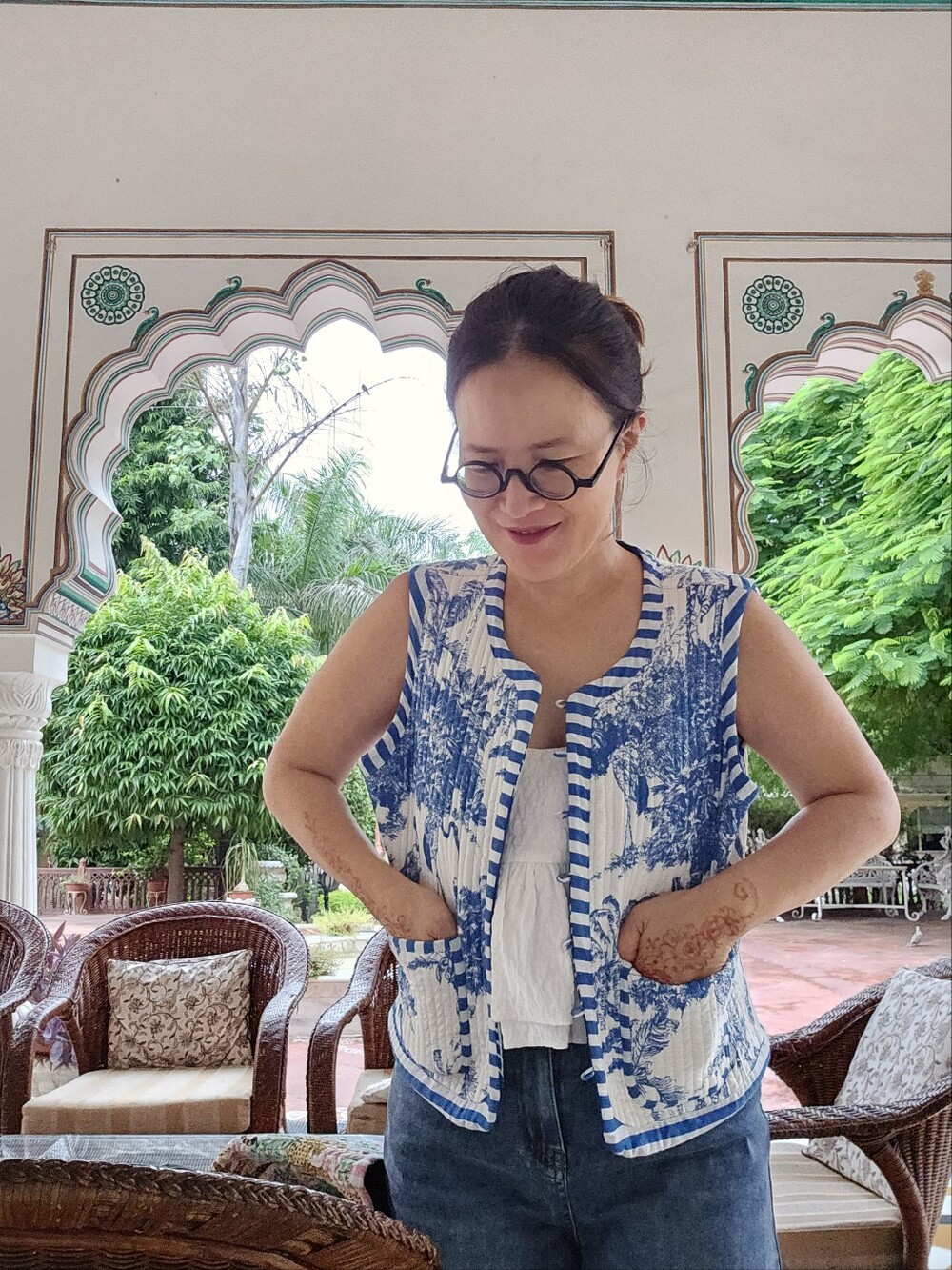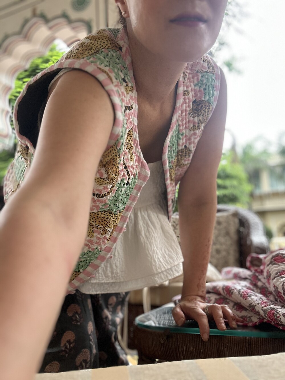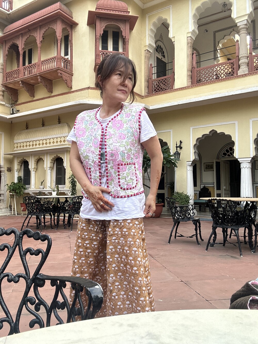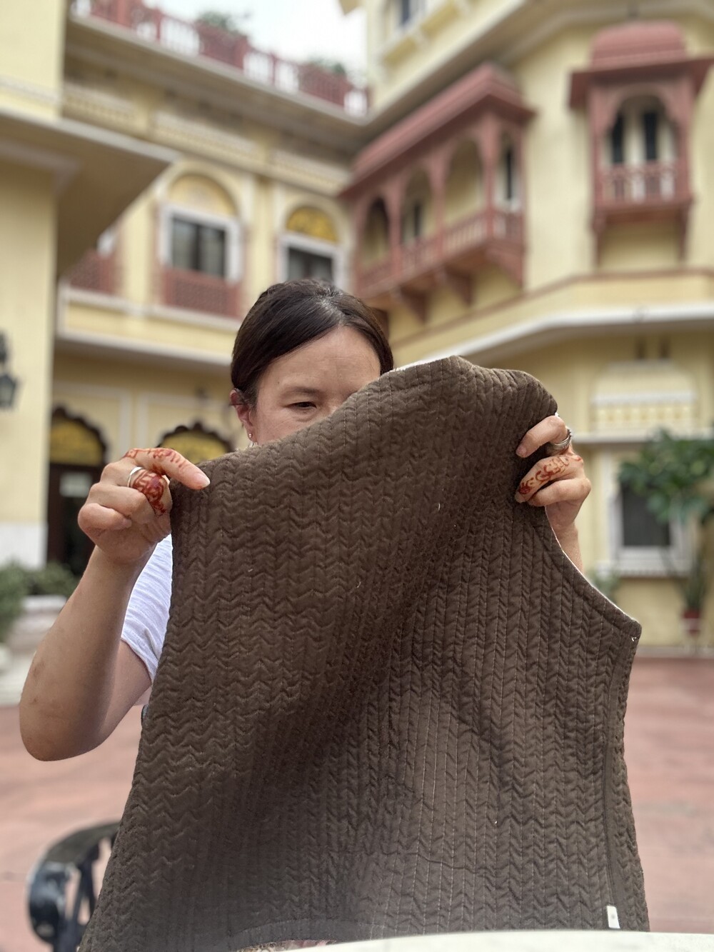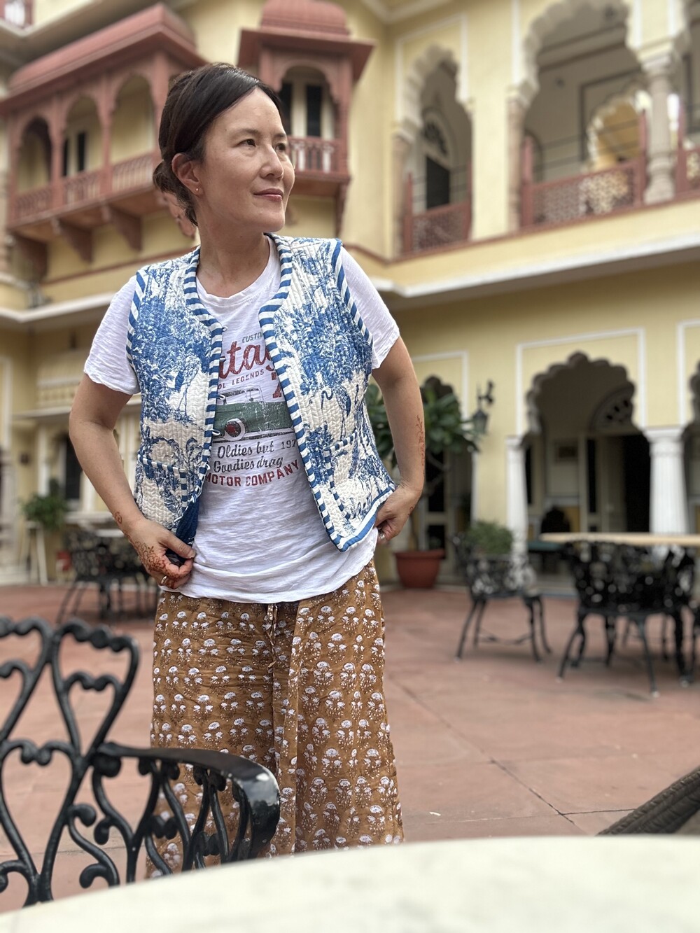 키치함을 몇스푼 넣어 만들어보았어요,누빔 퀼팅 조끼이고 약간의 솜을 패널로 만들어서 가볍게 디자인됬어요,그래도 따뜻해서 한여름빼고는 실내에서도 아주 좋은 아이템이에요,전 인도 에어컨속에서만 지내는게 힘들어서 에어컨실내와 장거리 차로 이동시 꼭 입어요,가슴둘레는 미듐단면 54.라지는 65에요.