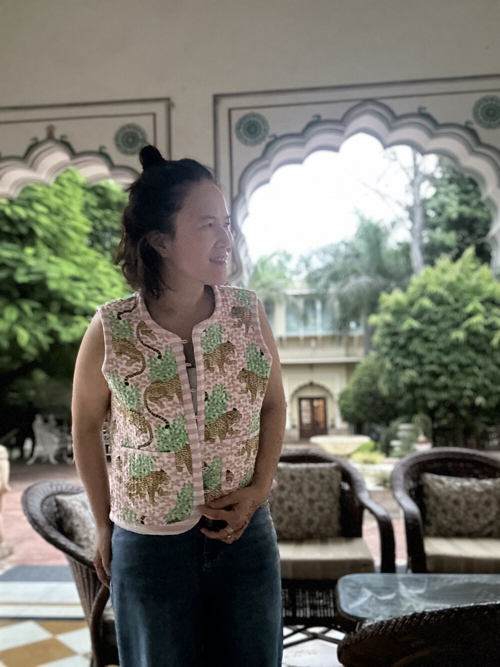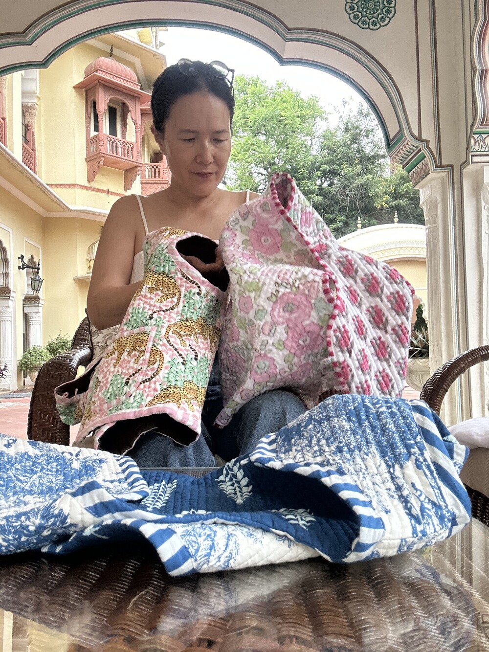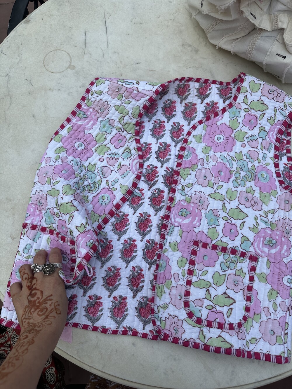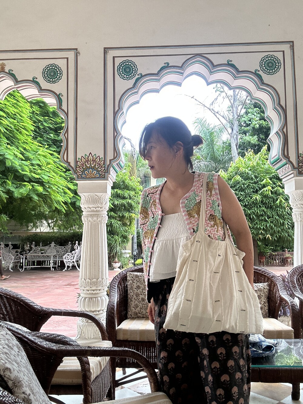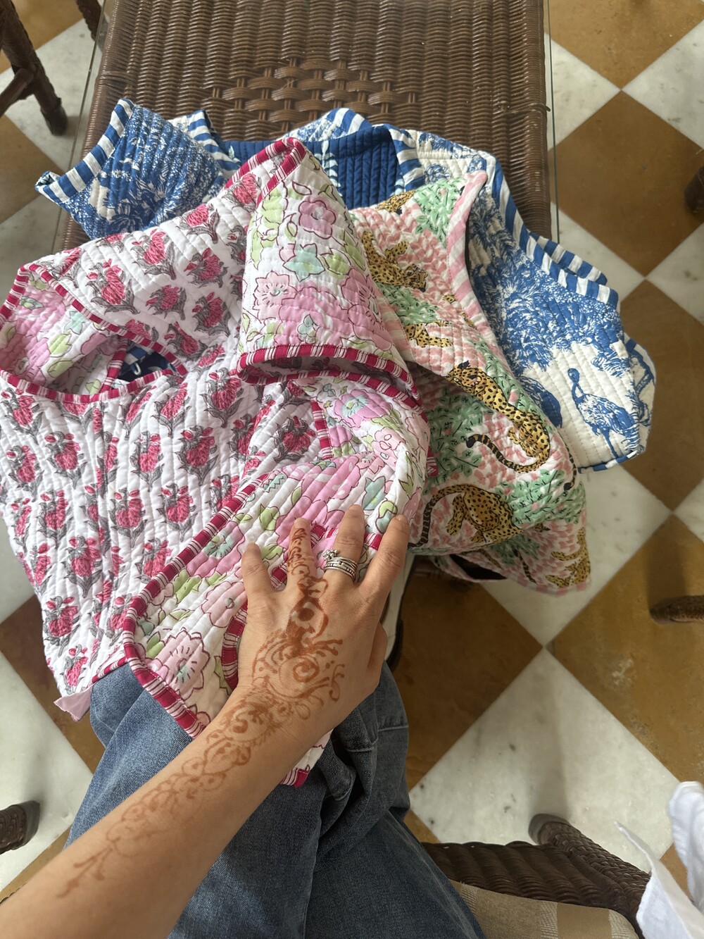 키치함을 몇스푼 넣어 만들어보았어요,누빔 퀼팅 조끼이고 약간의 솜을 패널로 만들어서 가볍게 디자인됬어요,그래도 따뜻해서 한여름빼고는 실내에서도 아주 좋은 아이템이에요,전 인도 에어컨속에서만 지내는게 힘들어서 에어컨실내와 장거리 차로 이동시 꼭 입어요,가슴둘레는 미듐단면 54.라지는 65에요.
