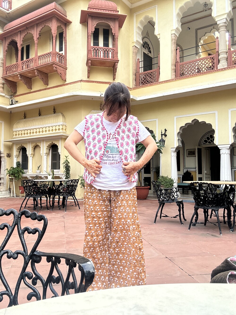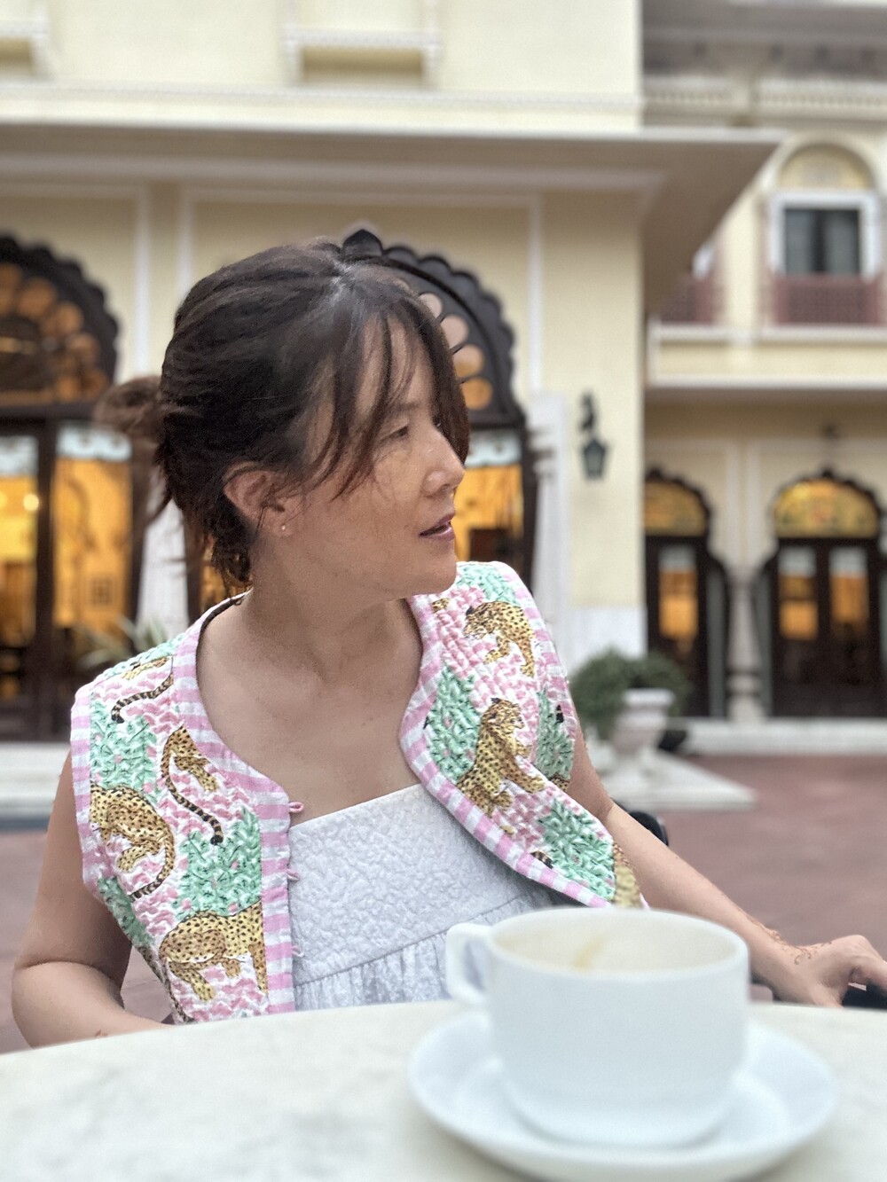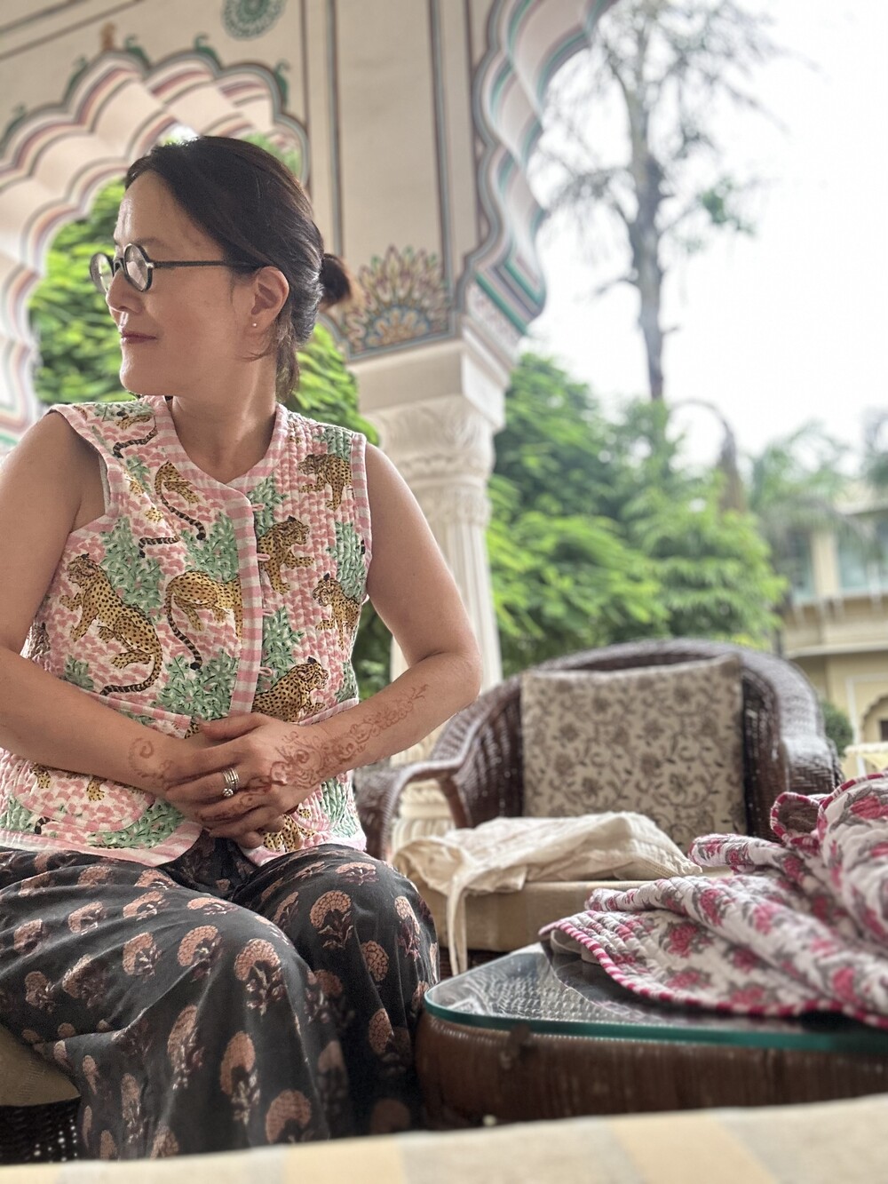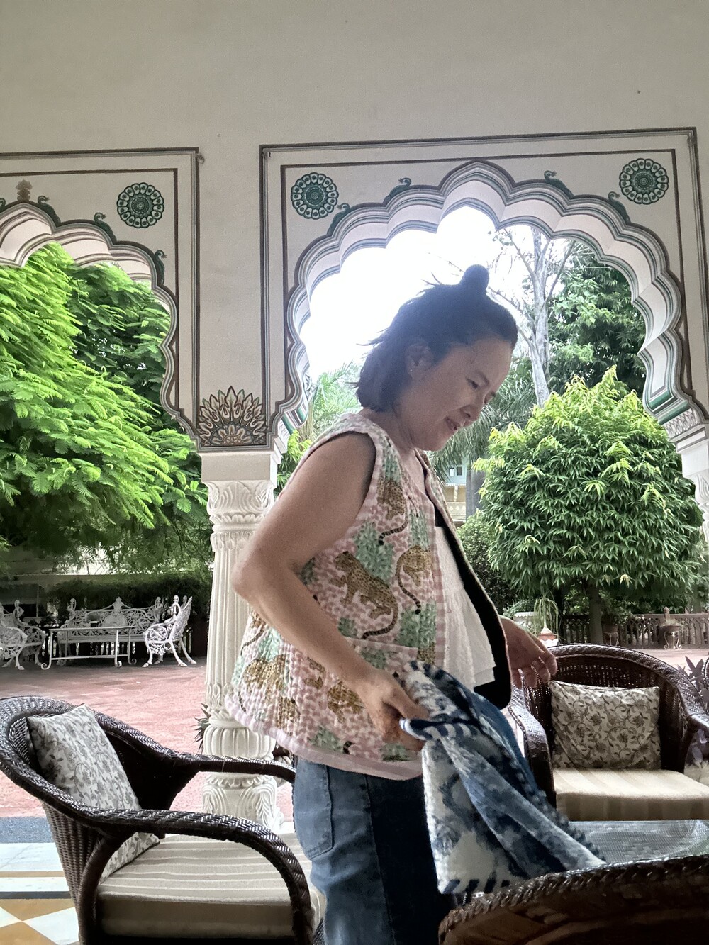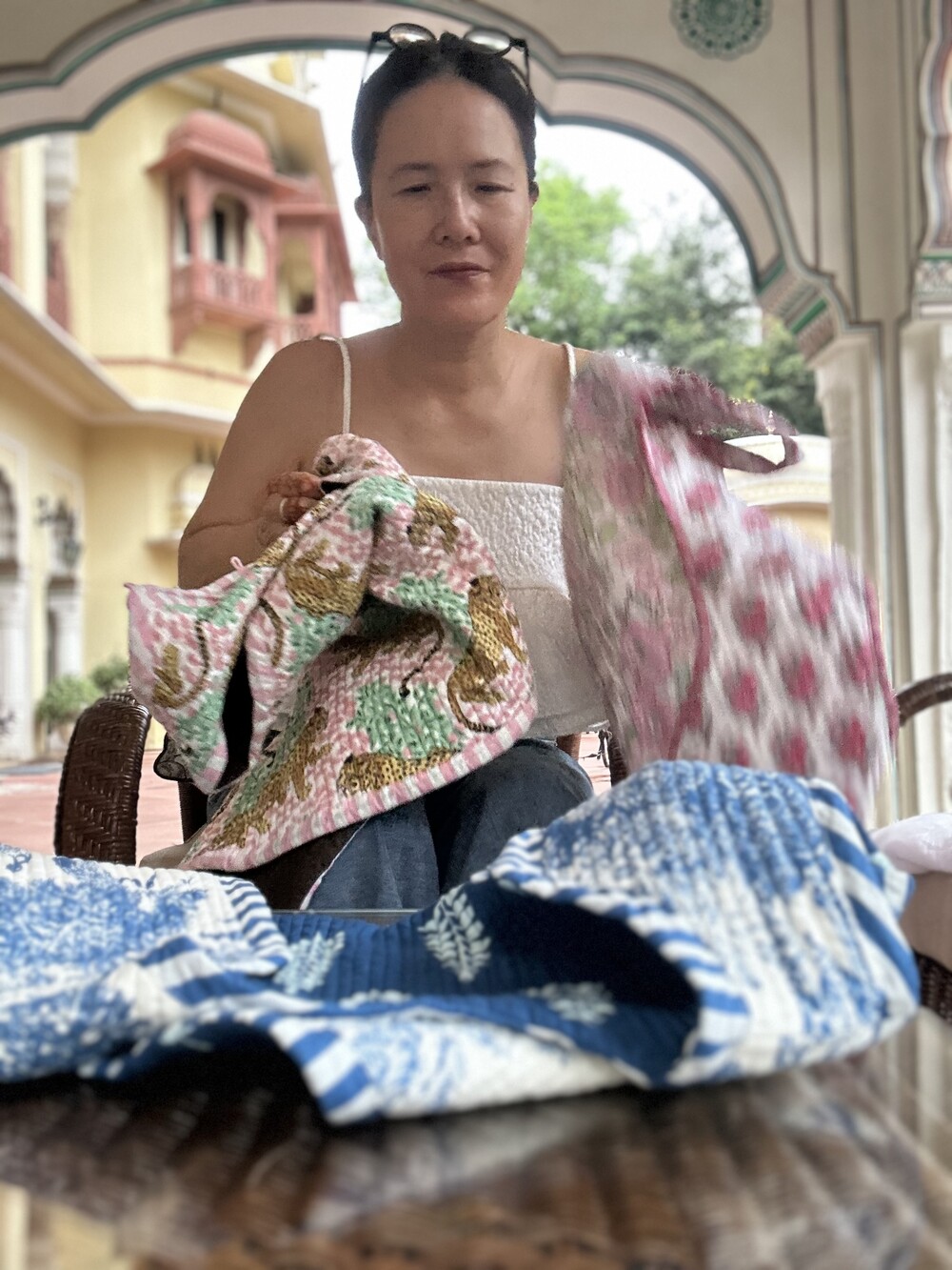 키치함을 몇스푼 넣어 만들어보았어요,누빔 퀼팅 조끼이고 약간의 솜을 패널로 만들어서 가볍게 디자인됬어요,그래도 따뜻해서 한여름빼고는 실내에서도 아주 좋은 아이템이에요,전 인도 에어컨속에서만 지내는게 힘들어서 에어컨실내와 장거리 차로 이동시 꼭 입어요,가슴둘레는 미듐단면 54.라지는 65에요.