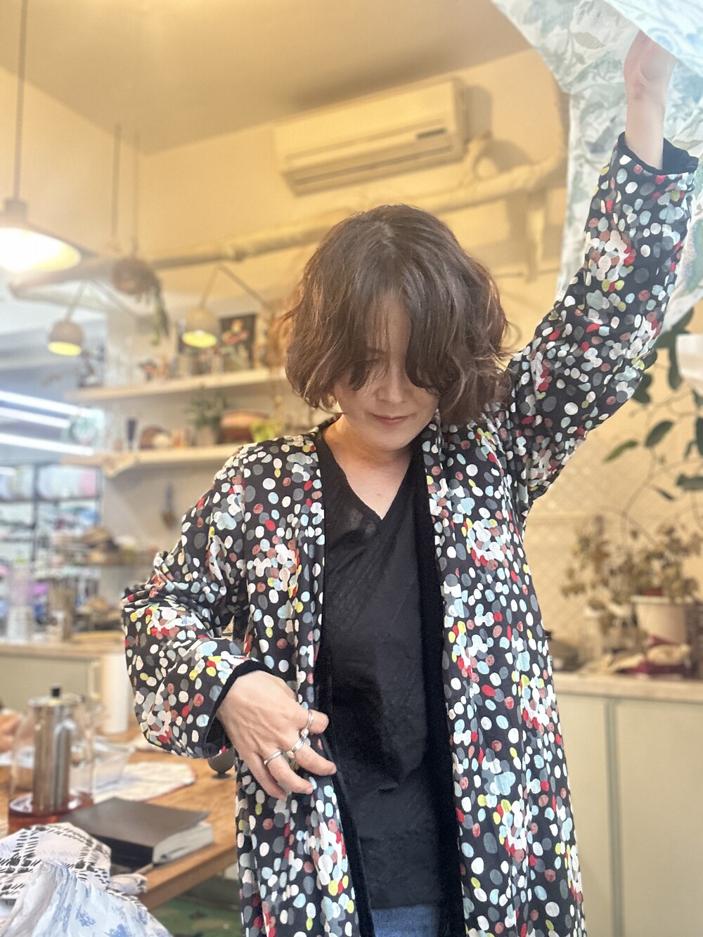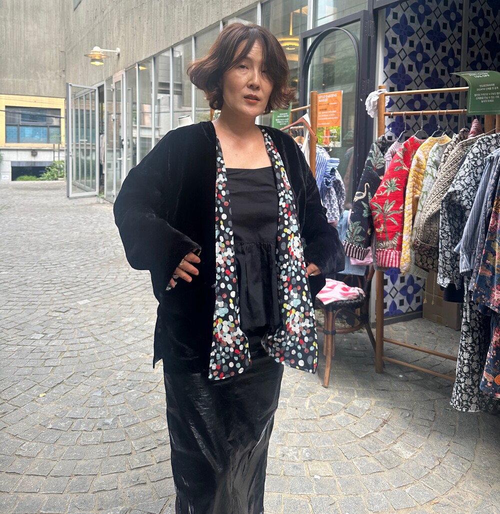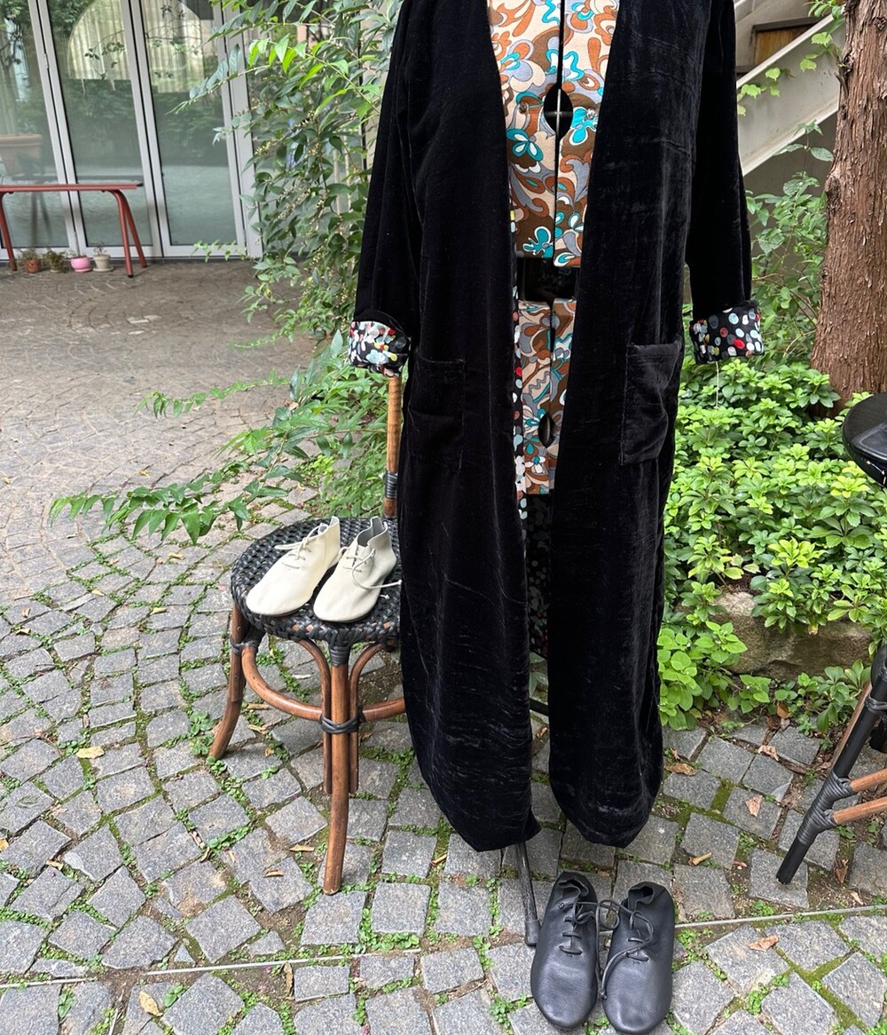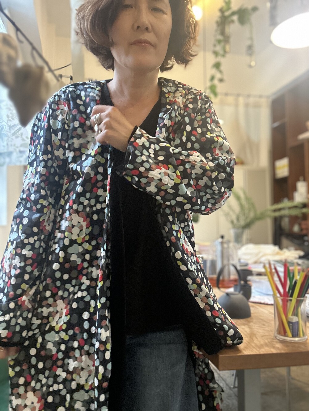 숏기장은 73 가슴둘레 66 소매기장은 17-18이고 긴기장은 가슴둘레 63이고 기장 109센티에요.소매둘레는 21이에요.가디건 로브처럼 입으시면 되고 인도의 면벨벳이에요.10.16까지 주문해주시는분들께는 도트이너를 함께 보내드려요.정말 아름다운 원단이고 드뷔쉬의 달빛을 연상하며 만든 프린팅이에요,