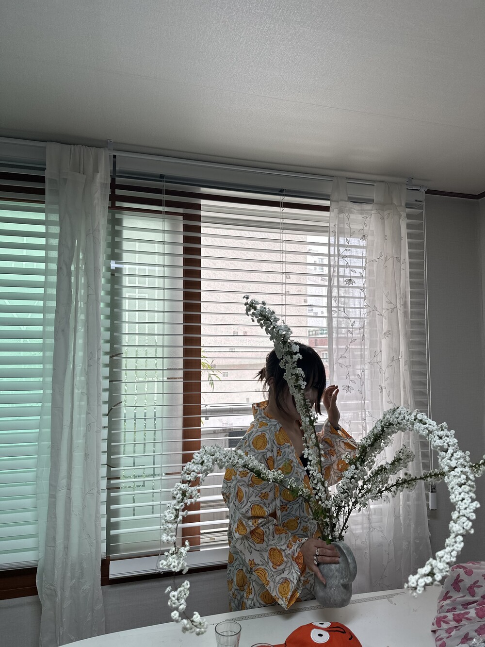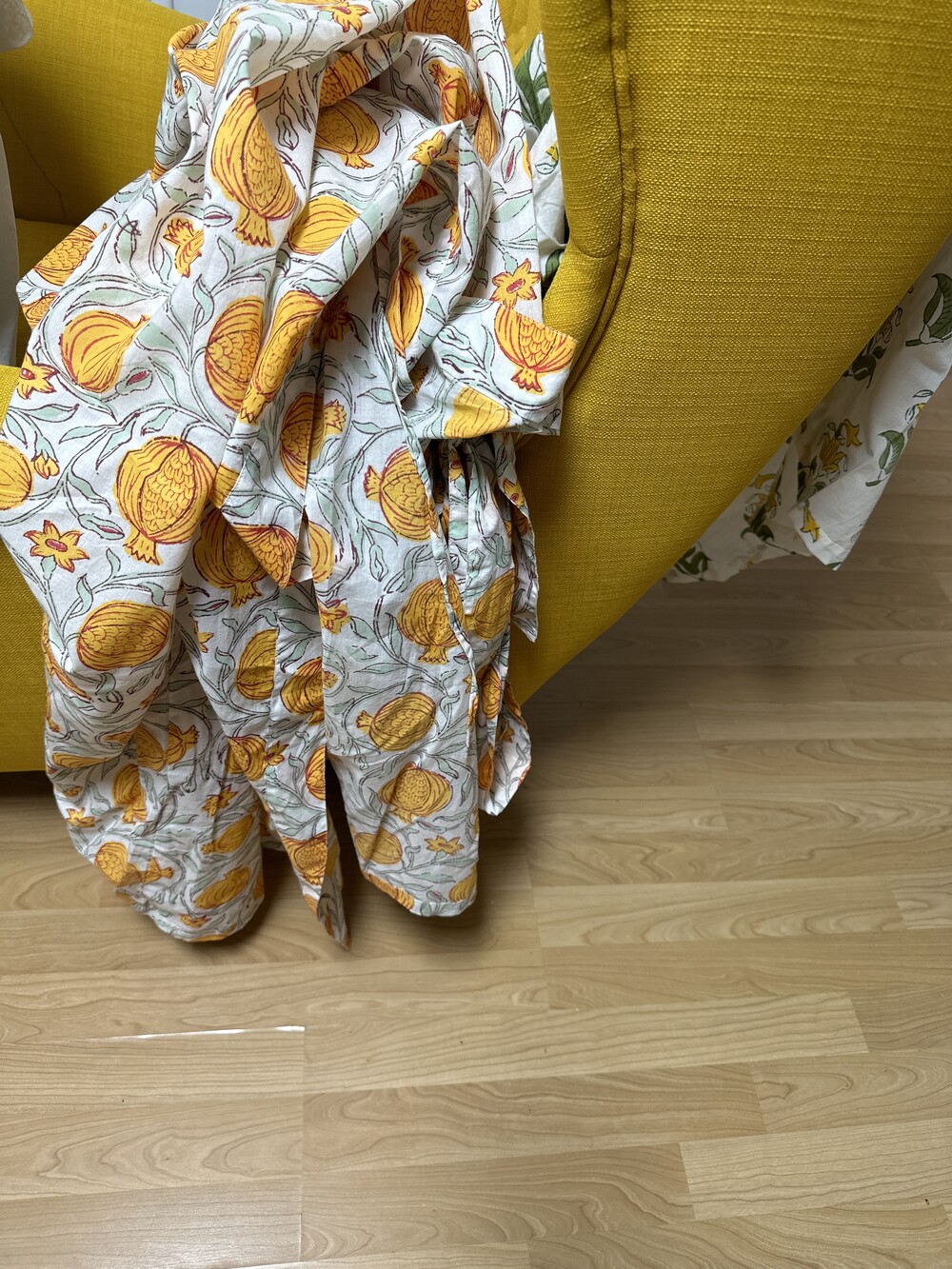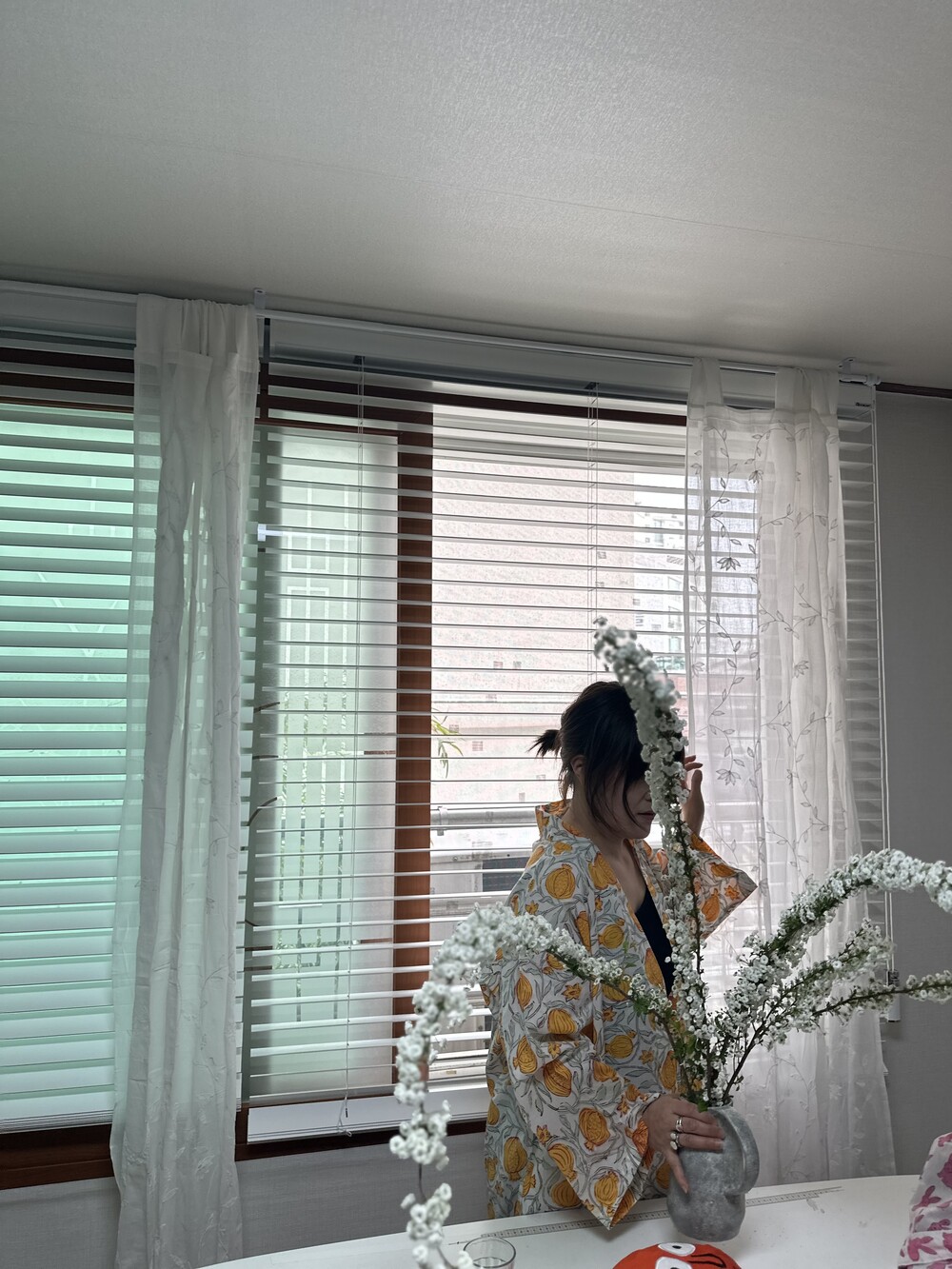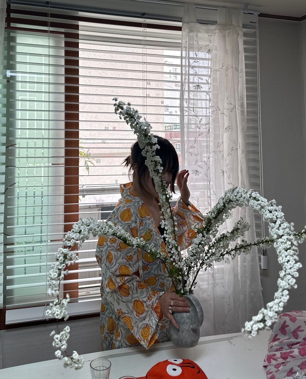 로브는 손목이 나오게 입어야 젤 예뻐요.손목 나오는 기장과 드레시한 느낌의 패턴으로 기장은 115-118정도에요. 기장이 좀 더 짧으면 좋겠다하시면 기장을 메모해주세요❤️ 면 백퍼센트이고 정말 사랑스러운 수선화와 석류 청화뱍자에요❤️