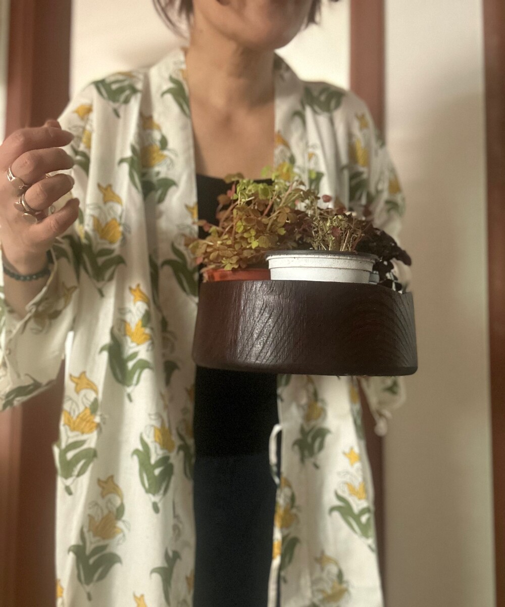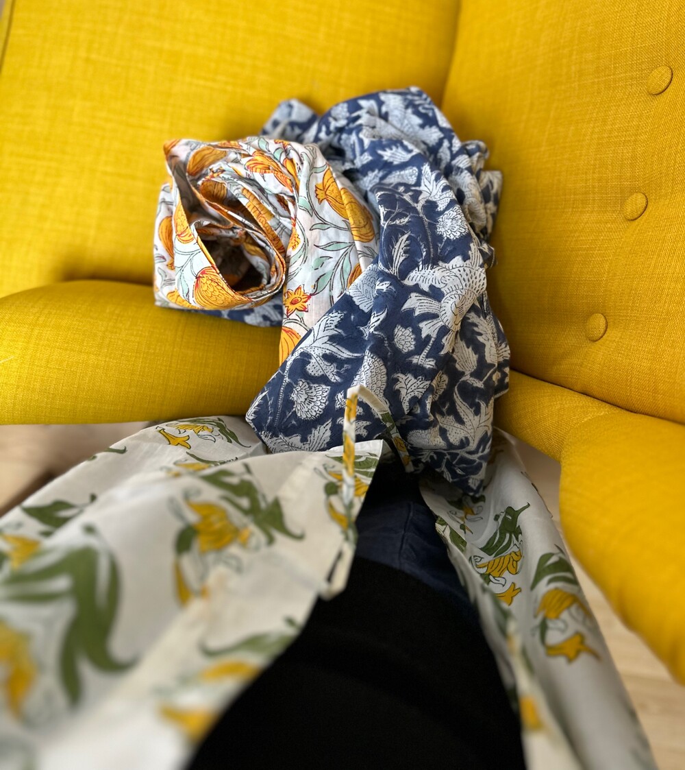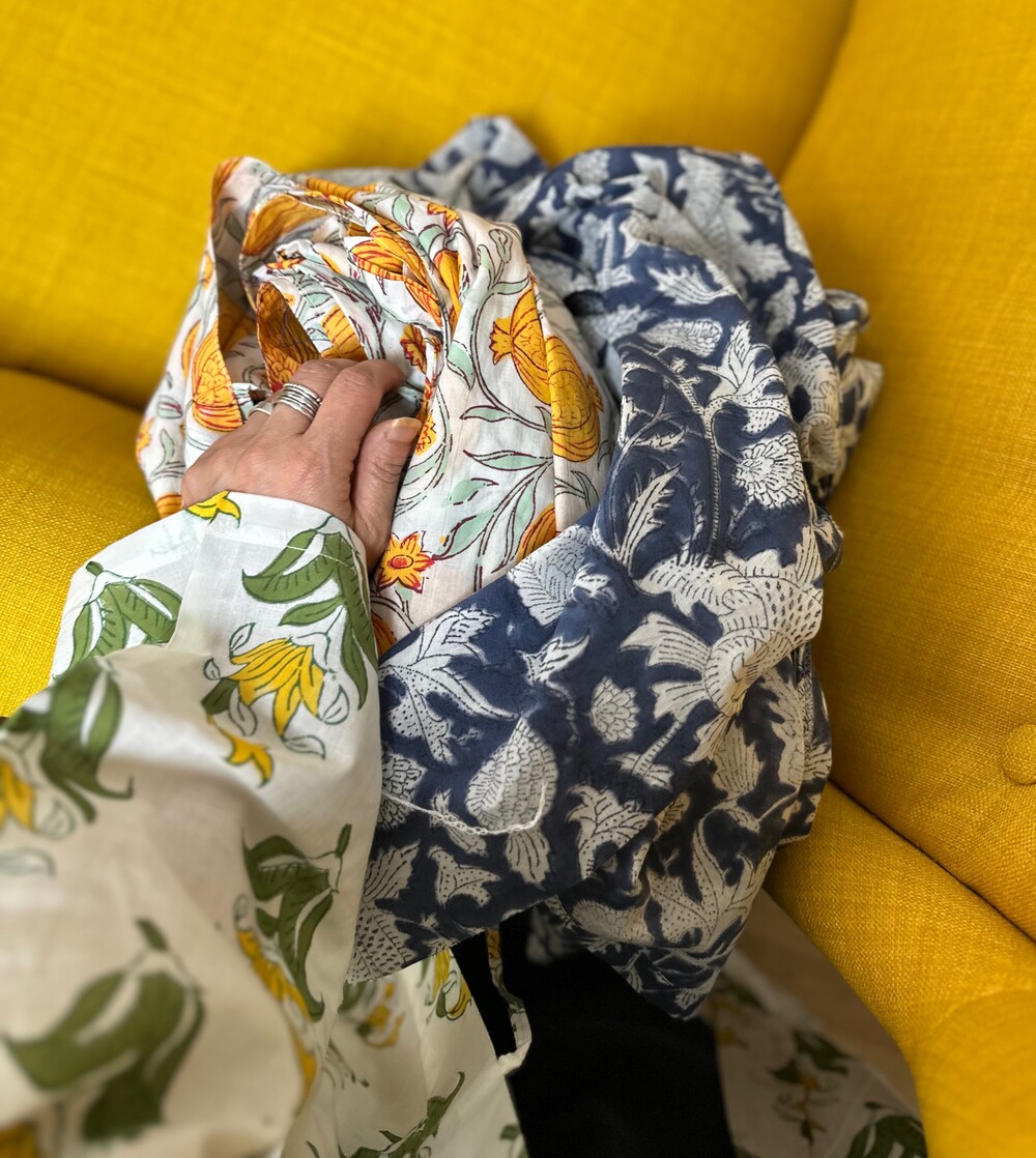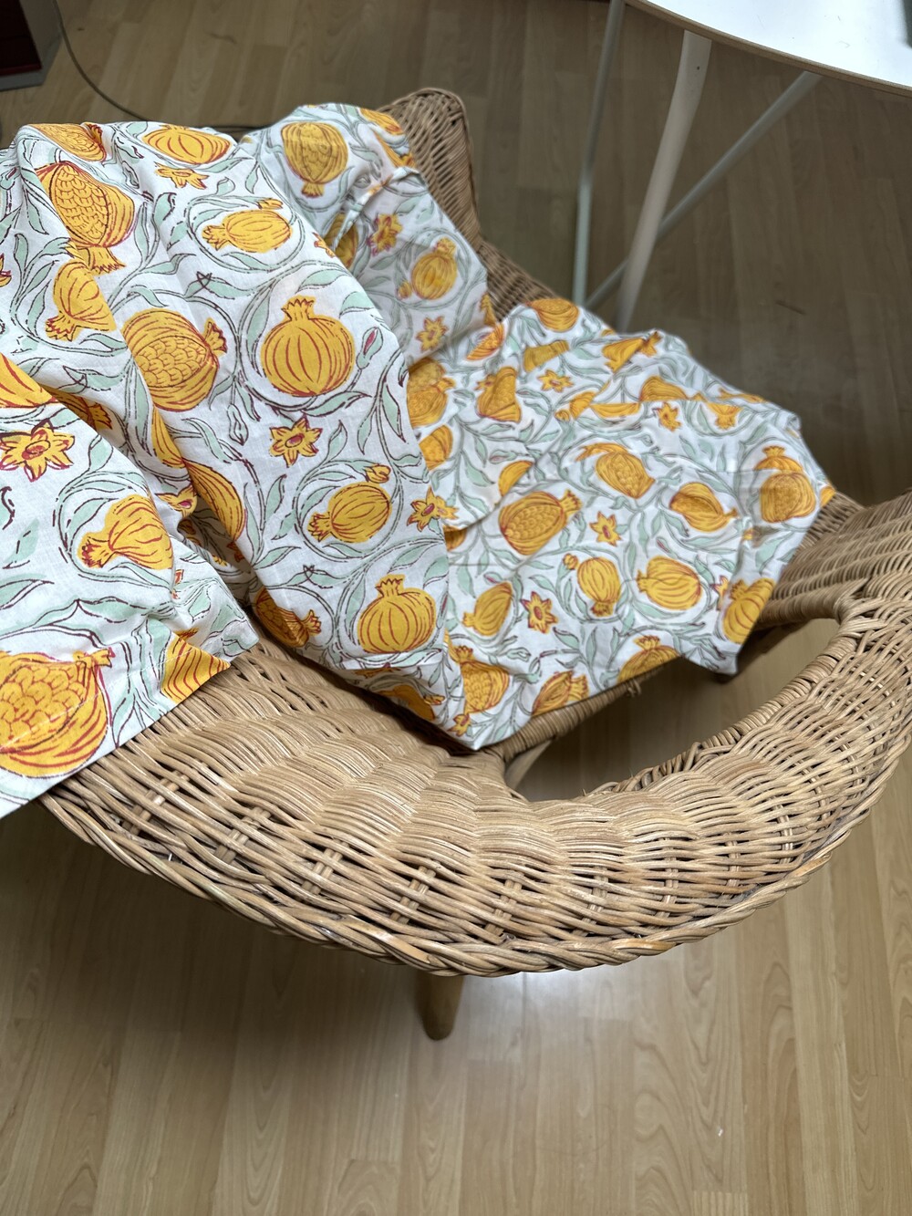 로브는 손목이 나오게 입어야 젤 예뻐요.손목 나오는 기장과 드레시한 느낌의 패턴으로 기장은 115-118정도에요. 기장이 좀 더 짧으면 좋겠다하시면 기장을 메모해주세요❤️ 면 백퍼센트이고 정말 사랑스러운 수선화와 석류 청화뱍자에요❤️