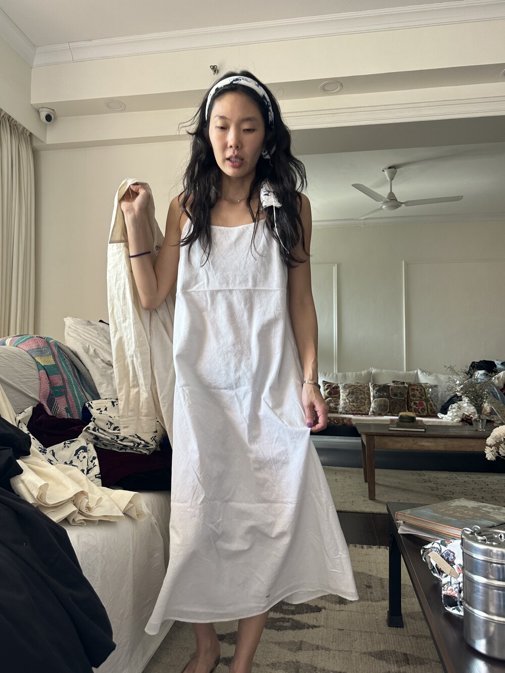 카디라는 직기소재의 면으로 만들어진 슬립드레스이고 소재가 주는 아름다움이있고 라이닝이있어 비침 걱정 안하셔도되요. 정말 고급스러운 컬러와 디자인이며 여성스럽고 우아한 디자인이에요. 같이 입으시기 좋은 블랙커버업은 포플린소재로 멋스러워요 사계절 다 잘 입으실수있어요,드레스 끈길이는 32센티미터이고 진동둘레는 33센티 기장은 109센티이고 가슴둘레 46(55-66) 그리고 가슴둘레 54-60라지사이즈이고 기장과 모두 동일해요,바이어스 재단으로 입으시면 잘 맞게 늘어나요.블랙커버업 기장은 103-4이고 미듐은 가슴둘레는 54이고 (55-66사이즈분들)라지는 그이상 사이즈분들주문주세요.