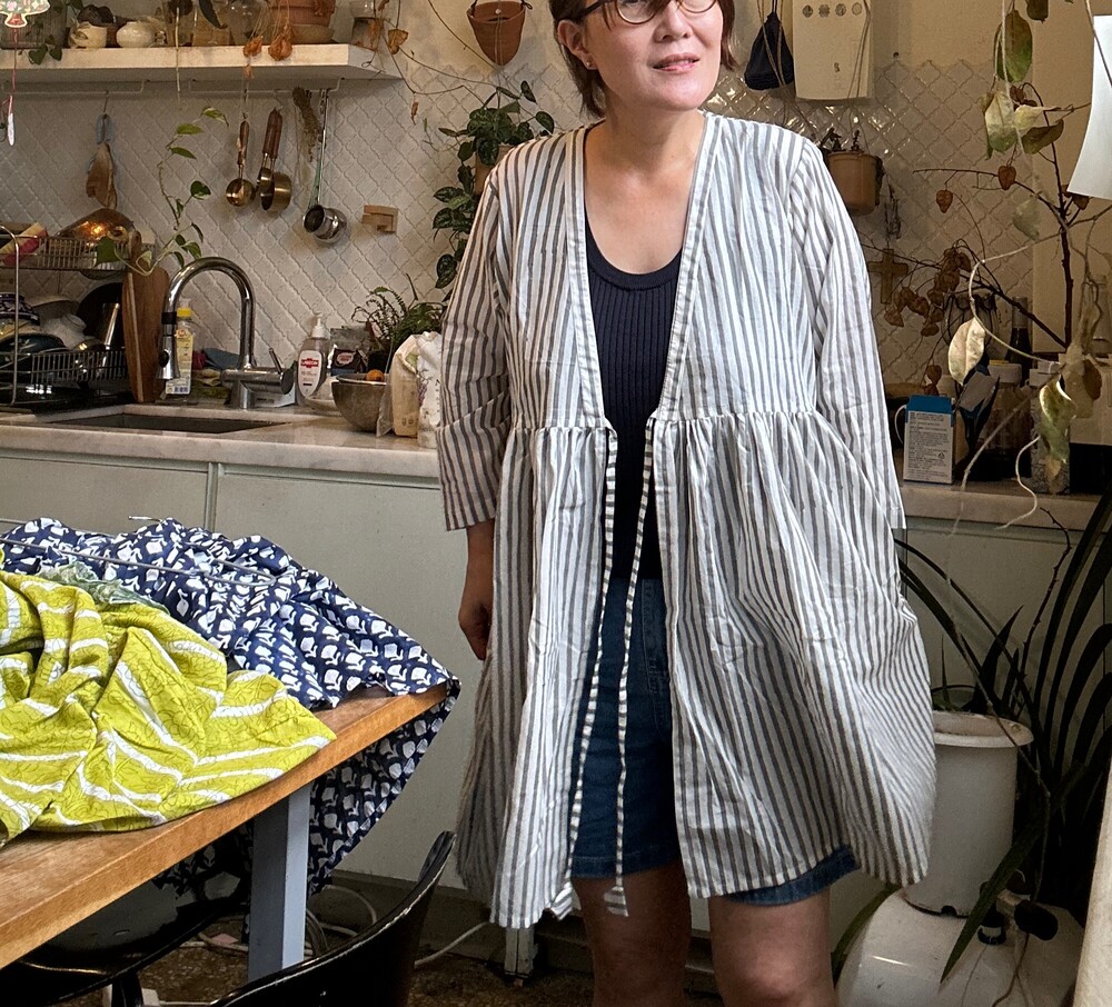 중간 바스트라인까지 43센티에요.끈으로 묶으셔도 되고 풀러놓으셔도 되는 편안한 디자인이고 주머니도 있어요.베냇저고리의 길고 담주부터 순차발송되요❤️ 면소재이고 블루만 처음세탁시 단독세탁 부탁드려요.