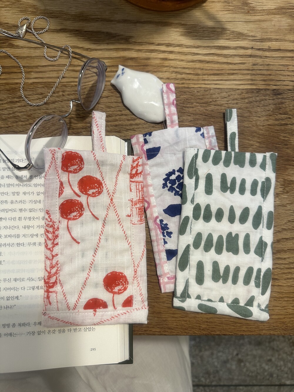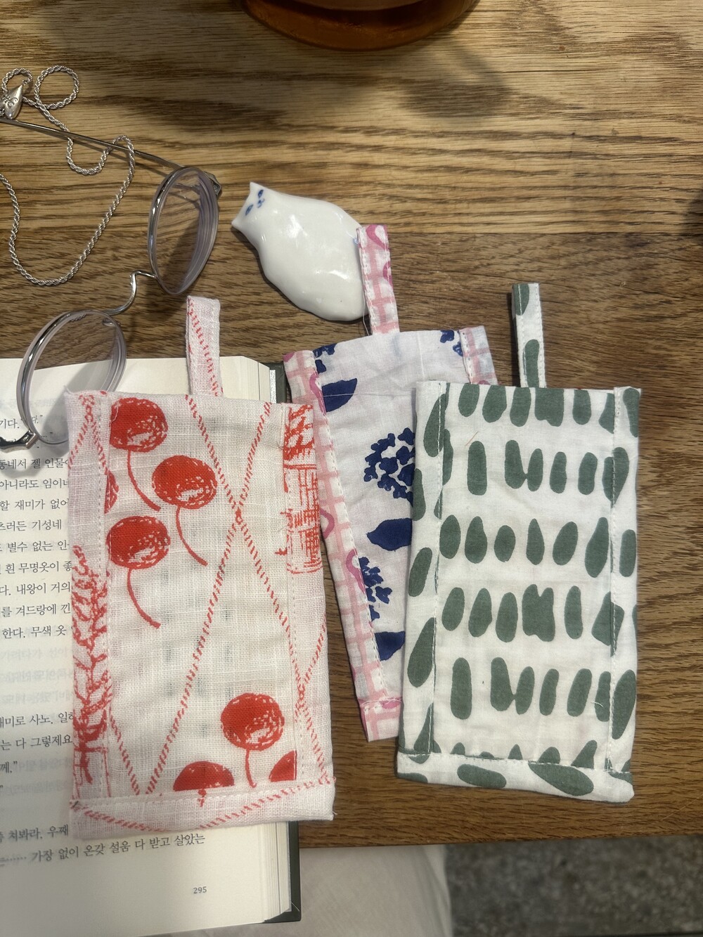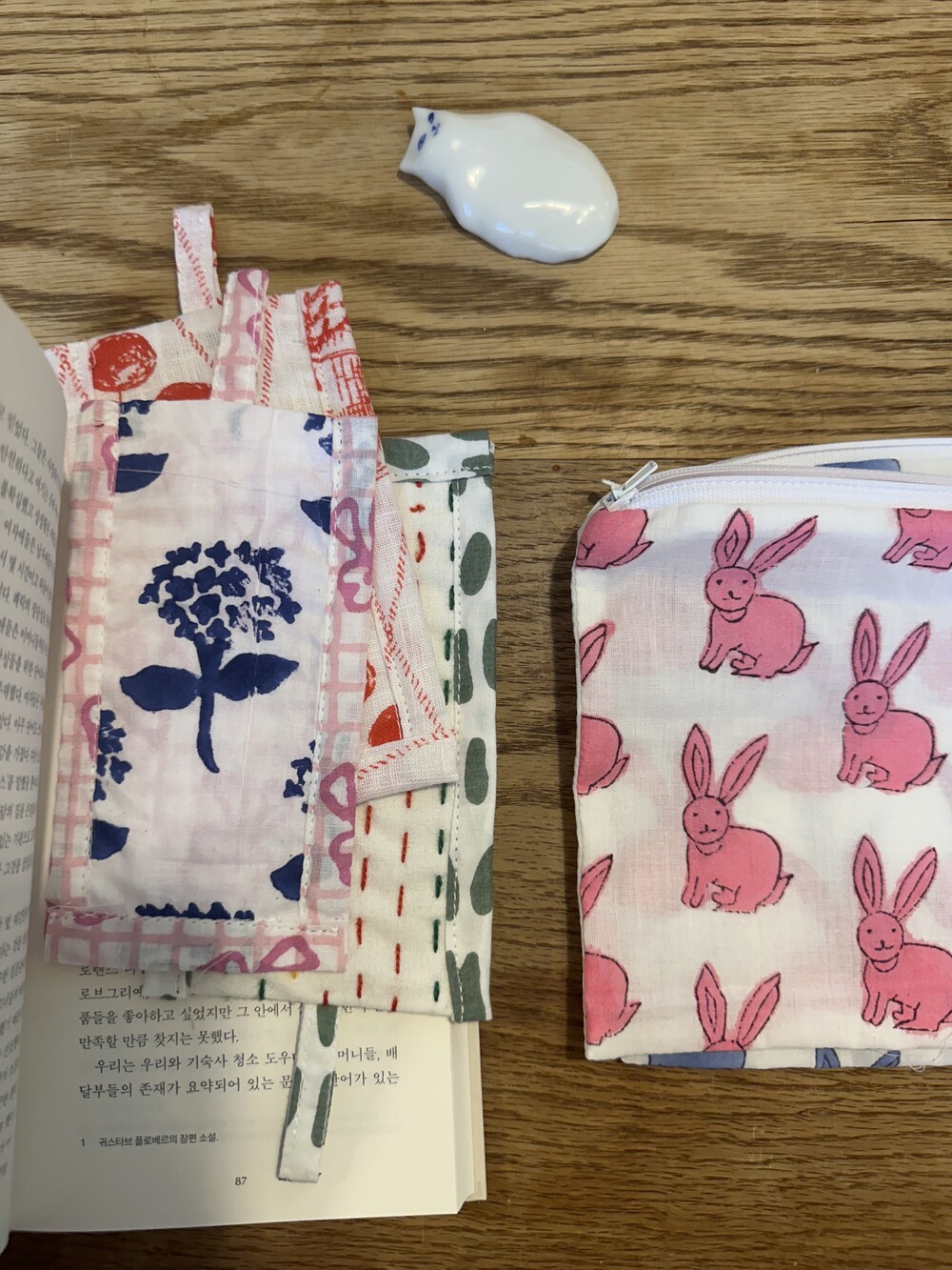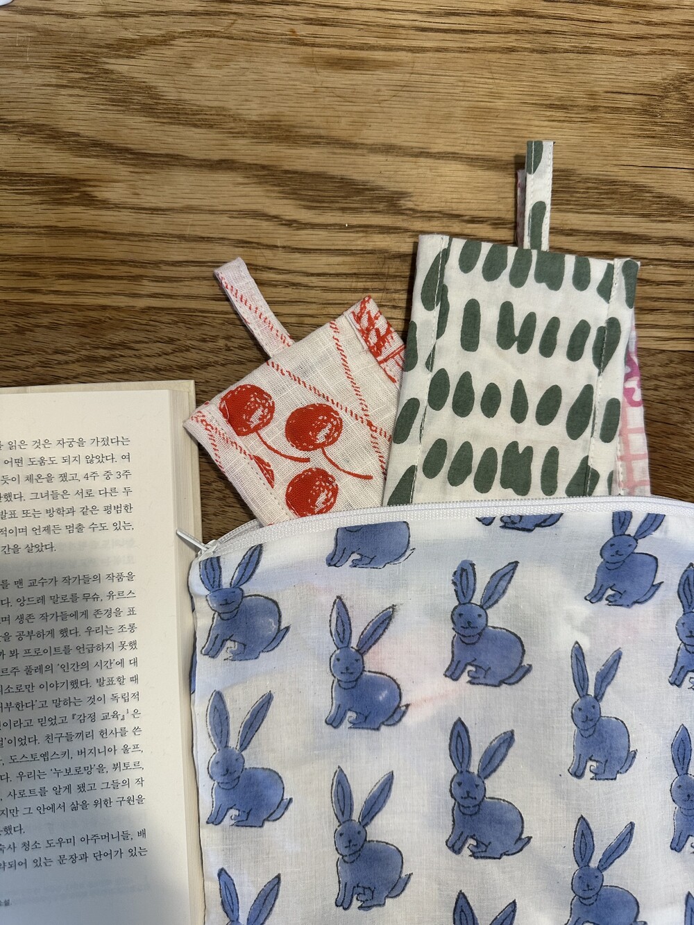 책갈피 3종과 지퍼 파우치 샛트.책갈피는 랜덤이에요.