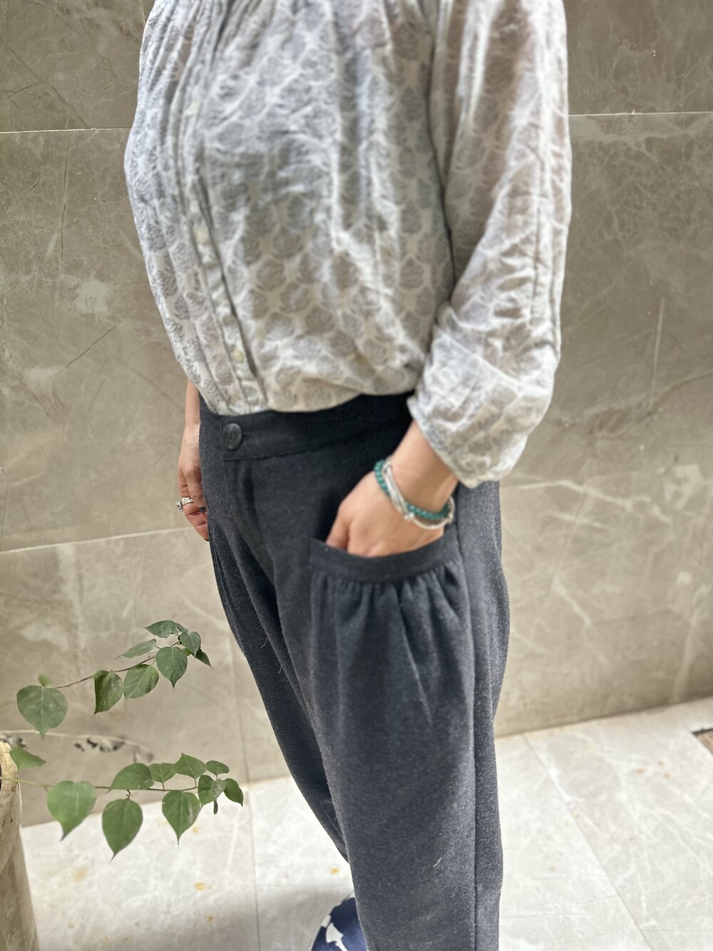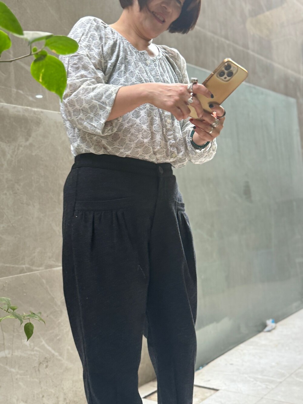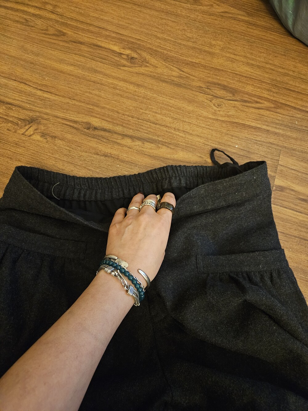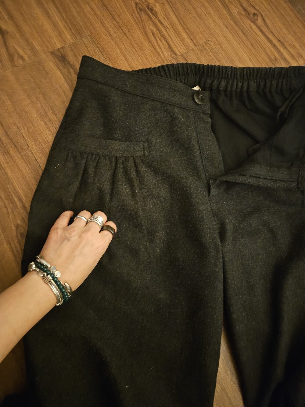 제가 입은 사이즈는 미듐이고 울 소재의 팬츠에요.기장 85이고 허리는 뒷 고무 밴딩과 단추마감이에요 .