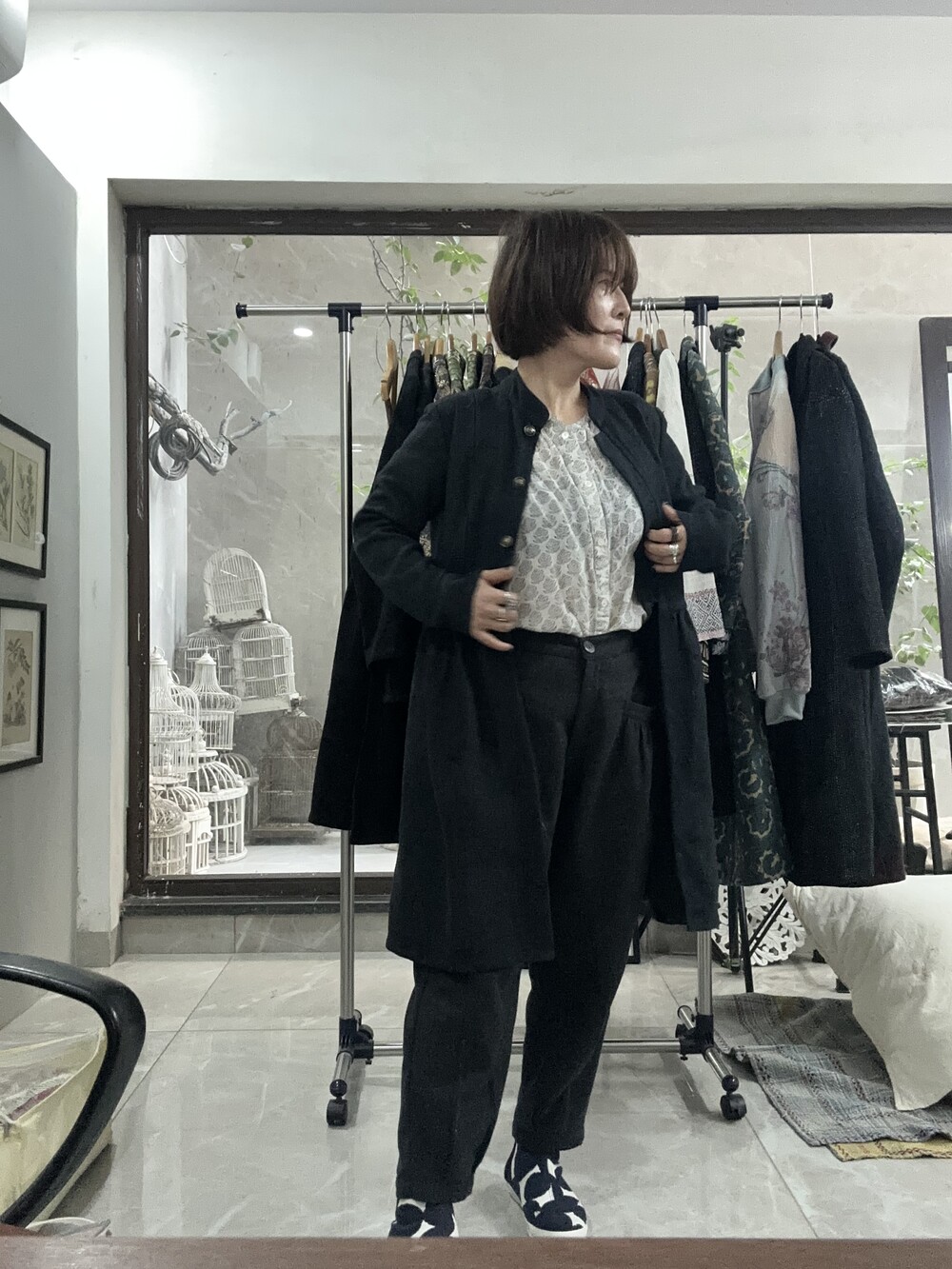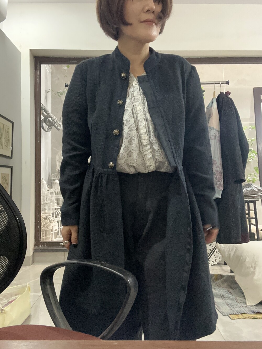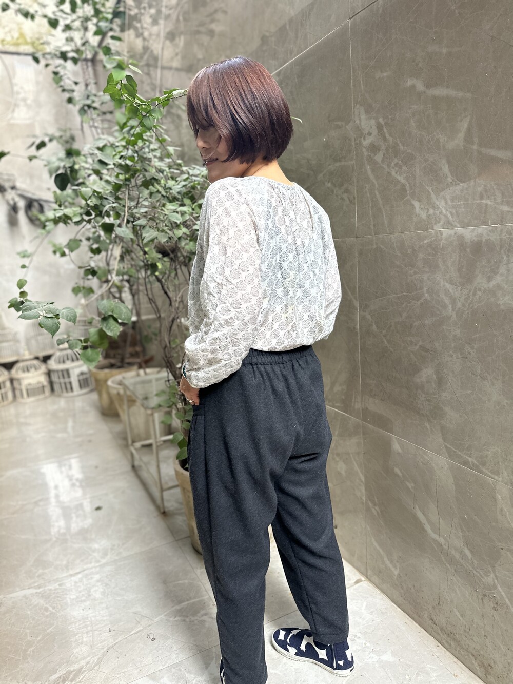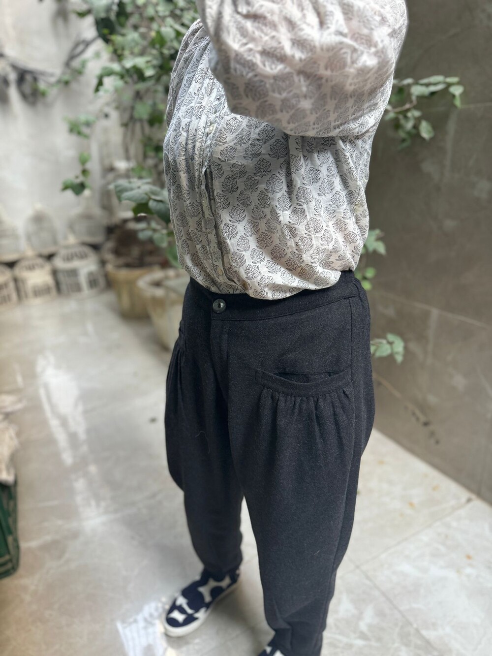 제가 입은 사이즈는 미듐이고 울 소재의 팬츠에요.기장 85이고 허리는 뒷 고무 밴딩과 단추마감이에요 .
