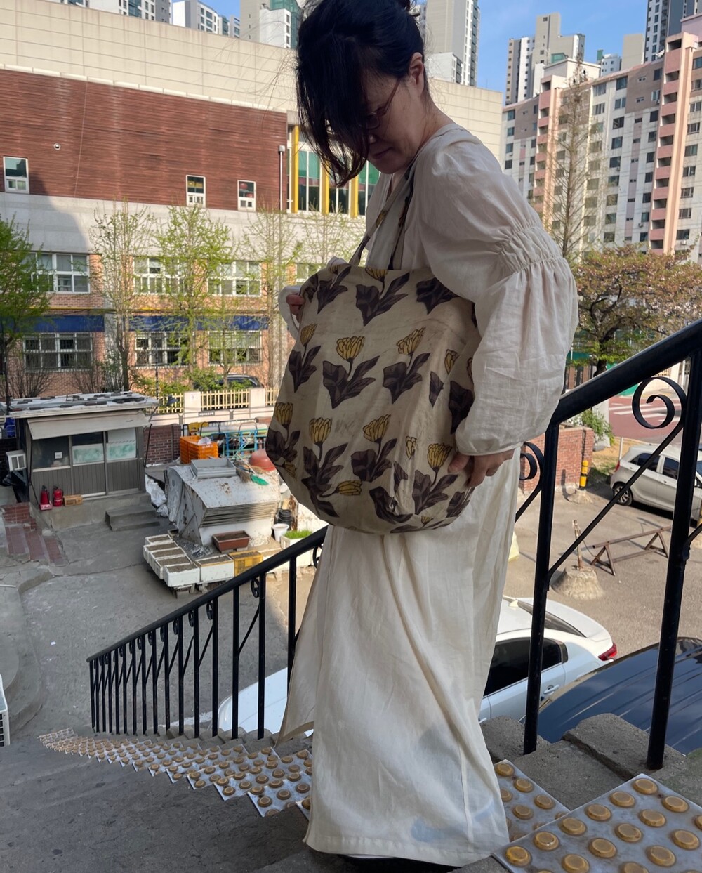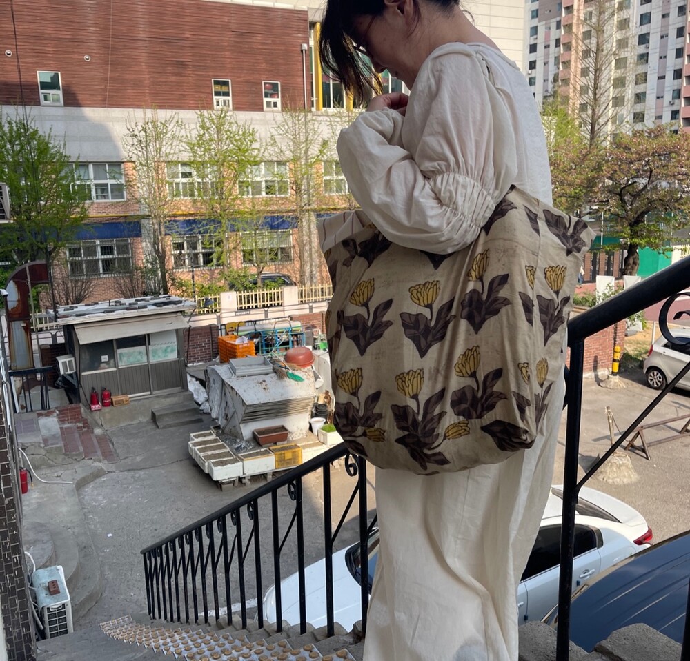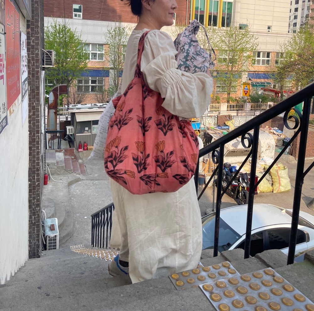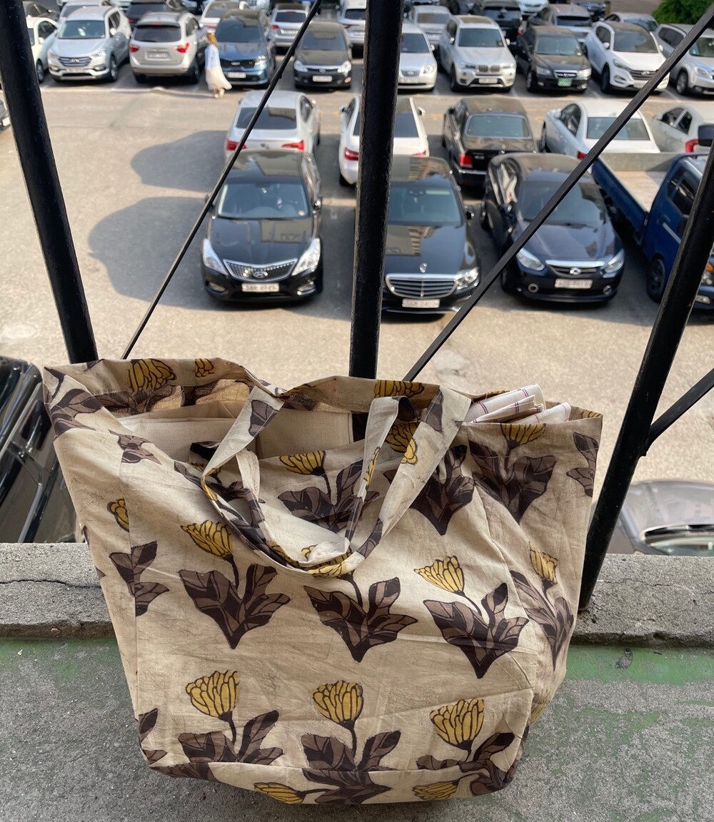 두께는 면 60수이며 얇은면으로 두껍지는 않지만 물건을 아주 무거운것만 담지않으시면 되는 정도입니다.단독세탁 찬물세탁이 좋습니다.
