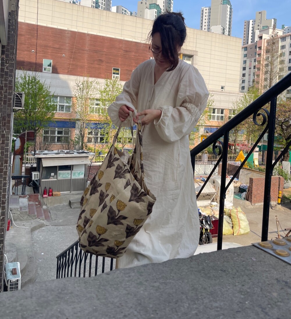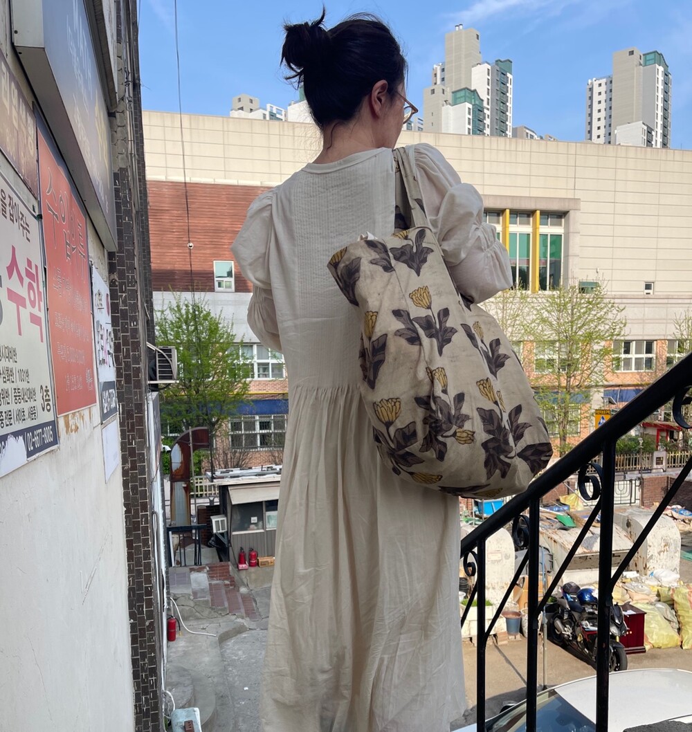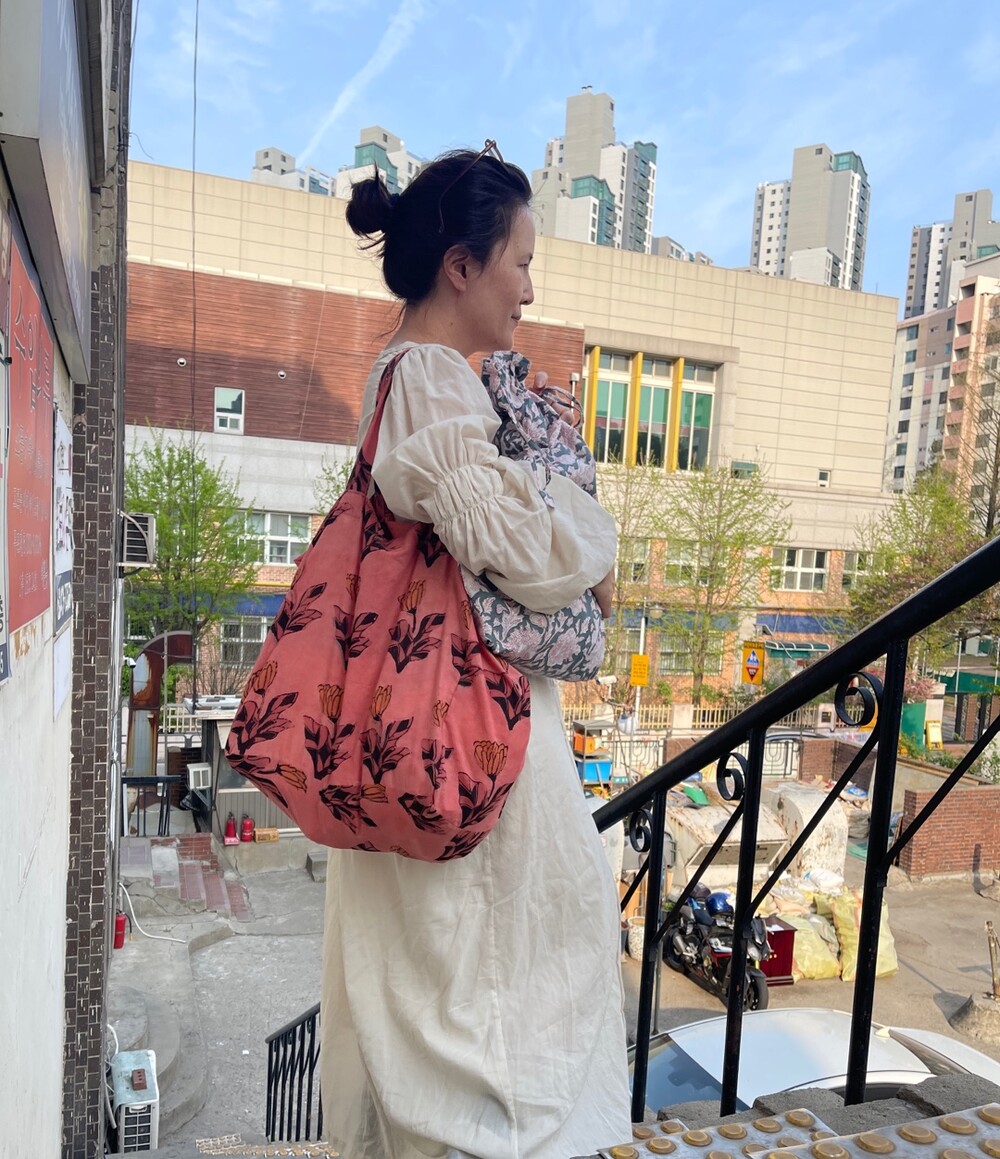두께는 면 60수이며 얇은면으로 두껍지는 않지만 물건을 아주 무거운것만 담지않으시면 되는 정도입니다.단독세탁 찬물세탁이 좋습니다.