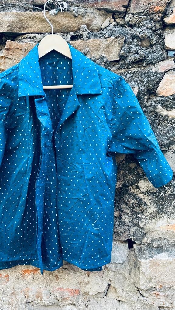 인디고 블루 컬러의 더비스 셔츠에요 직기짜임이고,