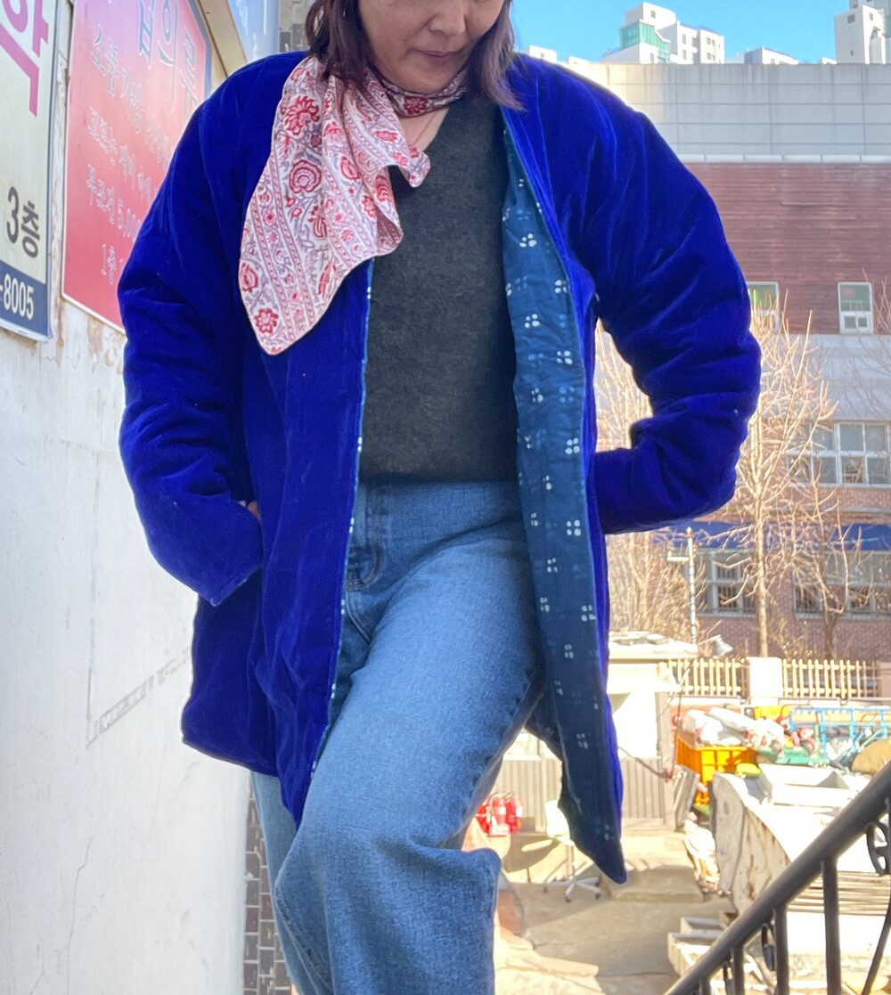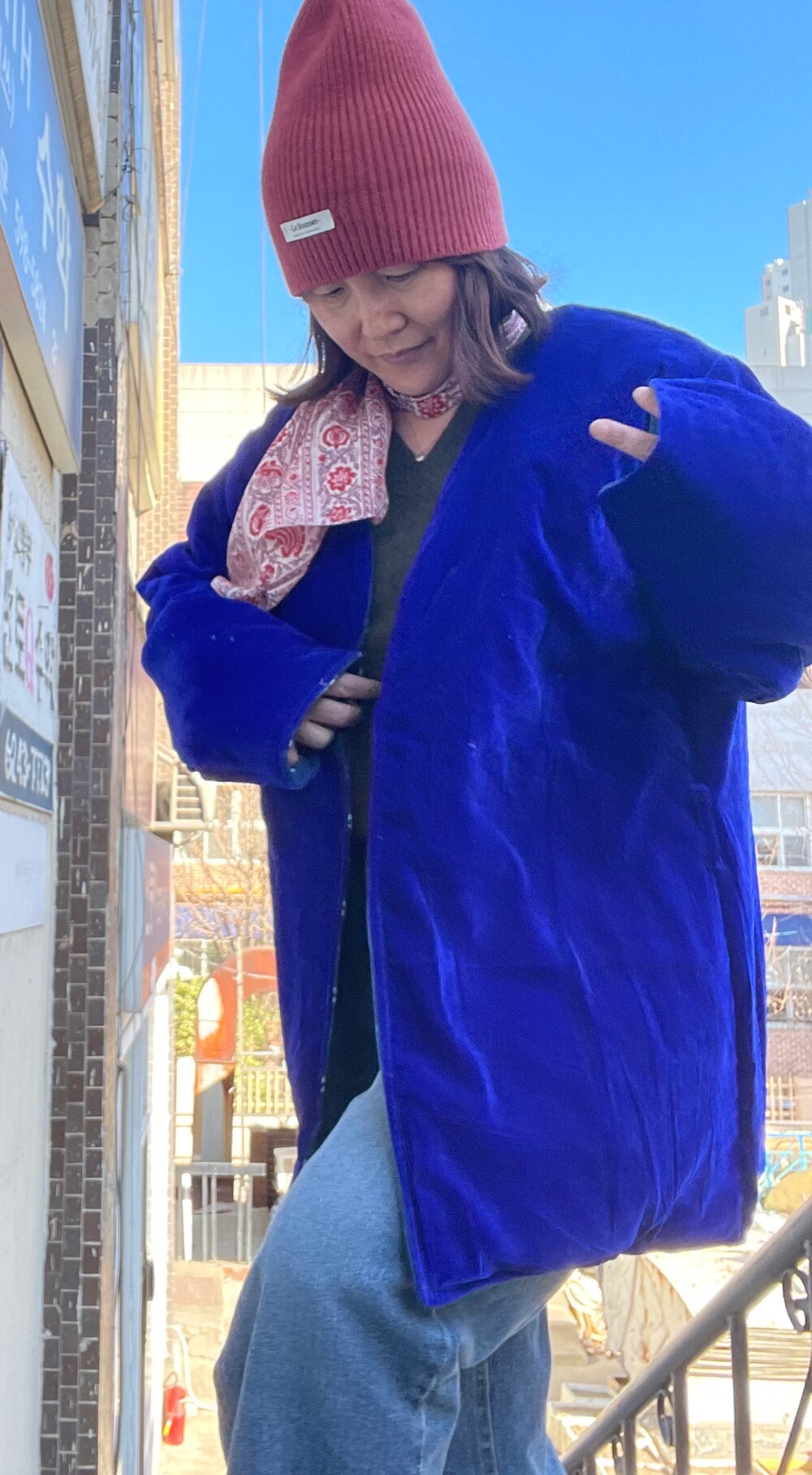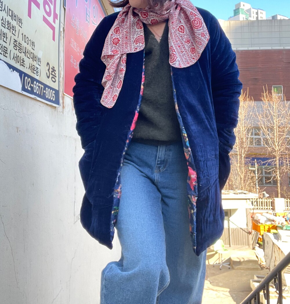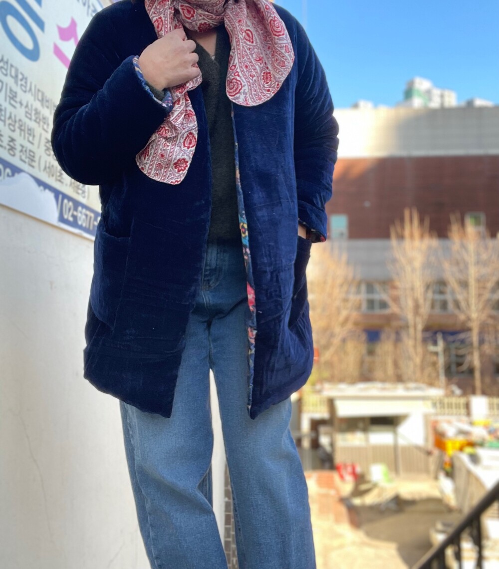 인도의 면벨벳이에요 촉감도 넘 좋고 실키한 감촉으로 좌르르 벨벳이에요.가슴둘레는 뭐 완전 넉넉히 62정도이구요 소매도 61-62정도이고 기장은 85와 90 두가지로 진행됩니다.양면으로 입으실수있고 양면 모두 주머니 장착되어있으며 위에 코트입으시기도 좋고 패딩입으셔도되요