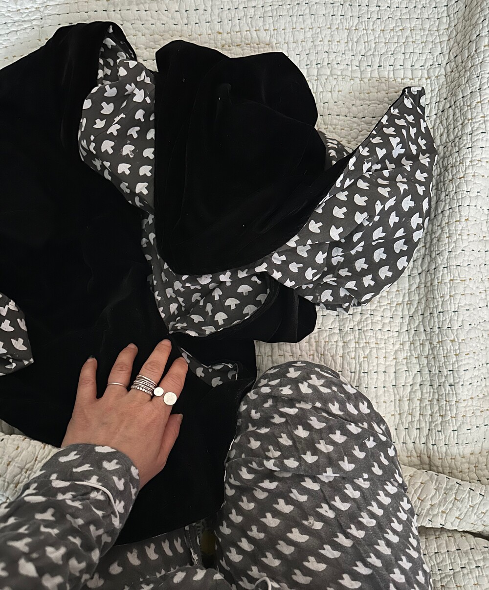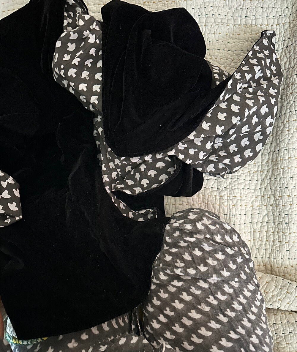 거즈를 블랙으로 염색후 세탁하니 차콜컬러처럼 오래된 그레이같은 아주 멋스럽고 시크한 거즈컬러와 촉감의 패브릭이되었어요.
