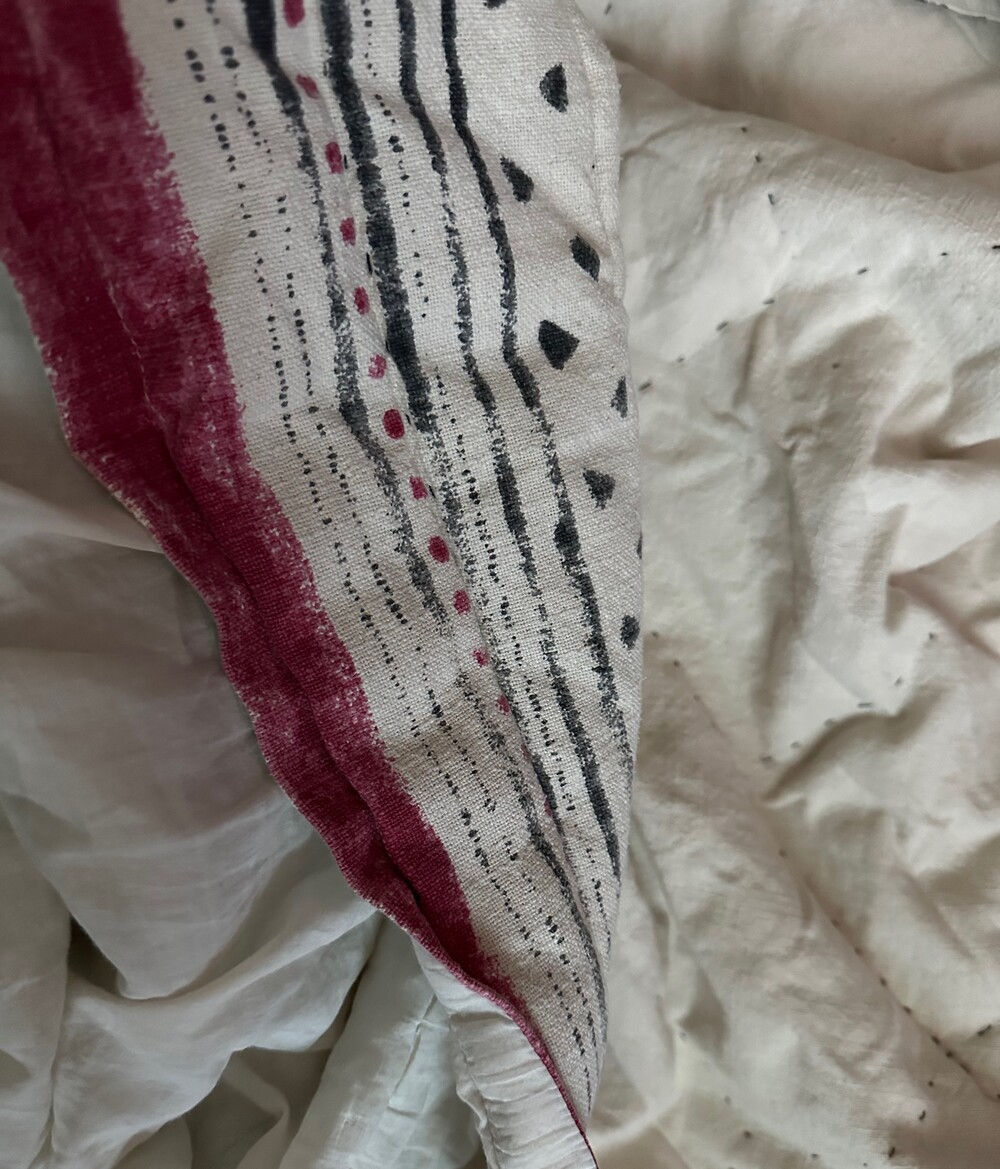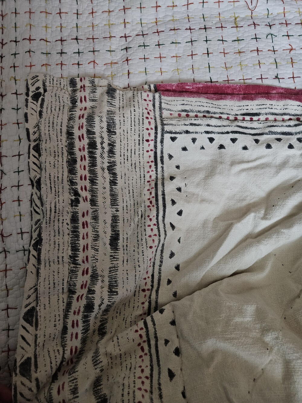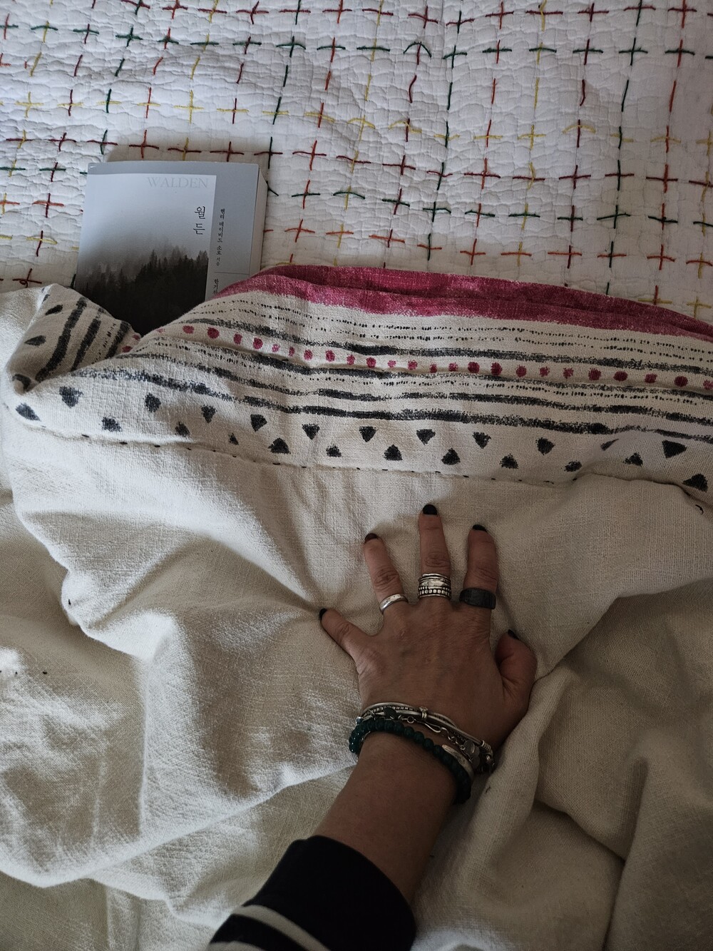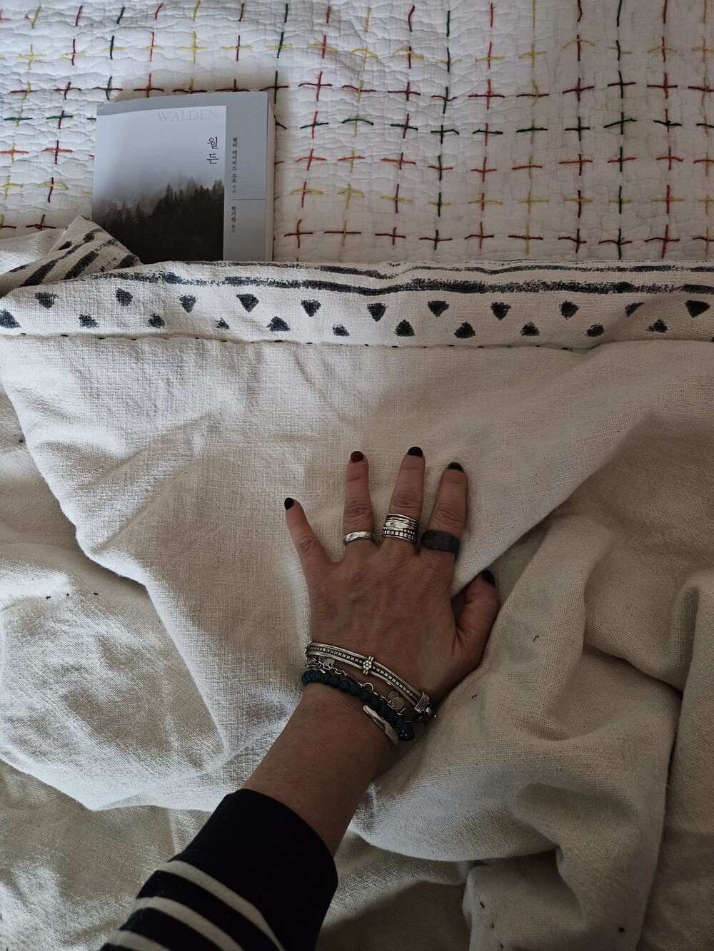 제가 붓터치느낌으로 그려서 만든 우드블럭프린팅의 이불이고