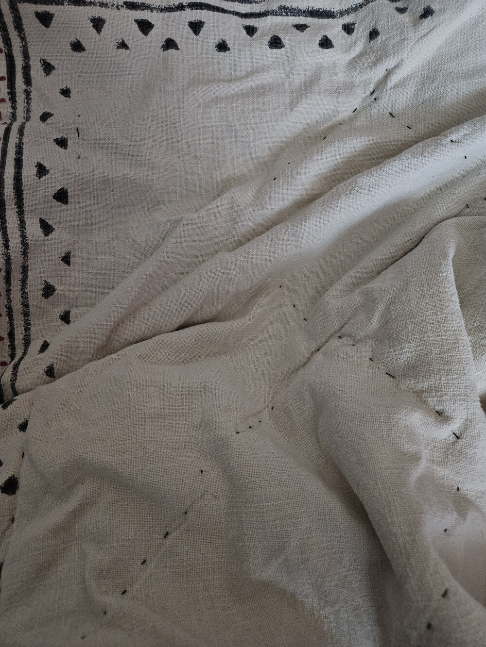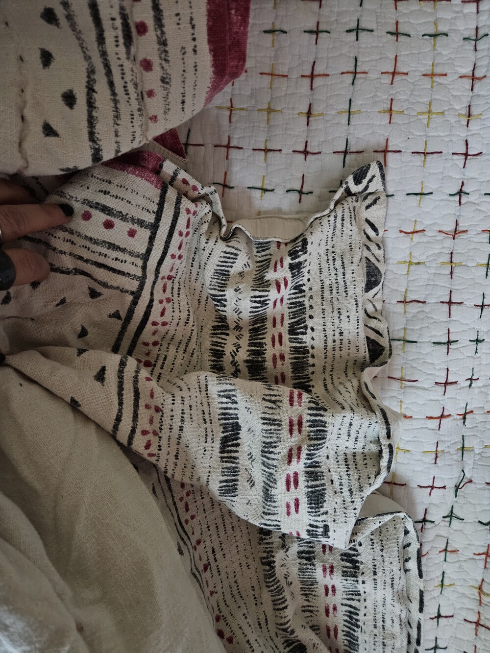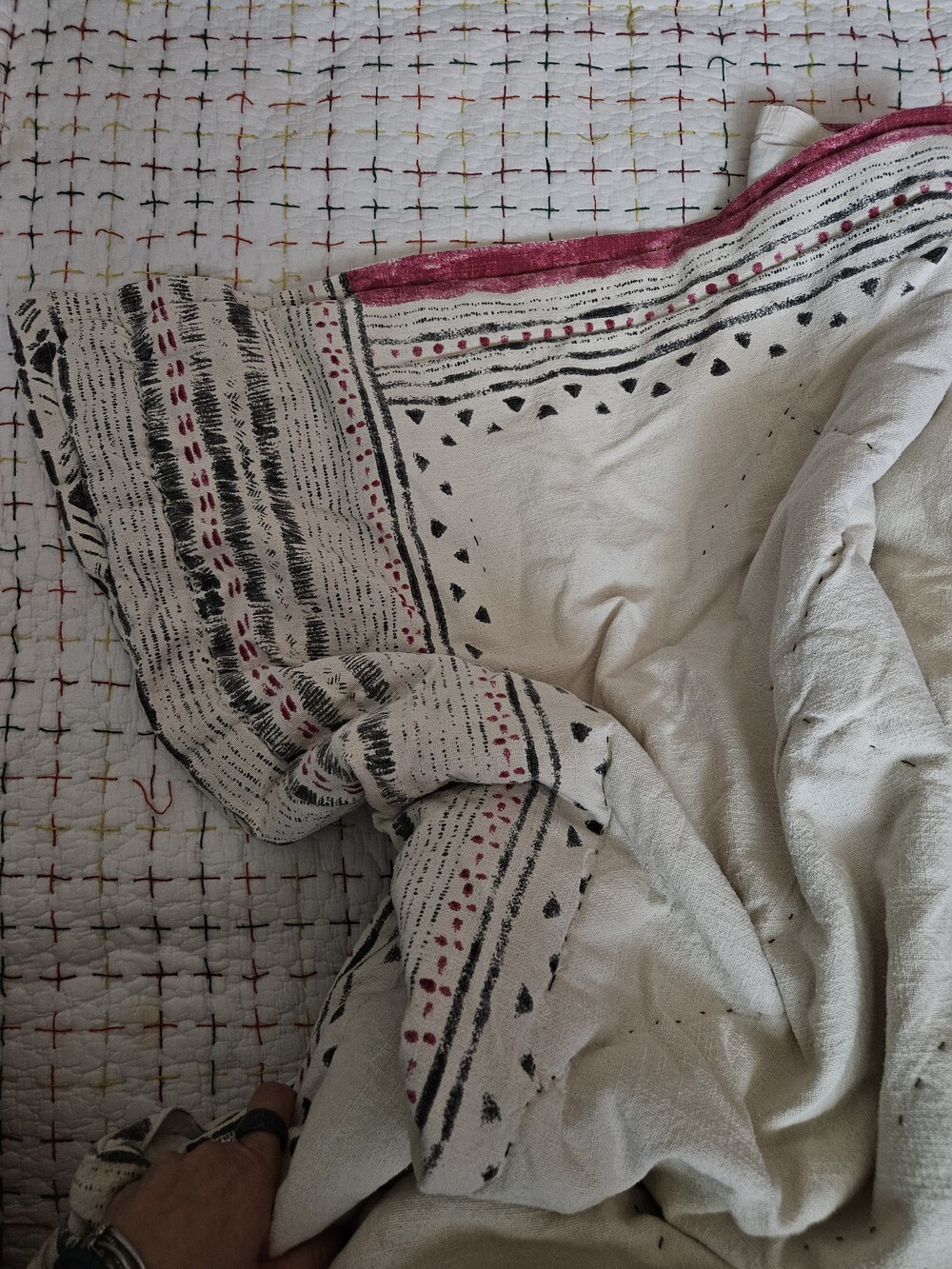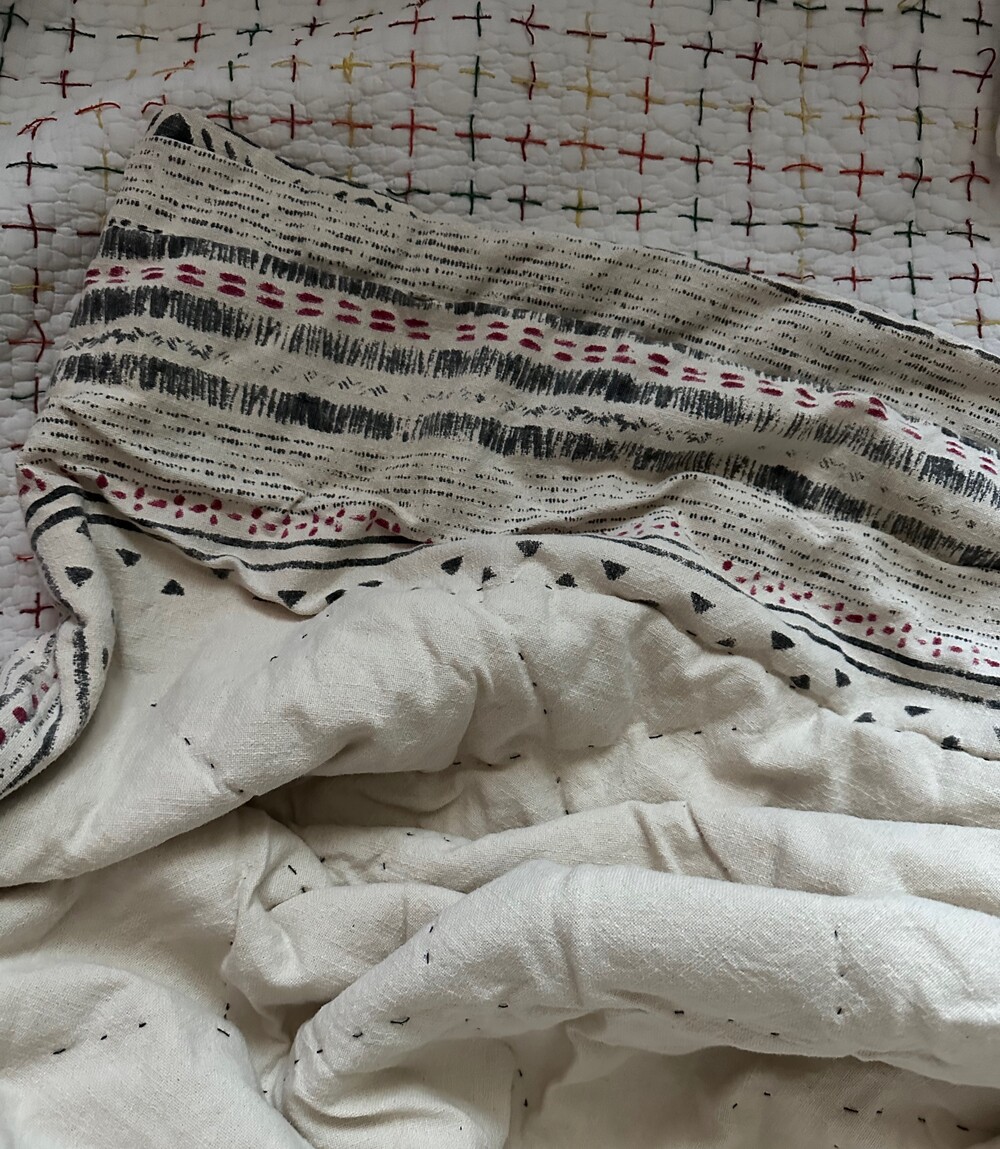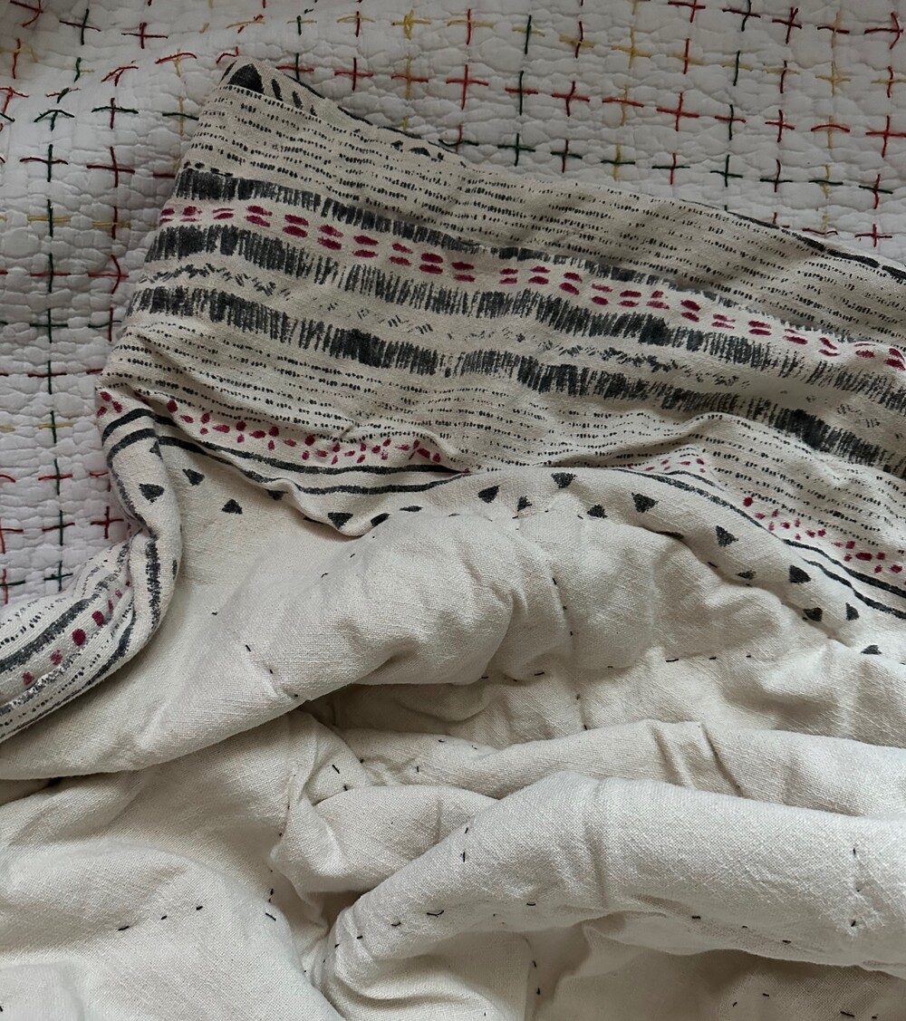 제가 붓터치느낌으로 그려서 만든 우드블럭프린팅의 이불이고