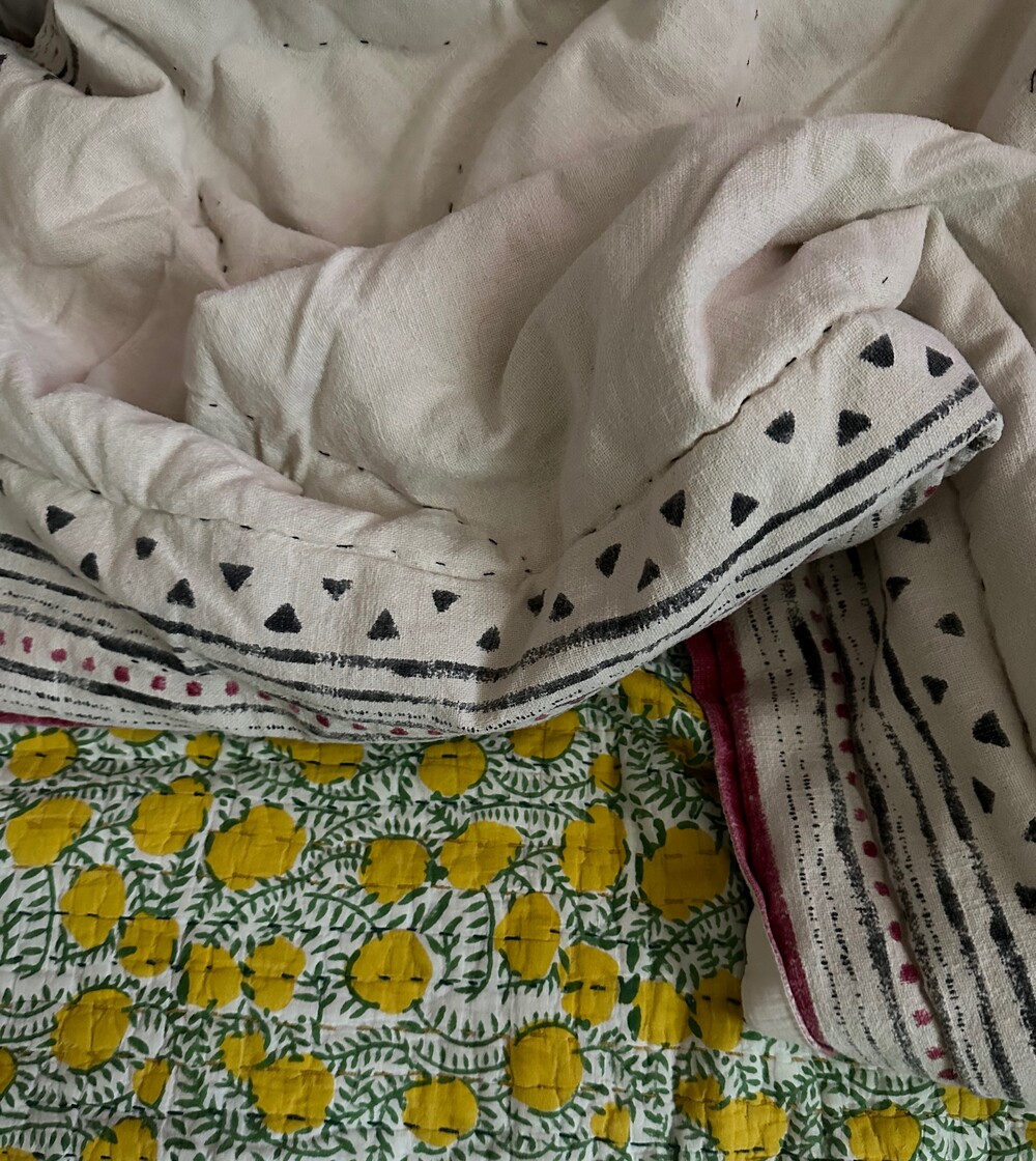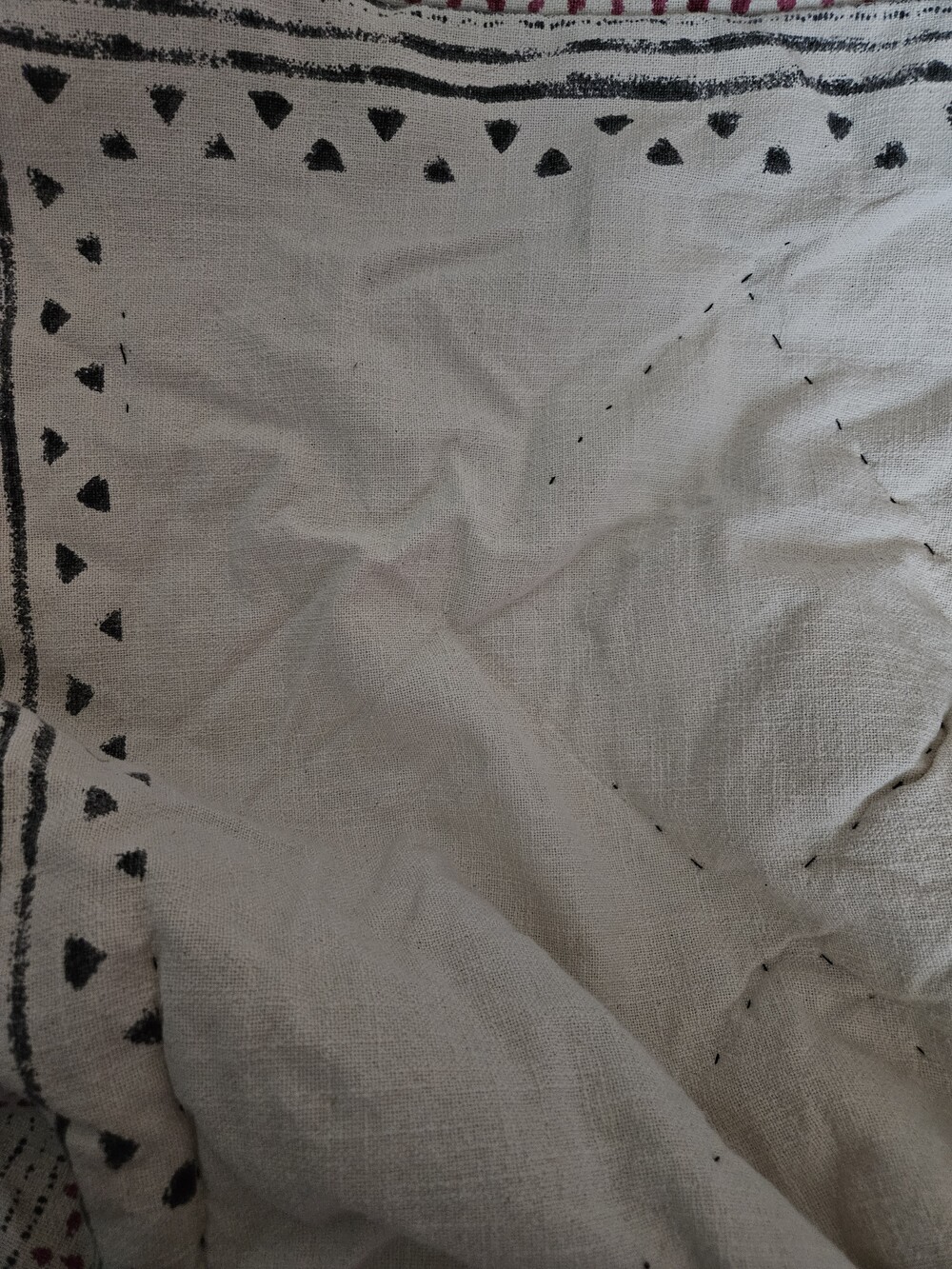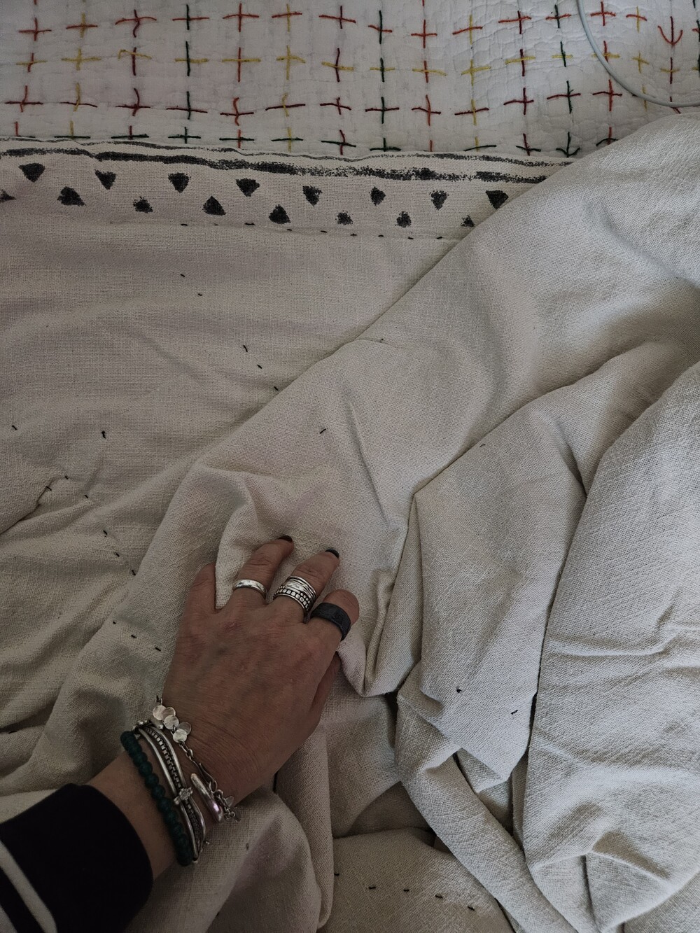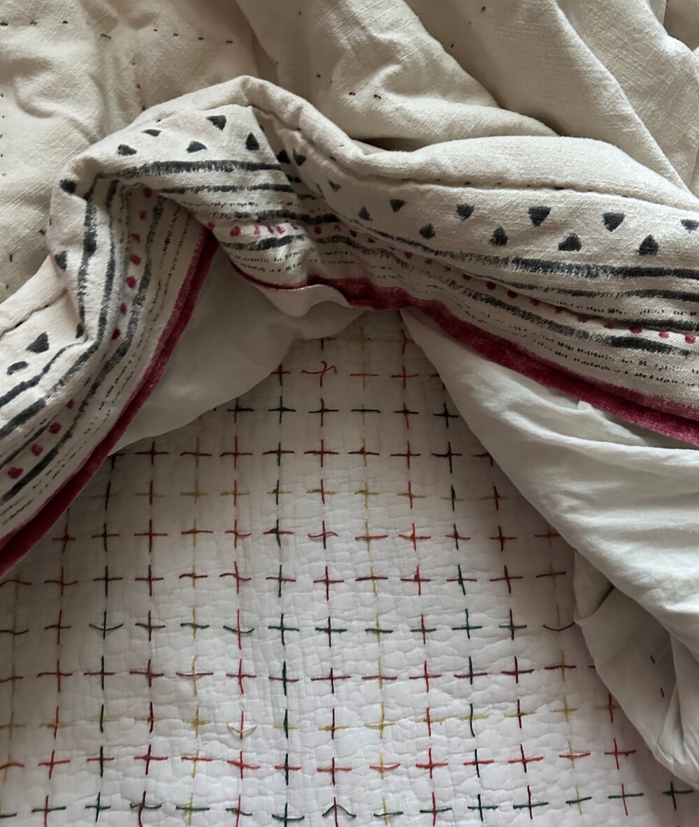 제가 붓터치느낌으로 그려서 만든 우드블럭프린팅의 이불이고