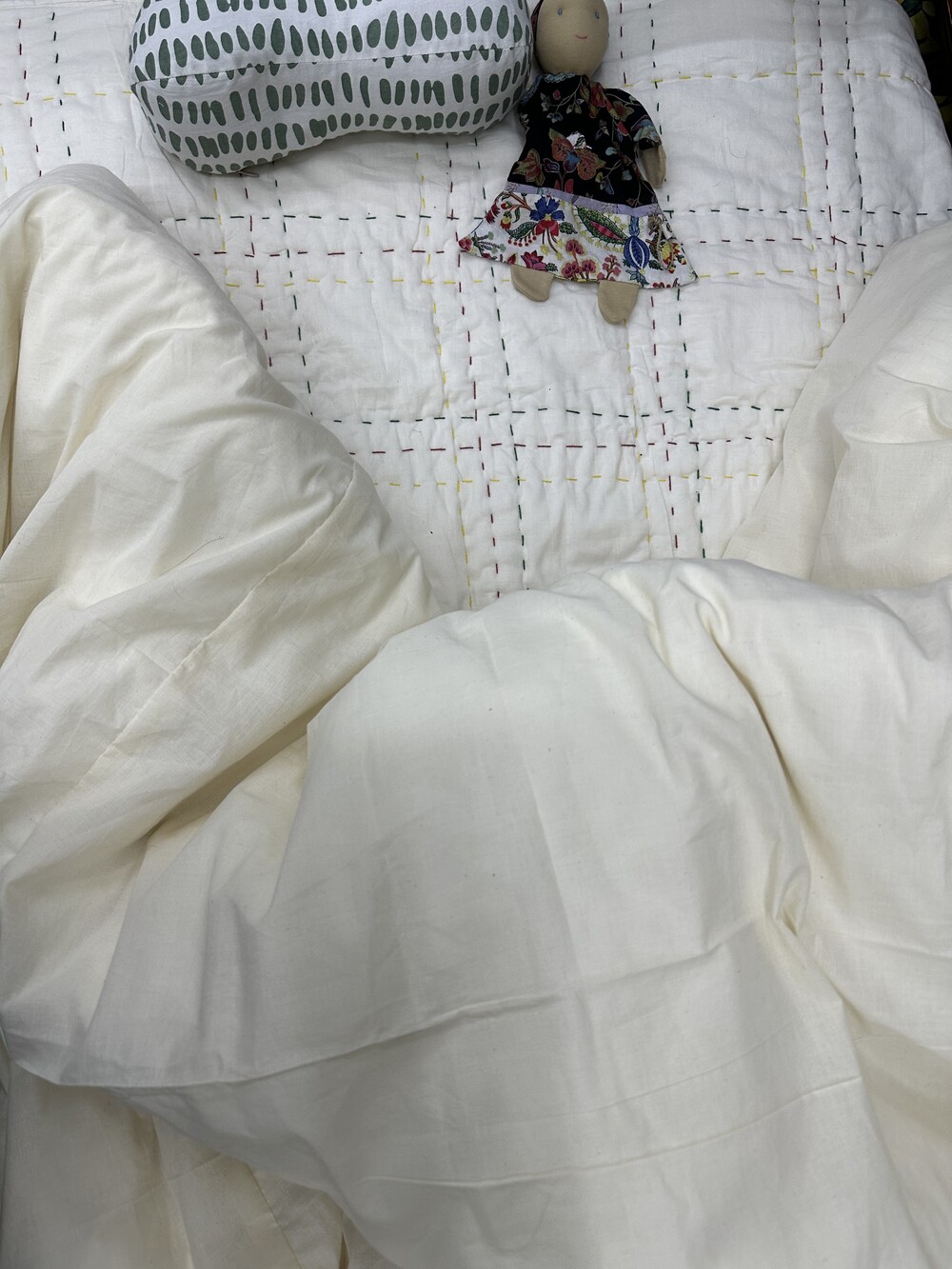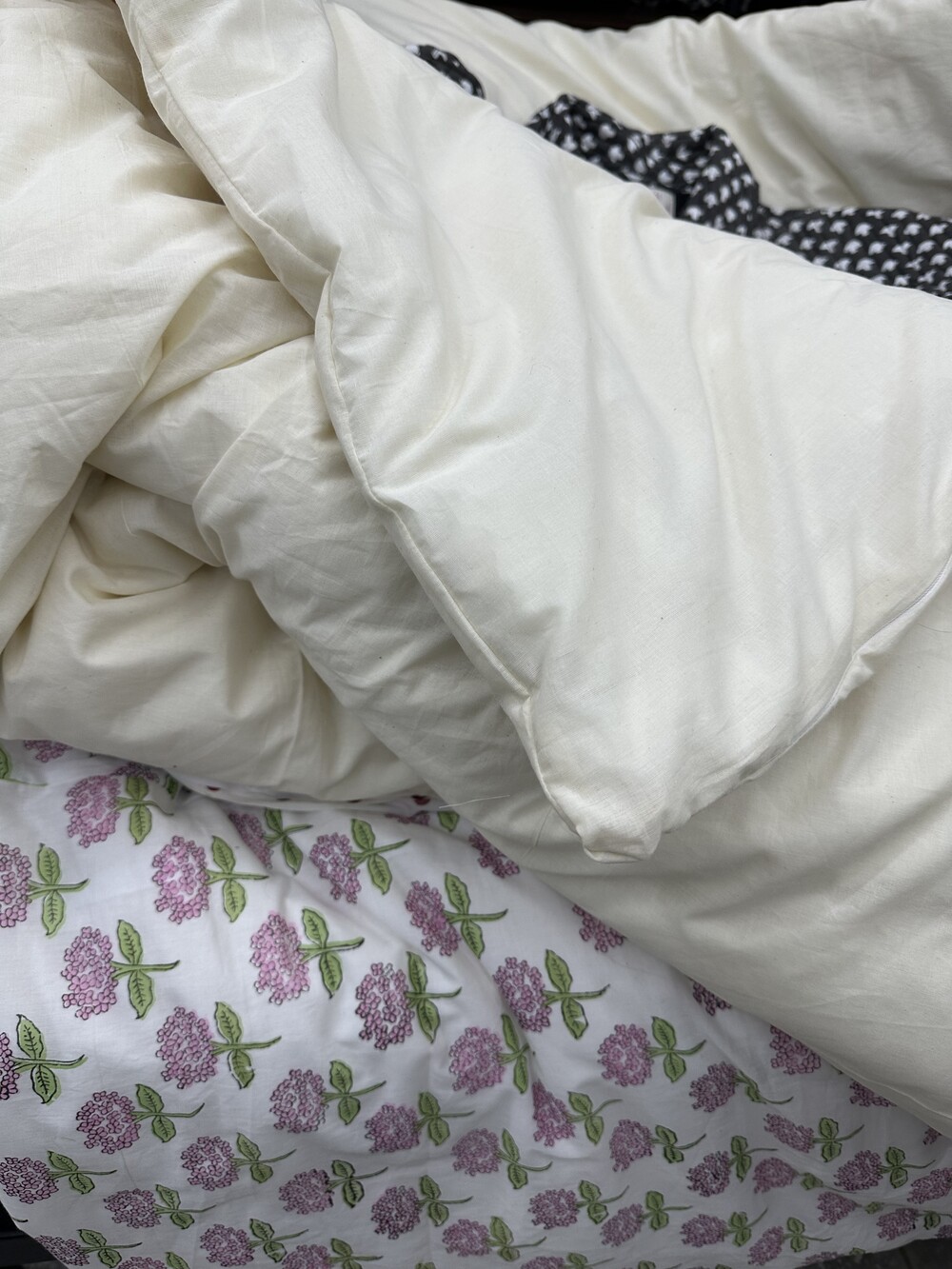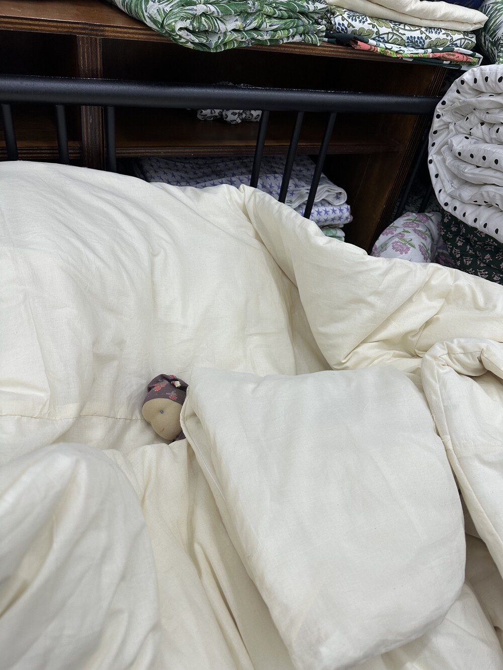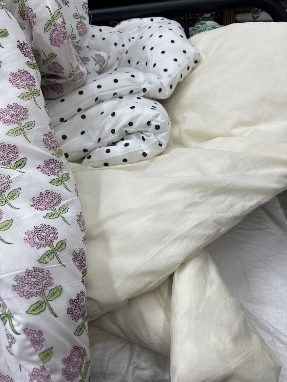 우리는 하루의 3분의 1을 이불속에서 살아요.전 유난히 이불과 속옷 잠옷의 촉감에 민감해요 .두께별로 이불이 다 필요하고요 ㅎㅎㅎ양옆을 리본으로 묶어 고정하는 형태이고 목화솜은 묵직하게 눌러줄만큼 아주 많이 들어가는 목화솜통 분리 이불이에요.