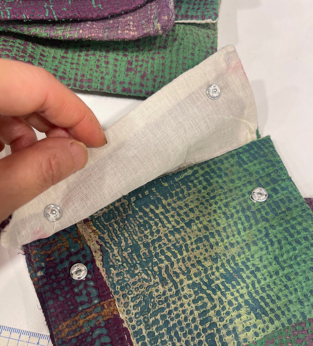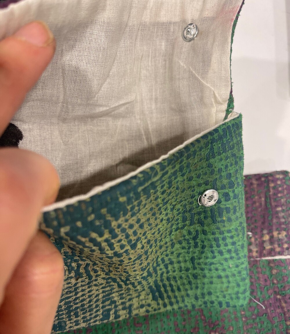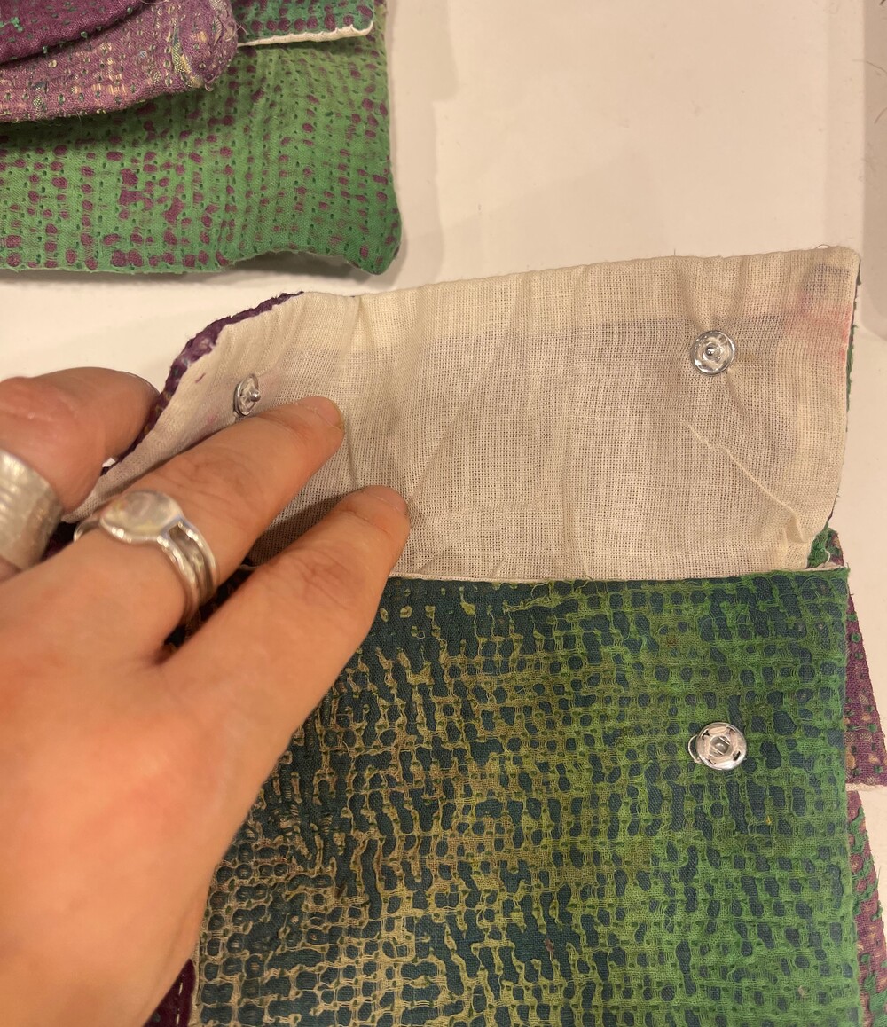 안감에 면으로 덧대어있고 똑딱단추로 마감되어 손느낌이 강한 정겨운 아이템이에요.