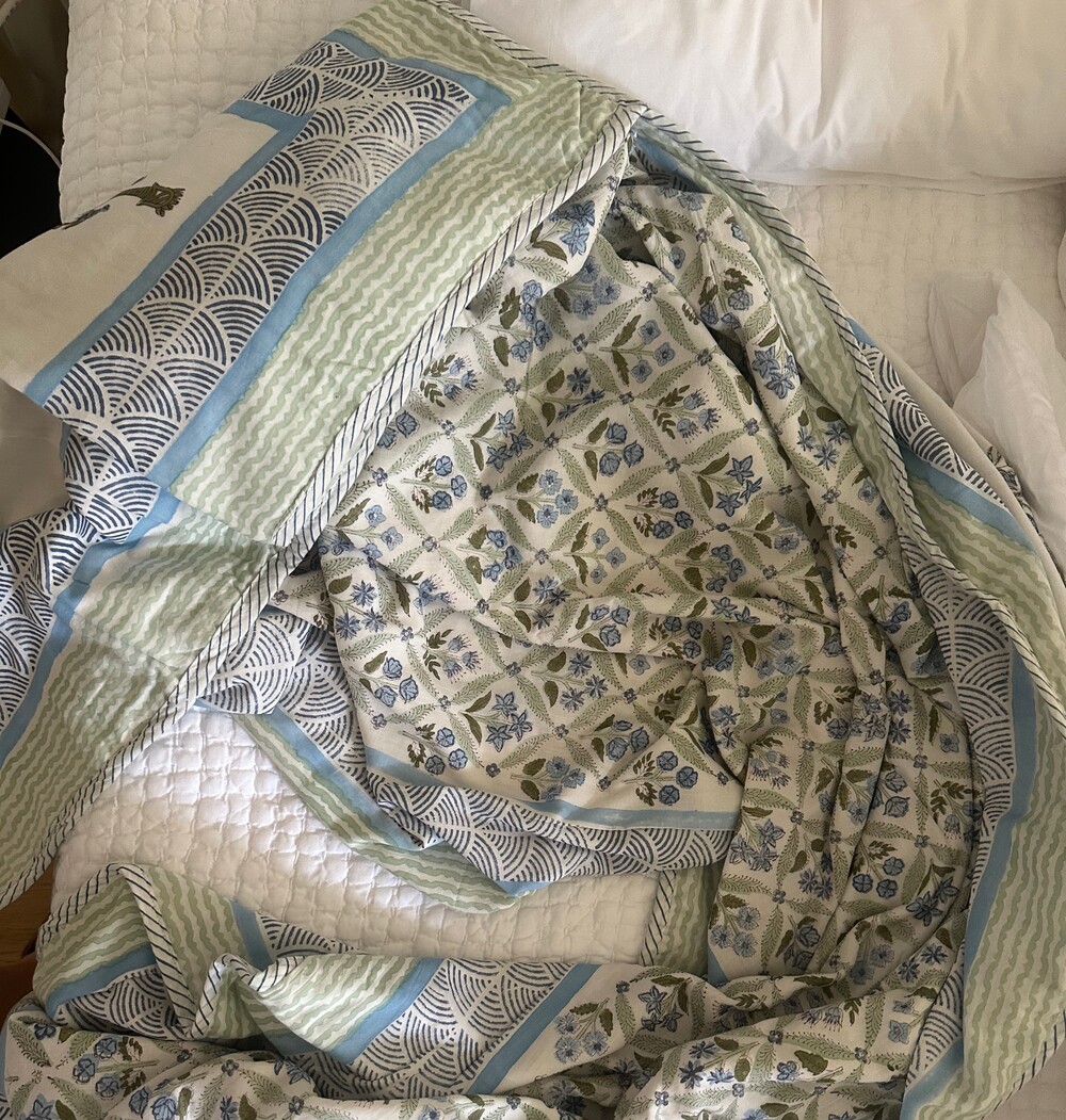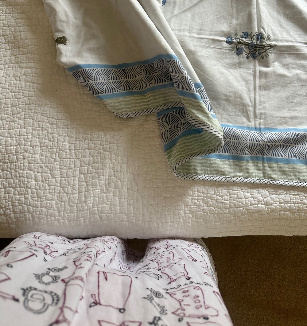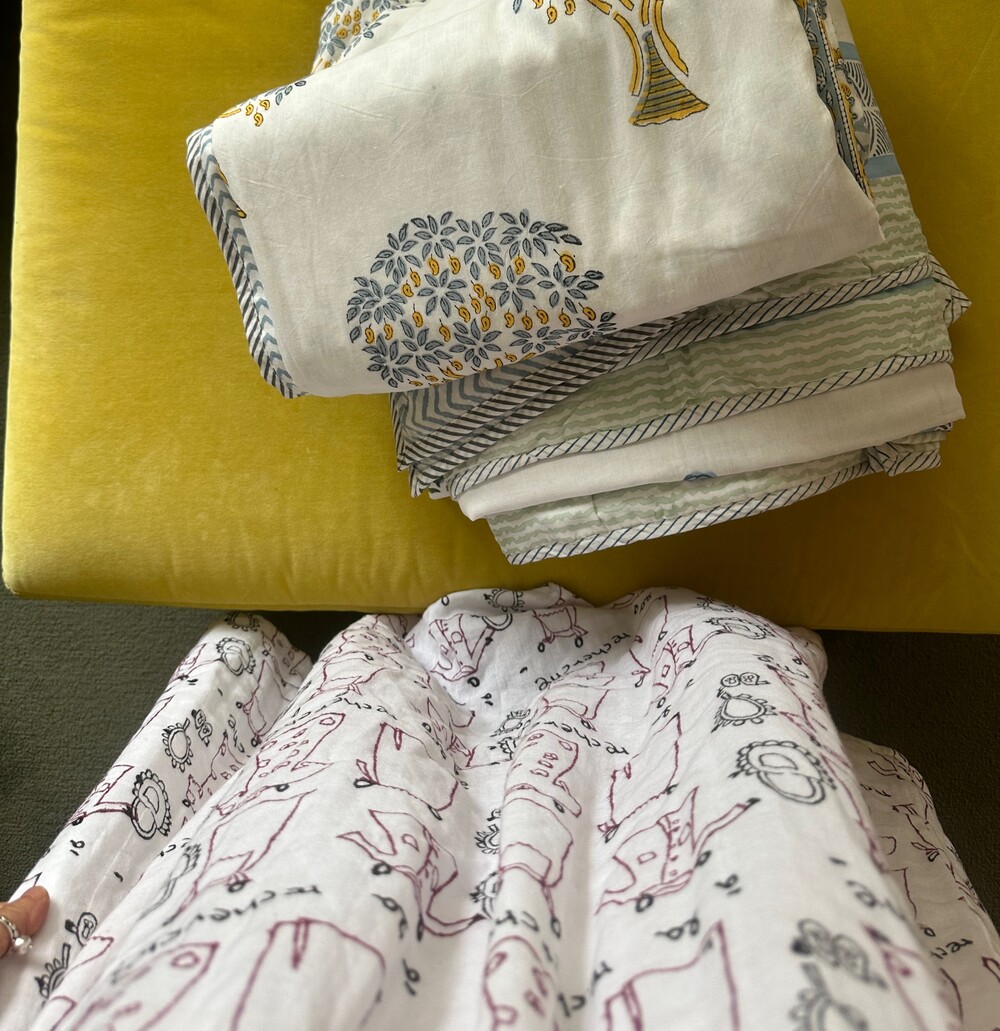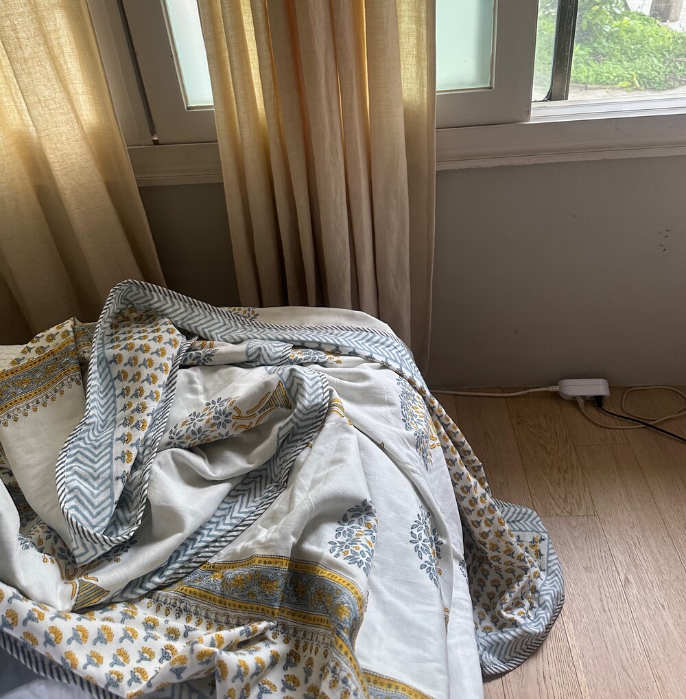 140*228 사이즈의 여름 이불이에요 인도에서는 에어컨이불이라고해요,습한여름의 청량감을 책임져줄 이불이에요 목화섬을 패드로 얇게 만들어 제작됩니다.초경량 이불이라고 생각하심되요 양면 사이에 아주 얇은 목화솜 시트가 들어가있어서 무게감이 일만큼 생기는 이불이에요, 오주뒤에 인도에서 발송됩니다,