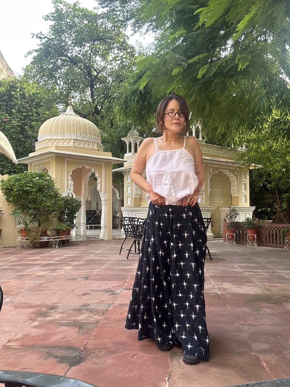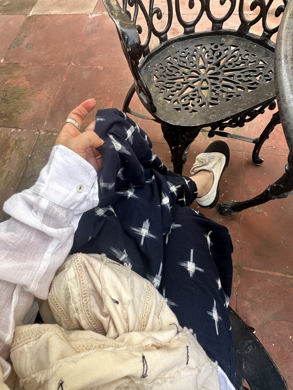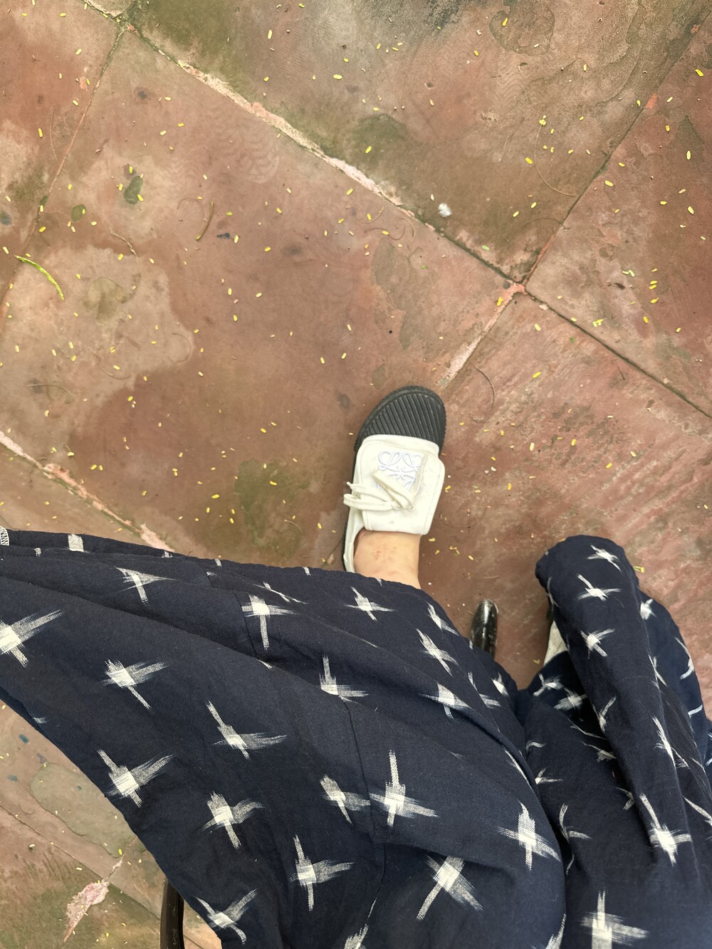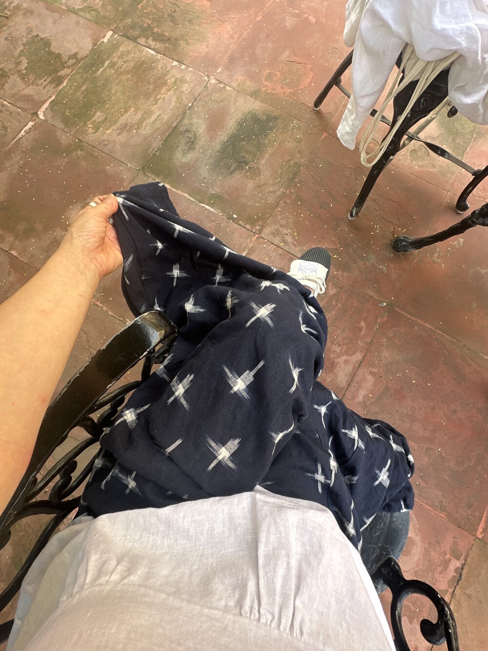 바지 한폭이 88cm이고 허리는 끈으로 조절이라 사이즈 상관없이 있으시고요 기장은 98이고 전 겨울에도 레깅스와 아주 잘입어요.ikat패턴의 직조이며 린넨과 면이 섞인 소재입니다.
