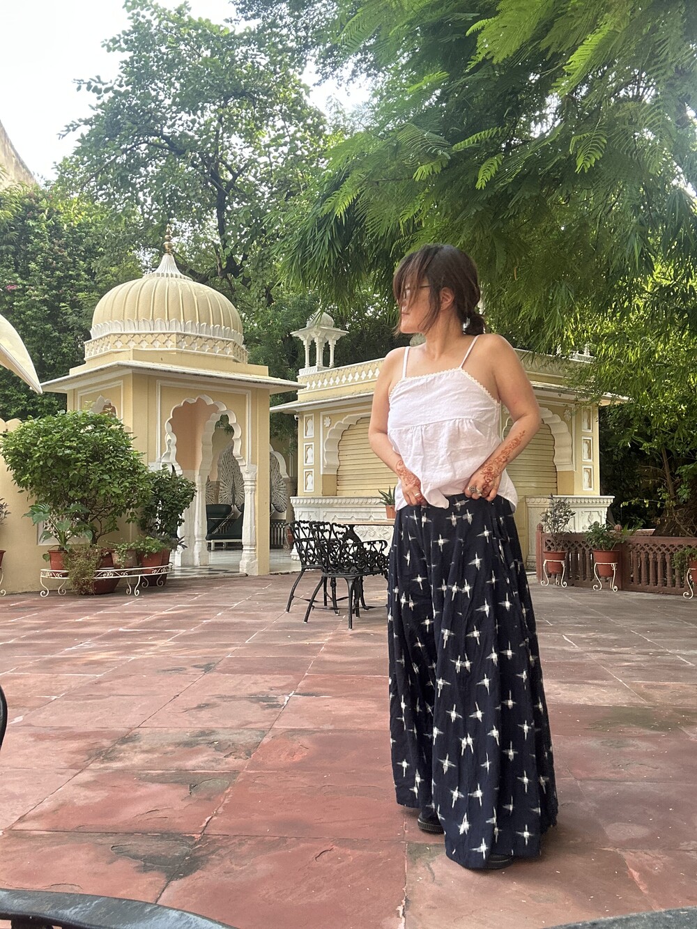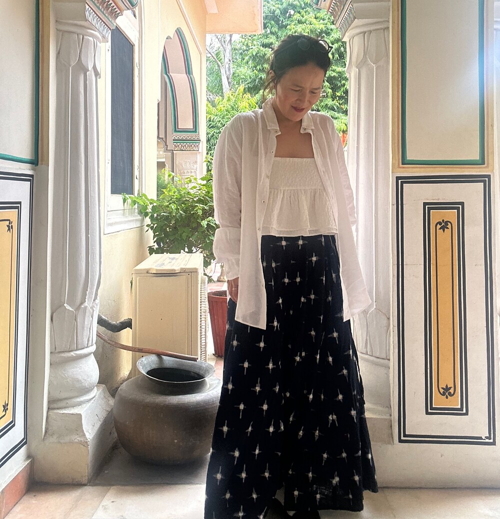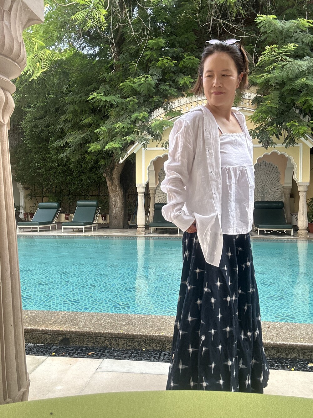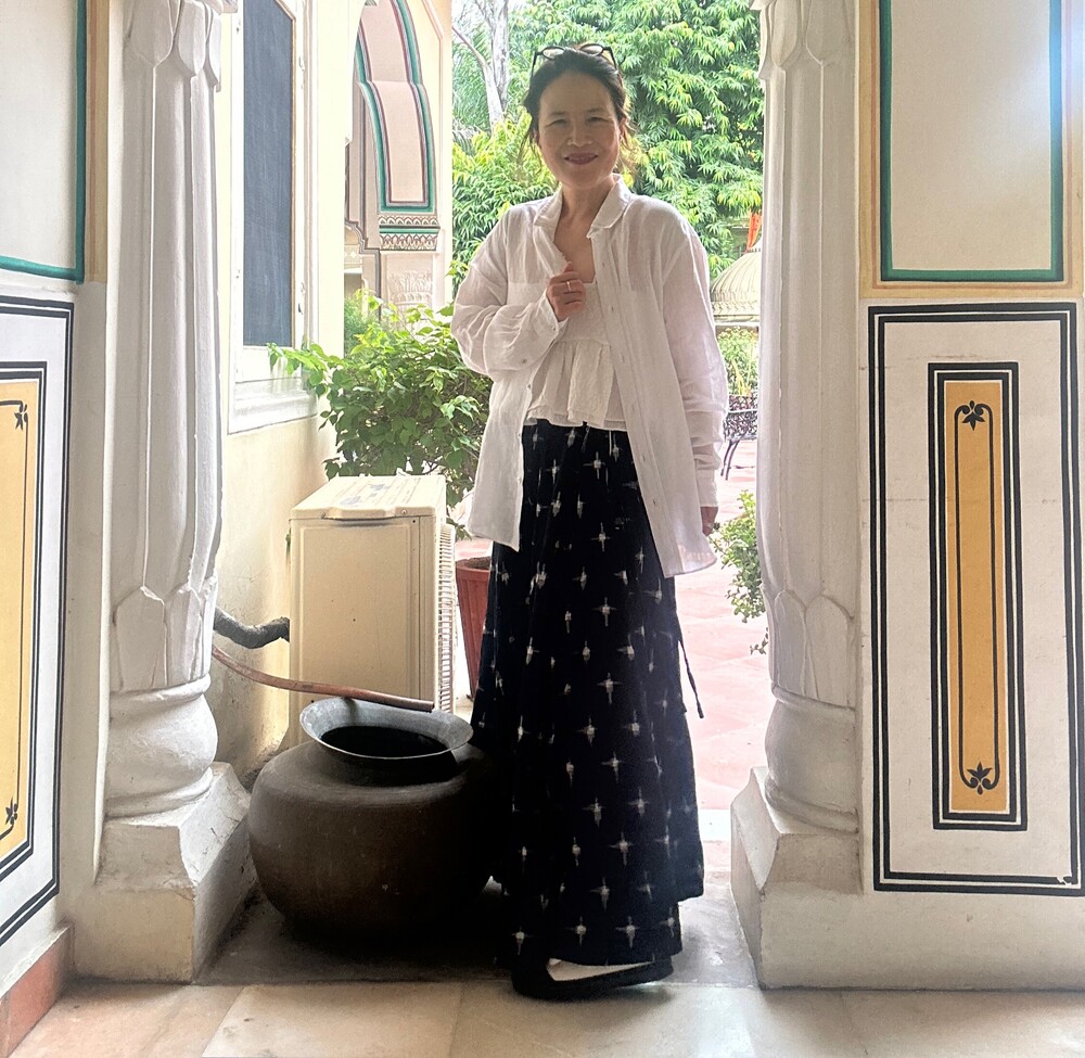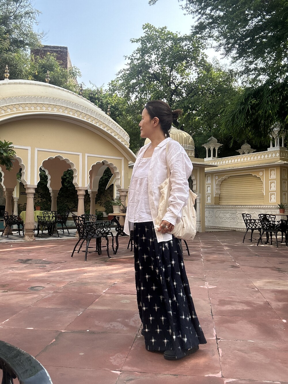 바지 한폭이 88cm이고 허리는 끈으로 조절이라 사이즈 상관없이 있으시고요 기장은 98이고 전 겨울에도 레깅스와 아주 잘입어요.ikat패턴의 직조이며 린넨과 면이 섞인 소재입니다.