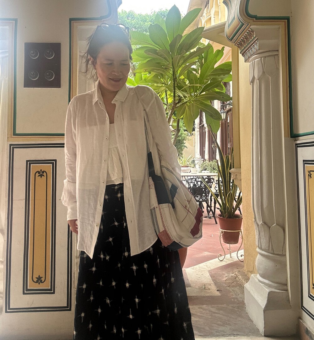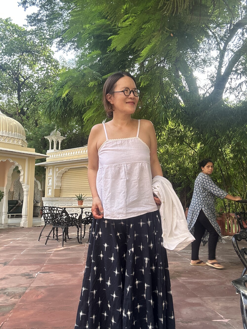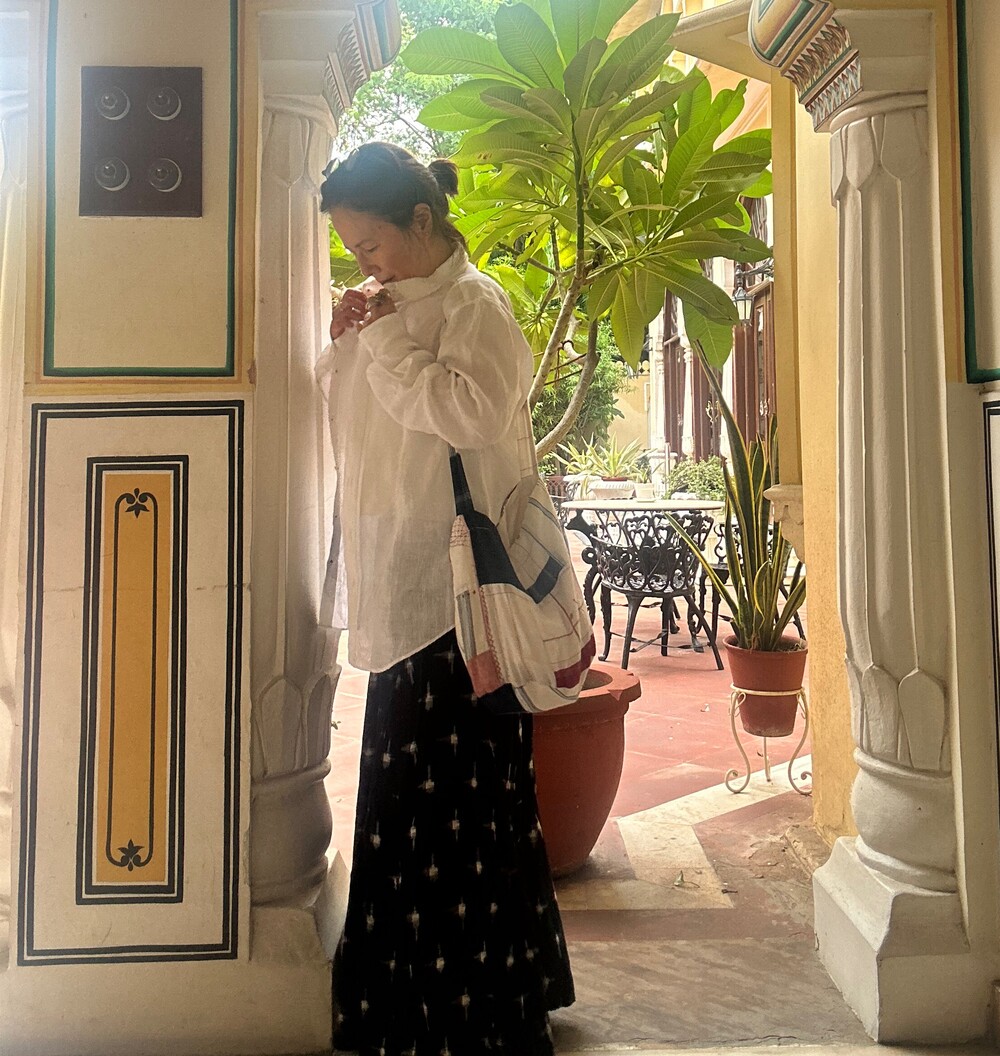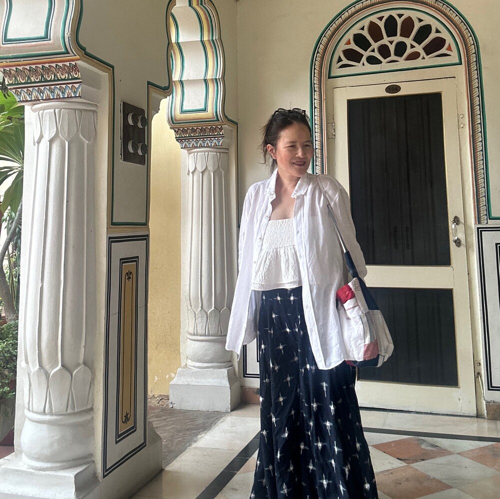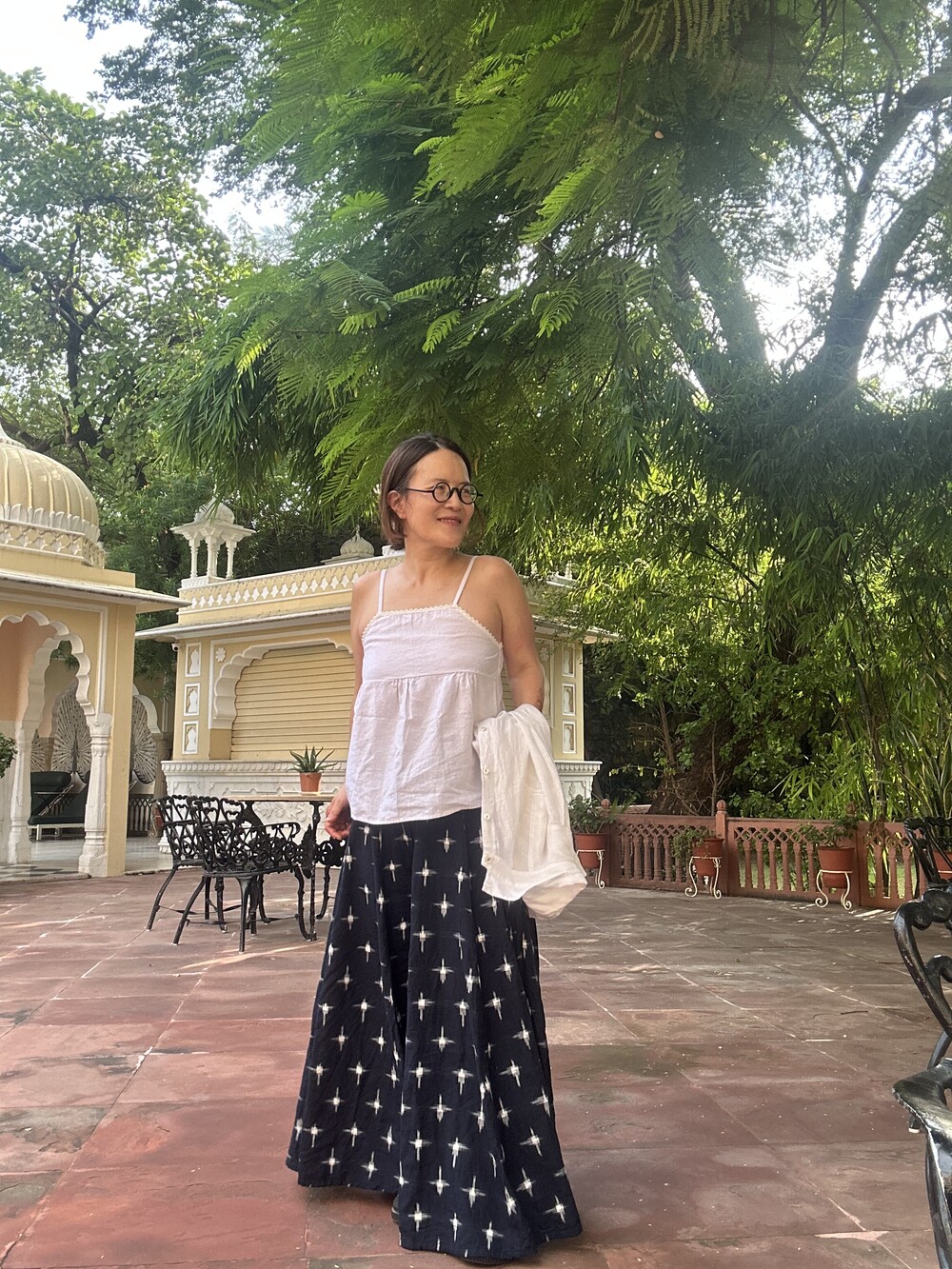 바지 한폭이 88cm이고 허리는 끈으로 조절이라 사이즈 상관없이 있으시고요 기장은 98이고 전 겨울에도 레깅스와 아주 잘입어요.ikat패턴의 직조이며 린넨과 면이 섞인 소재입니다.