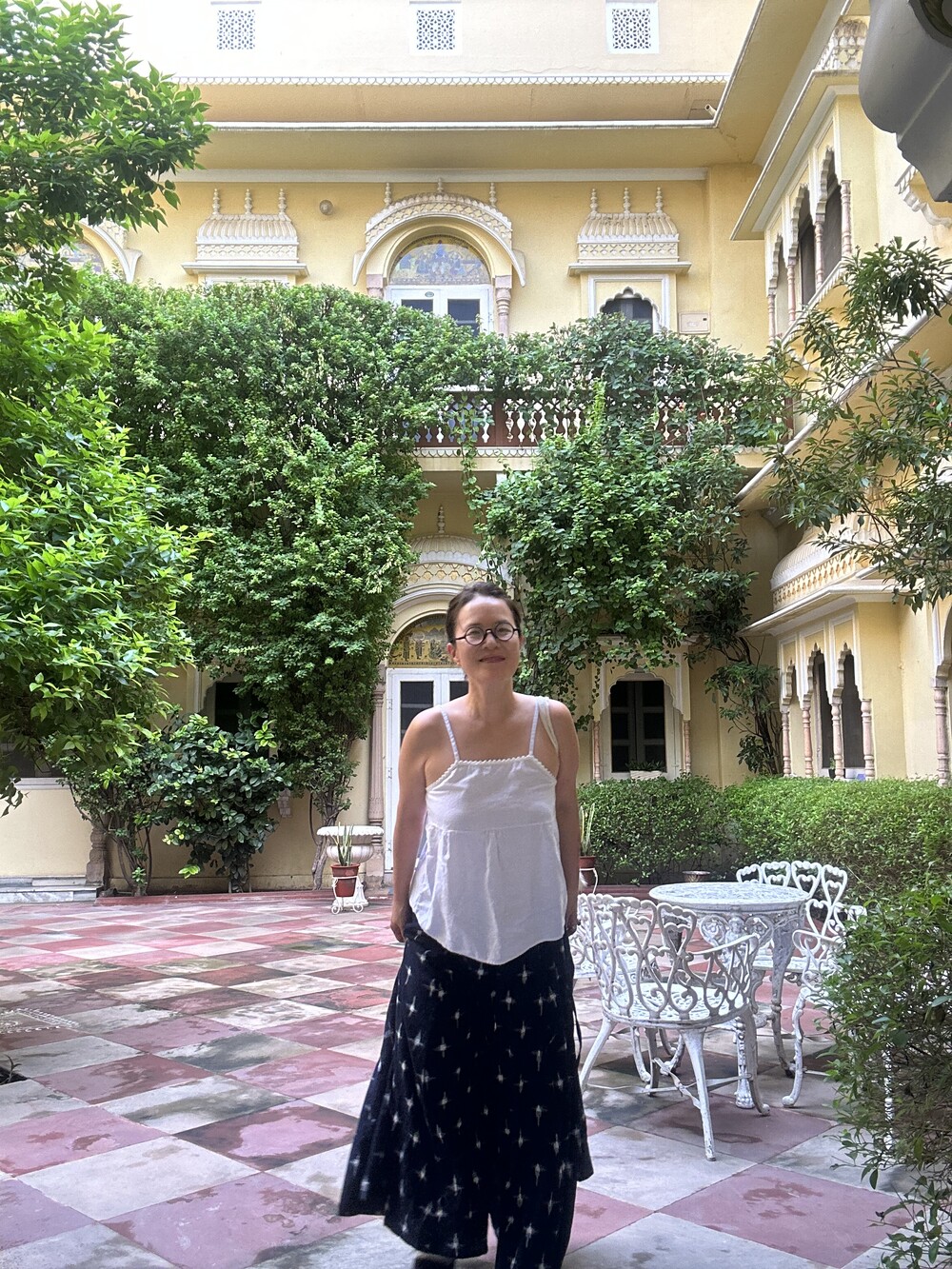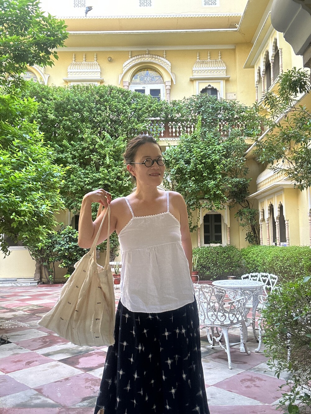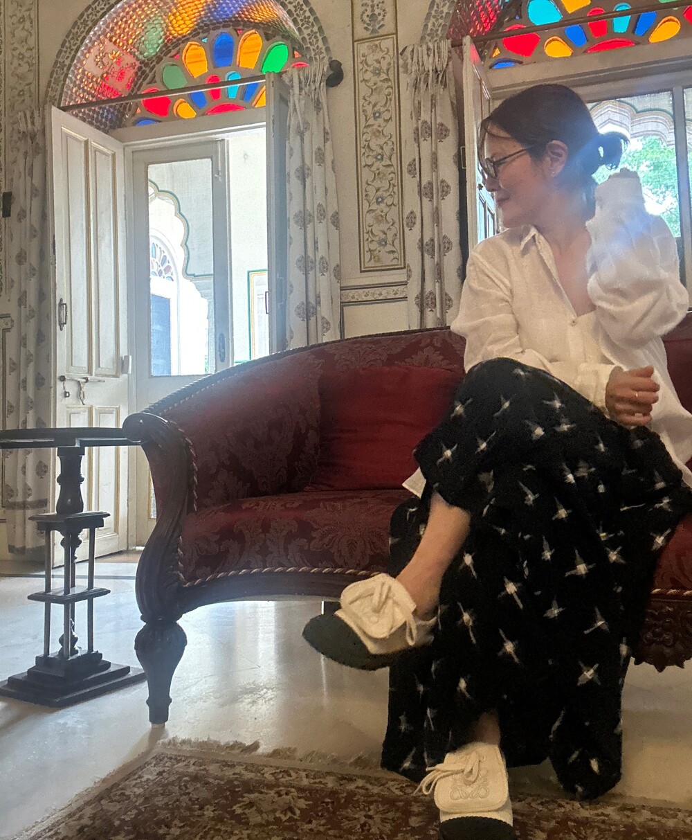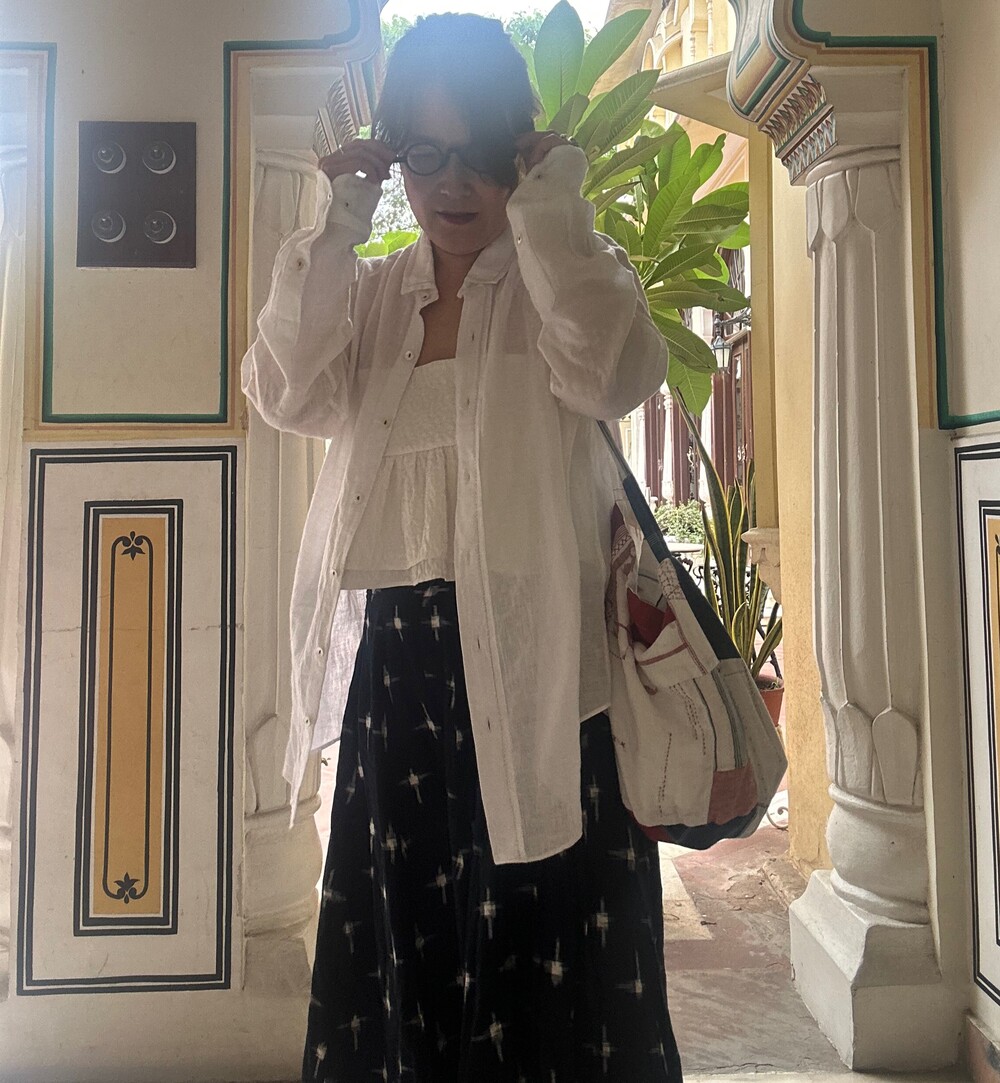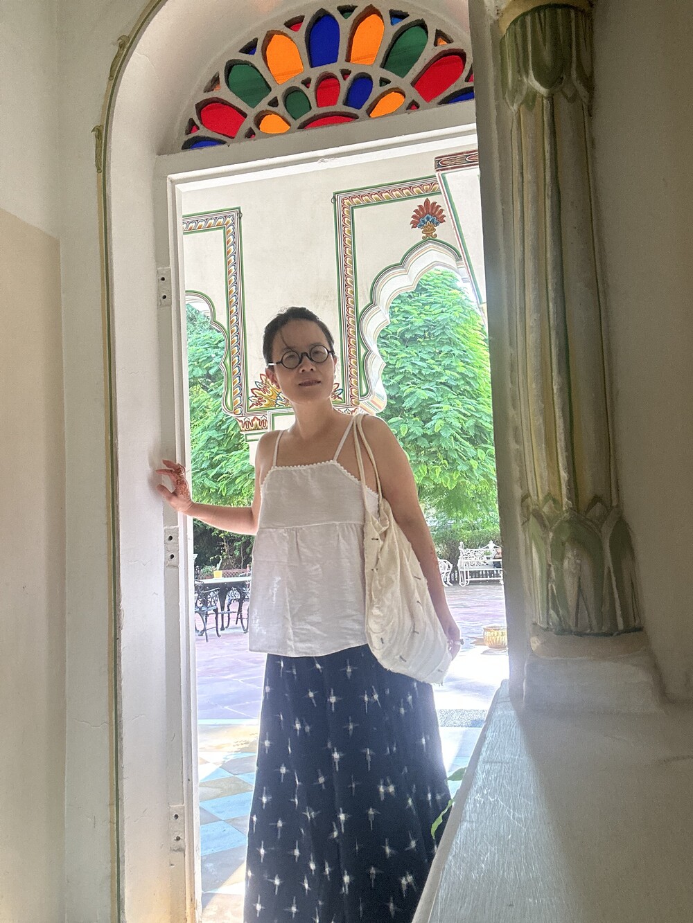 바지 한폭이 88cm이고 허리는 끈으로 조절이라 사이즈 상관없이 있으시고요 기장은 98이고 전 겨울에도 레깅스와 아주 잘입어요.ikat패턴의 직조이며 린넨과 면이 섞인 소재입니다.