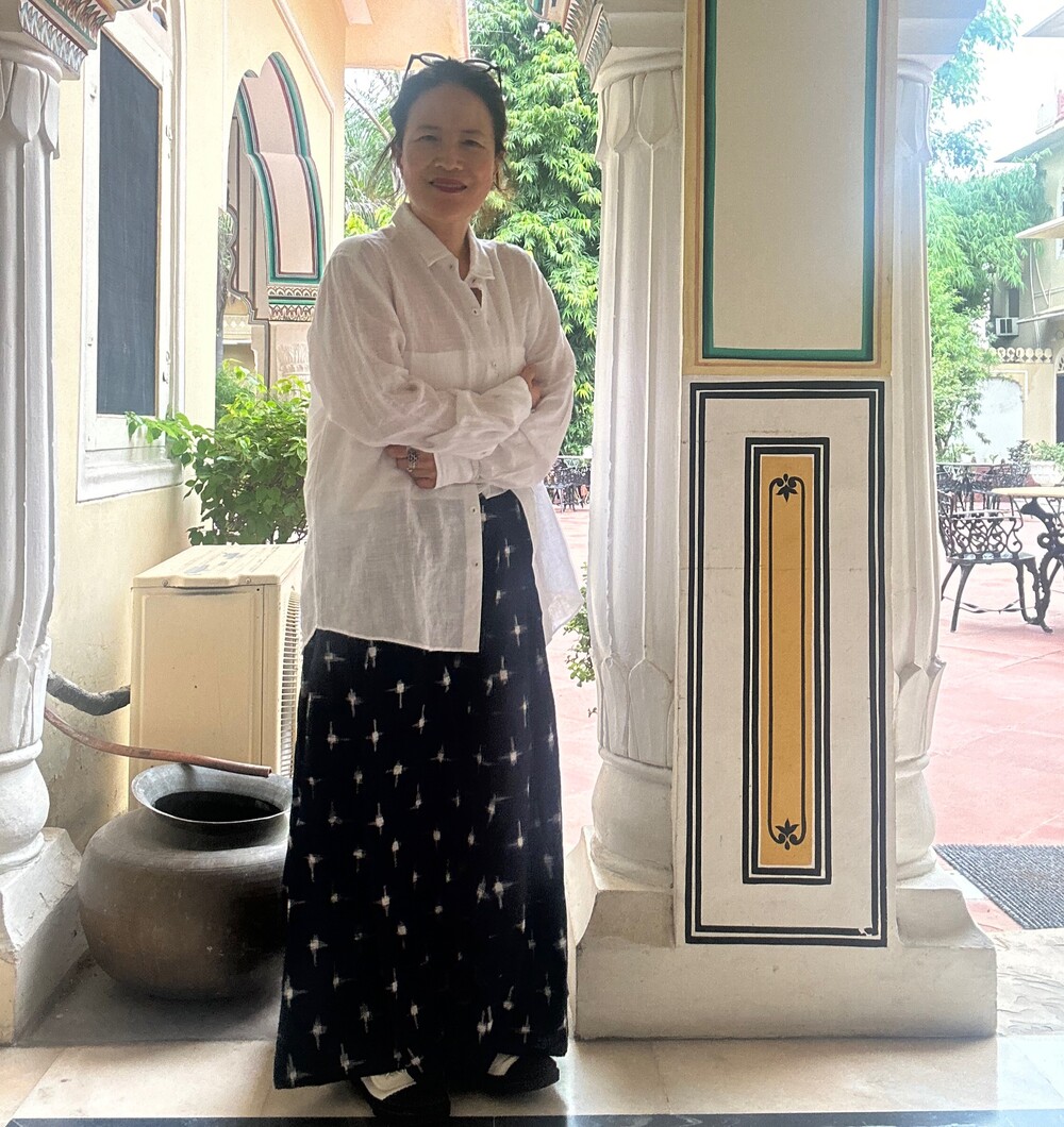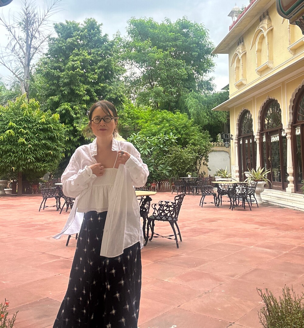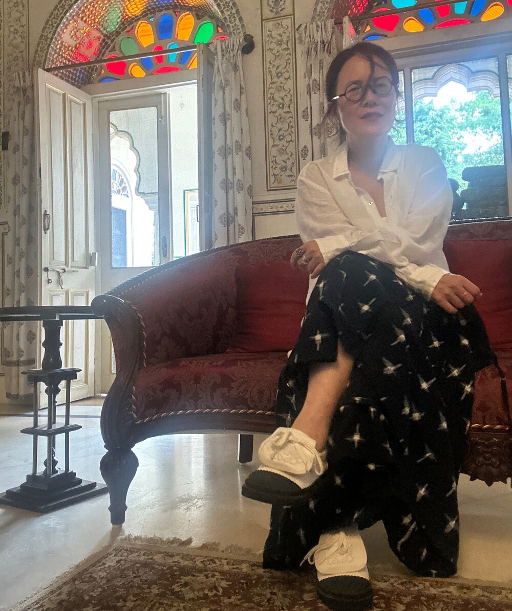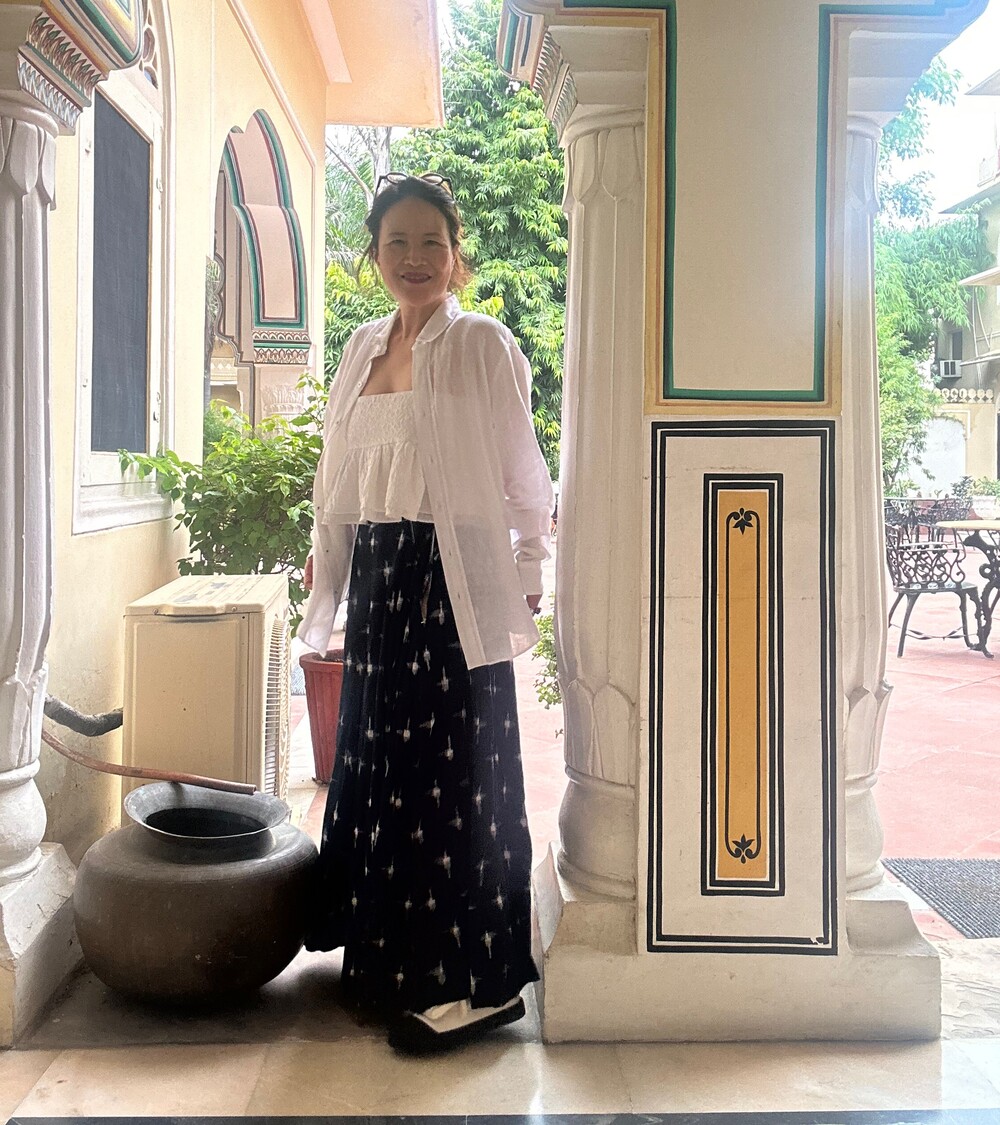 바지 한폭이 88cm이고 허리는 끈으로 조절이라 사이즈 상관없이 있으시고요 기장은 98이고 전 겨울에도 레깅스와 아주 잘입어요.ikat패턴의 직조이며 린넨과 면이 섞인 소재입니다.