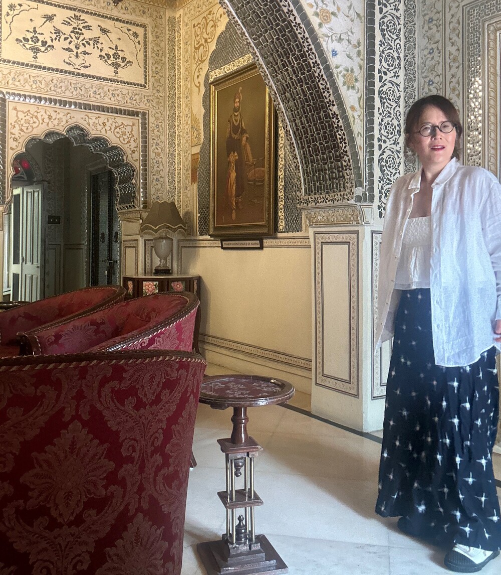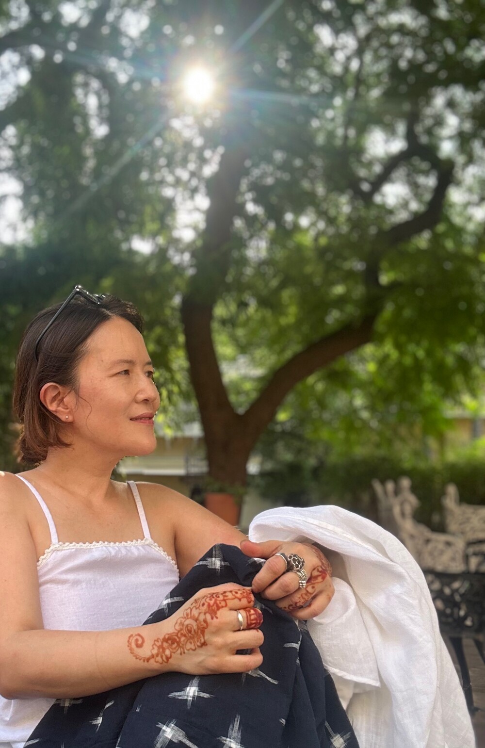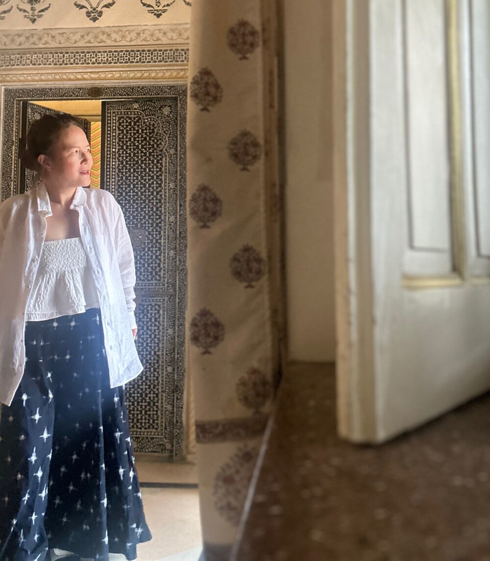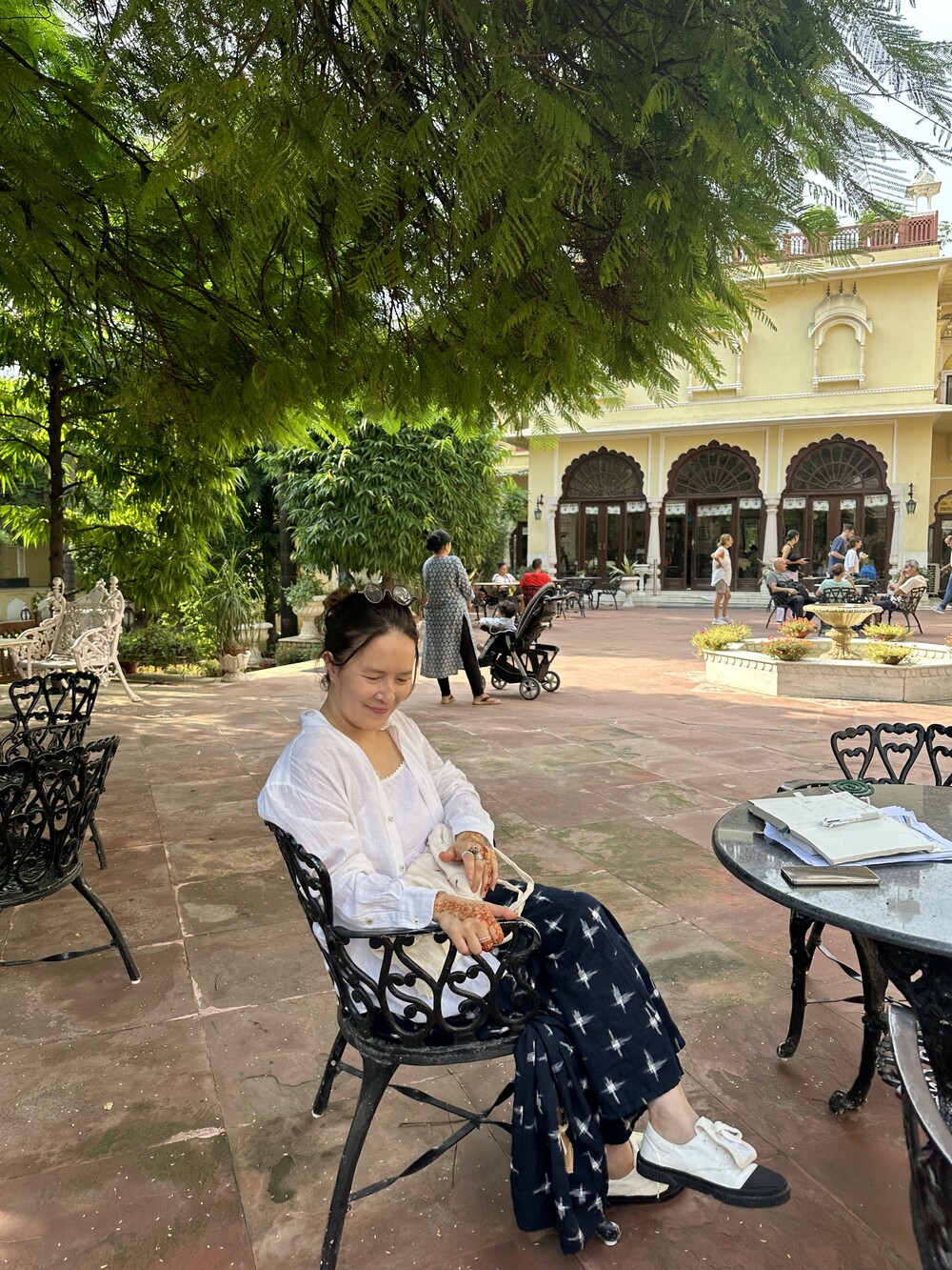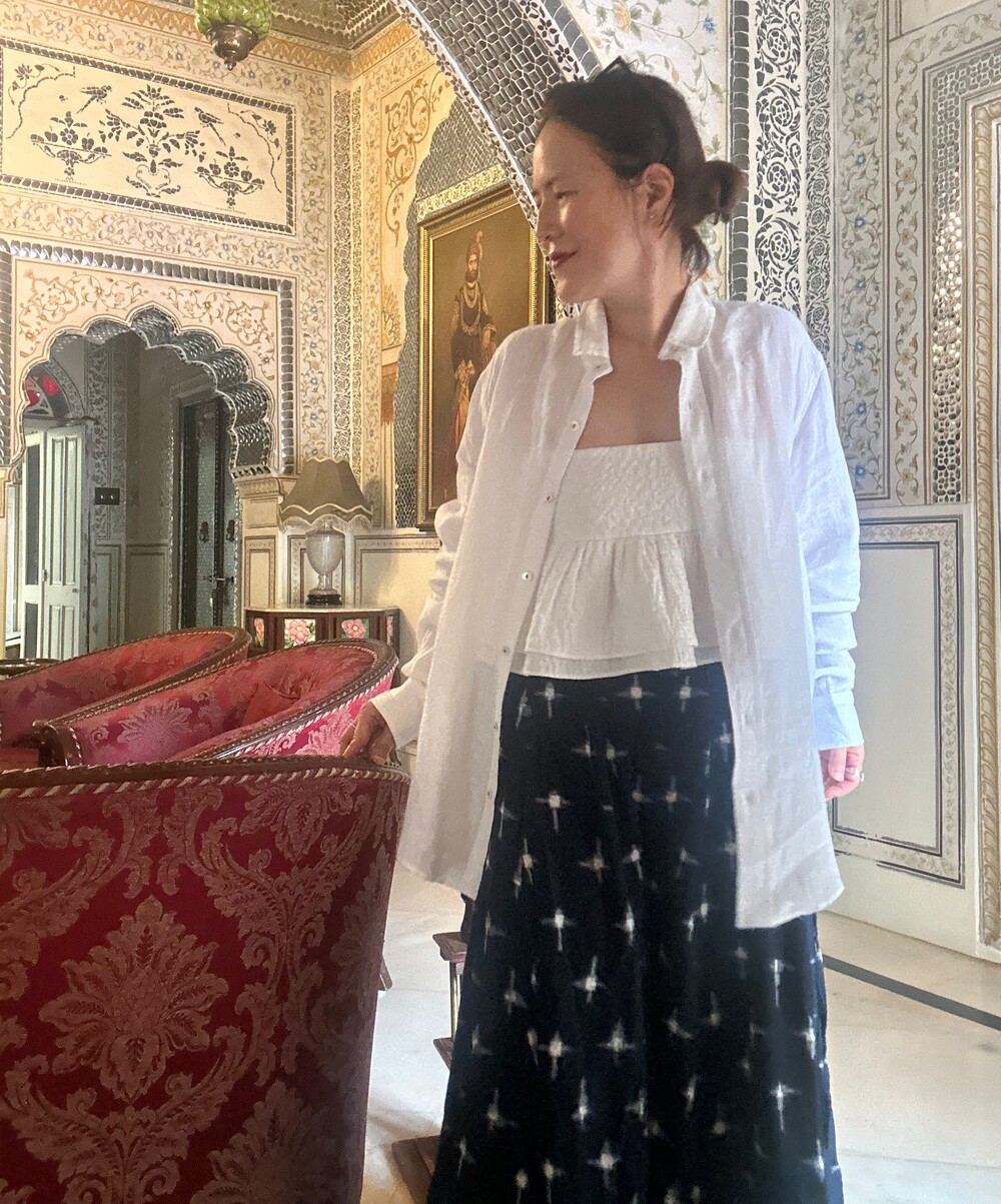 바지 한폭이 88cm이고 허리는 끈으로 조절이라 사이즈 상관없이 있으시고요 기장은 98이고 전 겨울에도 레깅스와 아주 잘입어요.ikat패턴의 직조이며 린넨과 면이 섞인 소재입니다.