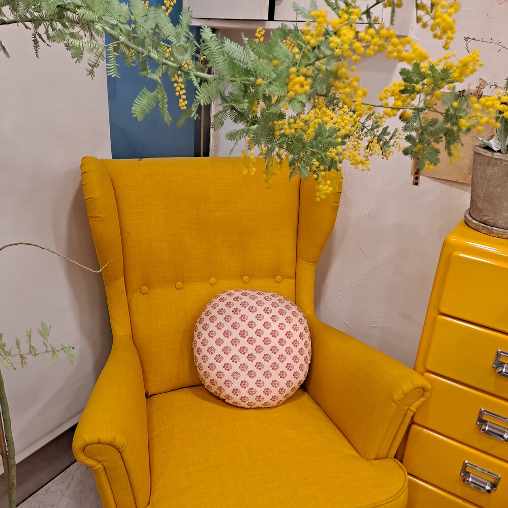 정말 사랑스러운 피치빛컬러에 귀여운 꽃들이 프린팅된 패브릭으로 만들어진 쿠션이에요 지름 40센티미터의 쿠션이고 솜은 포함되어있으며 커버 분리 세탁가능합니다.